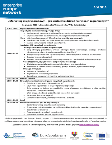 „Marketing międzynarodowy – jak skutecznie działać na rynkach zagranicznych” 14 grudnia 2016 r., Katowice, plac Wolności 12 a, Willa Goldsteinów 9.30 - 10.00 10.00 - 11.45 11.45 - 12.00 12.00 - 14.00 14.00 - 14.30 14.30 - 16.00 Rejestracja uczestników szkolenia Eksport jako możliwość rozwoju Twojej firmy:  Analiza pozycji konkurencyjnej Twojej firmy oraz jej możliwości eksportowych  Wyznaczanie celów eksportowych na poszczególnych rynkach docelowych Które rynki eksportowe wybrać? Metody wyboru rynków zagranicznych:  Jak skutecznie zbadać otoczenie biznesowe przedsiębiorstwa na rynkach docelowych  Analiza konkurencji na rynkach eksportowych Marketing MIX na rynkach zagranicznych: Strategia produktu na rynkach zagranicznych  Jaką strategię produktową wybrać (strategia lidera wzorniczego, strategia produktu skrojonego na miarę, strategia masowej kustomizacji itd.)?  Kiedy bardziej opłaca nam się standaryzować a kiedy adaptować produkty eksportowe?  Przykład skutecznej adaptacji  Postawy konsumentów wobec marek zagranicznych a charakter kulturalny danego kraju Cena eksportowa, czyli jak dobrać cenę do rynku docelowego  Metody wyznaczania korzyści cenowej dla nabywcy oraz dystrybutora  Możliwość w zakresie polityki rabatowej, polityki płatności, ryzyka eksportowego Strategia dystrybucji  Jak wybrać dystrybutora?  Wyznaczanie zadań dla dystrybutora  Zarządzanie kanałem dystrybucji na wybranych rynkach Przerwa kawowa Strategie komunikacji marketingowej na rynkach zagranicznych  Różnice w pozyskiwaniu klientów B2B a B2C  Czym różni się promocja w kraju od promocji zagranicą?  Style reklamy na świecie na przykładzie rynku włoskiego, brytyjskiego, a także rynków azjatyckich i Europy Wschodniej  Efekt kraju pochodzenia- produkt polski vs. produkt europejski  Jak wypaść dobrze na targach?  Działania w zakresie PR, promocji dodatkowej i osobistej Lunch Reklama XXI wieku na rynkach zagranicznych  Content marketing, Visual Content marketing  Strona www - nie wizytówka a narzędzie pozyskiwania klientów na rynkach zagranicznych  Social media w eksporcie  Pozycjonowanie na rynkach zagranicznych  Budowanie marki na rynkach zagranicznych Szkolenie poprowadzi pan Grzegorz Bratek, ekspert z 15 letnim doświadczeniem we wprowadzaniu marek polskich na rynki zagraniczne oraz konsultingu międzynarodowym, prowadzeniu szkoleń z eksportu oraz handlu w Polsce i za granicą. Zgłoszenia udziału w szkoleniu prosimy nadsyłać do 9 grudnia 2016 r. poprzez formularz internetowy.
