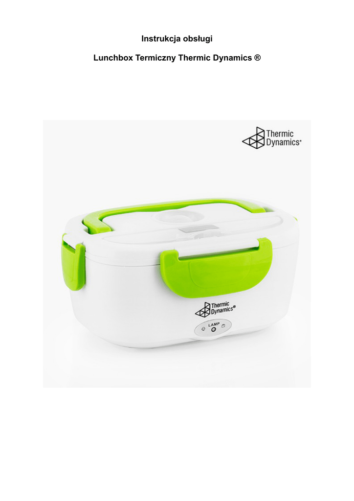 Instrukcja obsługi Lunchbox Termiczny Thermic Dynamics ® Specyfikacja techniczna: • pojemność: 1,05 l, • moc: 40 W, • napięcie: 220 V, • częstotliwość: 50/60 Hz, • wykonany z plastiku przeznaczonego do przechowywania żwyności. Instrukcja obsługi: 1. Umieścić jedzenie w lunchboxie. 2. Zamknąć pokrywę. 3. Otworzyć zawór wylotowy pary, który znajduje się na środku pokrywy i podłączyć kabel. 4. Po podłączeniu urządzenia do zasilania zaświeci się kontrolka wskazująca, że lunchbox rozpoczął podgrzewanie posiłku. Uwagi: 1. Przed podłączeniem urządzenia należy upewnić się, że napięcie w gniazdku jest kompatybilne z specyfikacja techniczną. 2. Nie używać urządzenia z uszkodzonymi elementami, które wymagają naprawy przez specjalistów. 3. Nie zanurzać urządzenia w cieczach. 4. Otworzyć zawór wylotowy pary przed włączeniem urządzenia. 5. Odłączyć urządzenie po użyciu i przed czyszczeniem. 6. Po użyciu środek lunchboxa należy czyścić za pomocą wilgotnej szmatki. Nie używać środków ścierających oraz myjek. 7. Odłączyć urządzenie od prądu w przypadku, gdy posiłek jest spożywany bezpośrednio z lunchboxa. 8. Nie używać urządzenia w pobliżu źródła ciepła. 9. Urządzenie powinno być użytkowane tylko pod nadzorem osoby dorosłej. 10. Czas ogrzewania posiłku zależny jest od podgrzewanego produktu. 11. Jeśli podgrzewany jest ryż, zaleca się dodanie niewielkiej ilości wody przed włączeniem urządzenia. 12. Urządzenie nie jest przystosowane do używania w kuchence mikrofalowej oraz zamrażarce. 13. Urządzenie włączać tylko i wyłącznie z zawartością. 14. Nie używać urządzenia do podgrzewania substancji łatwopalnych. 15. Przechowywać w suchym i czystym miejscu z dobrą wentylacją. 16. Pod koniec żywotności urządzenia, zutylizować je w sposób przyjazny dla środowiska.