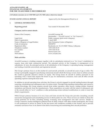 AVIAAM LEASING AB FINANCIAL STATEMENTS FOR THE YEAR ENDED 31 DECEMBER 2013 (All tabular amounts are in USD‘000 and LTL‘000 unless otherwise stated) STAND-‐‑ALONE ANNUAL REPORT Approved by the Management Board as at 2014 I. GENERAL INFORMATION Reporting period Year ended 31 December 2013 Company and its contact details Name of the Company AviaAM Leasing AB (hereinafter – “AviaAM Leasing” or “the Company”) Legal form Public company (joint-‐‑stock company) Date of registration 6 April 2009 Name of Register of Legal Entities State Enterprise Centre of Registers Code of enterprise 302330793 Registered office Smolensko str. 10, LT-‐‑03201 Vilnius, Lithuania Telephone number +370 5 252 55 25 Fax number +370 5 252 55 24 E-‐‑mail [email protected] Web address www.aviaam.com Main activities AviaAM Leasing is a holding company together with its subsidiaries (referred to as “the Group”) established to acquire, lease and trade commercial aircraft. The principal activity of the Company is management of its subsidiaries. In turn, the principal activity of all subsidiaries of the Company is operating leasing, management and trading of mid-‐‑life narrowbody and regional jet aircraft. The Group’s primary focus is on the market for used aircraft, primarily on aircraft ten years of age or older. The Group is principally engaged in purchasing commercial aircraft which the Group, in turn, lease to airlines around the world to generate attractive returns on equity. The Group leases its aircraft to airlines pursuant to net operating (“dry”) leases that require the lessee to pay for maintenance, insurance, taxes and all other aircraft operating expenses during the lease term. In addition to aircraft operating lease activities, the Group is actively engaged in aircraft trading business through acquiring, refurbishing and subsequent sale of aviation assets. Through long-‐‑standing relationships and extensive market knowledge, the Group acquires aircraft from airline operators, other lessors, trading entities, financial institutions and directly from the manufacturers. These acquisitions are made with the intent of subsequent sale of the aircraft either in “as-‐‑is” condition or after performing certain technical modifications in order to meet the client’s requirements. While Group’s primary business is to own, lease and trade aircraft, the Group also provides consulting, aircraft transaction management and remarketing services to third parties for a fee. These services are similar to those the Group performs for its fleet, including leasing, re-‐‑leasing, lease management and sales services. Thanks to Group’s extensive market intelligence gathered from its daily contacts with other market participants, the Group is well positioned to advise its clients on the best terms and conditions available in the market, and to provide assistance and know-‐‑how to its clients in the field of structuring and maintaining their aircraft portfolios. 44 AVIAAM LEASING AB FINANCIAL STATEMENTS FOR THE YEAR ENDED 31 DECEMBER 2013 (All tabular amounts are in USD‘000 and LTL‘000 unless otherwise stated) Subsidiaries As at 31 December 2013 the Company directly and indirectly owned the following subsidiaries: Name of the company Date of registration, code, name of Register of Legal Entities AviaAM B01 UAB Date of acquiring: 4 January 2010 Company code: 125808161 Register of Legal Persons Date of acquiring: 4 January 2010 Company code: 300618156 Register of Legal Persons Date of acquiring: 22 January 2010 Company code: 300887740 Register of Legal Persons Date of establishment: 22 February 2007 Company code: 300651619 Register of Legal Persons Date of establishment: 28 June 2011 Company code: 302642412 Register of Legal Persons Date of establishment: 15 July 2011 Company code: 302647509 Register of Legal Persons Date of establishment: 30 September 2011 Company code: 302671887 Register of Legal Persons Date of establishment: 29 September 2011 Company code: HE294651 Cyprus Registrar of Companies Date of establishment: 16 September 2011 Company code: 45778 Registrar of Companies of Bermuda Date of establishment: 26 April 2013 Company code: 47627 Registrar of Companies of Bermuda Date of establishment: 27 June 2013 Company code: 47868 Registrar of Companies of Bermuda Date of establishment: 23 October 2013 Company code: 48281 Registrar of Companies of Bermuda Date of acquiring: 20 December 2013 Company code: 522844 Irish Companies Registration Office AviaAM B02 UAB AviaAM B03 UAB AviaAM B04 UAB AviaAM B05 UAB AviaAM B06 UAB AviaAM B07 UAB AAL Capital Aircraft Holdings Ltd. AviaAM Leasing Bermuda Ltd. AviaAM B08 Ltd. AviaAM B09 Ltd. Ice Aircraft Management Ltd. Boulevard Two Aircraft Ltd. Contact details Smolensko str. 10, LT-‐‑03201 Vilnius, LITHUANIA, Smolensko str. 10, LT-‐‑03201 Vilnius, LITHUANIA, Smolensko str. 10, LT-‐‑03201 Vilnius, LITHUANIA, Smolensko str. 10, LT-‐‑03201 Vilnius, LITHUANIA, Smolensko str. 10, LT-‐‑03201 Vilnius, LITHUANIA, Smolensko str. 10, LT-‐‑03201 Vilnius, LITHUANIA, Smolensko str. 10, LT-‐‑03201 Vilnius, LITHUANIA, Demetriou Karatasou 15, Anastasio Building, Strovolos, 2024 Nicosia, CYPRUS Clarendon House, 2 Church Street, Hamilton HM 11, BERMUDA Effective holding of the Company (%) 100.00 100.00 100.00 100.00 100.00 100.00 100.00 100.00 100.00* Crawford House, 50 Cedar Avenue, Hamilton HM11, BERMUDA 100.00* Crawford House, 50 Cedar Avenue, Hamilton HM 11, BERMUDA 100.00* Crawford House, 50 Cedar Avenue, Hamilton HM 11, BERMUDA 100.00* 70 Sir John Rogerson’s Quay, Dublin 2, IRELAND 100.00* * Shareholding through AAL Capital Aircraft Holdings Ltd which owns 100 per cent of the company. As at 31 December 2013 the Company had no branches or representative offices. 45 AVIAAM LEASING AB FINANCIAL STATEMENTS FOR THE YEAR ENDED 31 DECEMBER 2013 (All tabular amounts are in USD‘000 and LTL‘000 unless otherwise stat