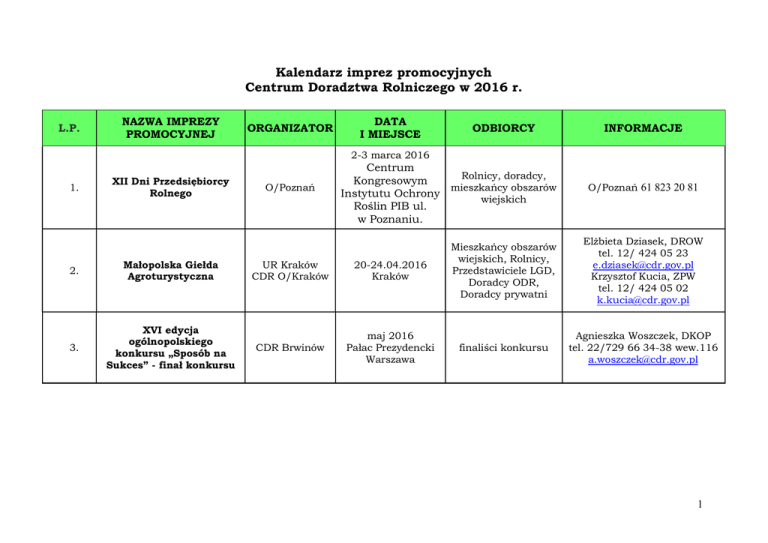 Kalendarz imprez promocyjnych Centrum Doradztwa Rolniczego w 2016 r. L.P. 1. NAZWA IMPREZY PROMOCYJNEJ XII Dni Przedsiębiorcy Rolnego ORGANIZATOR DATA I MIEJSCE ODBIORCY INFORMACJE 2-3 marca 2016 O/Poznań Centrum Rolnicy, doradcy, Kongresowym mieszkańcy obszarów Instytutu Ochrony wiejskich Roślin PIB ul. w Poznaniu. 2. Małopolska Giełda Agroturystyczna UR Kraków CDR O/Kraków 20-24.04.2016 Kraków Mieszkańcy obszarów wiejskich, Rolnicy, Przedstawiciele LGD, Doradcy ODR, Doradcy prywatni 3. XVI edycja ogólnopolskiego konkursu „Sposób na Sukces” - finał konkursu CDR Brwinów maj 2016 Pałac Prezydencki Warszawa finaliści konkursu O/Poznań 61 823 20 81 Elżbieta Dziasek, DROW tel. 12/ 424 05 23 [email protected] Krzysztof Kucia, ZPW tel. 12/ 424 05 02 [email protected] Agnieszka Woszczek, DKOP tel. 22/729 66 34-38 wew.116 [email protected] 1 L.P. 4. 5. 6. NAZWA IMPREZY PROMOCYJNEJ ORGANIZATOR UR Kraków III Małopolskie Targi CDR O/Kraków – Żywności – Zasmakuj z UR partner IX Małopolskie Święto Warzyw X Święto Ziemniaka Gmina Igołomnia – Wawrzeńczyce Gmina Trzyciąż DATA I MIEJSCE ODBIORCY INFORMACJE III kwartał Kraków - Mydlniki Mieszkańcy obszarów wiejskich, Rolnicy, Przedstawiciele LGD, Doradcy ODR, Doradcy prywatni Krzysztof Kucia, ZPW tel. 12/ 424 05 02 [email protected] Klaudia Kieljan, DROW tel. 12/ 424 05 13 [email protected] Mieszkańcy obszarów wiejskich, Rolnicy, Przedstawiciele LGD, Doradcy ODR, Doradcy prywatni Krzysztof Kucia, ZPW tel. 12/ 424 05 02 [email protected] Joachim Kempka, SPR tel. 12/ 424 05 07 [email protected] Michał Wnęk, DROW tel. 12/ 424 05 25 [email protected] Mieszkańcy obszarów wiejskich, Rolnicy, Przedstawiciele LGD, Doradcy ODR, Doradcy prywatni Krzysztof Kucia, ZPW tel. 12/ 424 05 02 [email protected] Joachim Kempka, SPR tel. 12/ 424 05 07 [email protected] Mateusz Grojec, DROW tel. 12/ 424 05 25 [email protected] III kwartał Gmina Igołomnia – Wawrzeńczyce III kwartał Gmina Trzyciąż 2 L.P. NAZWA IMPREZY PROMOCYJNEJ ORGANIZATOR XXII Charsznickie Dni Kapusty Gmina Charsznica 8. XXV Krajowa Wystawa Rolnicza, Dożynki Jasnogórskie 9. Ogłoszenie wyników konkursu pn. „Najlepsze wydawnictwo ośrodków doradztwa rolniczego” Śląski Ośrodek Doradztwa Rolniczego w Częstochowie, Urząd Miasta Częstochowy, Samorząd Województwa Śląskiego 7. 10. XIII Rolniczy Festiwal Nauki CDR O/Poznań CDR Brwinów CBR Warszawa DATA I MIEJSCE ODBIORCY INFORMACJE III kwartał Gmina Charsznica Mieszkańcy obszarów wiejskich, Rolnicy, Przedstawiciele LGD, Doradcy ODR, Doradcy prywatni Krzysztof Kucia, ZPW tel. 12/ 424 05 02 [email protected] Waldemar Gorajczyk, DROW tel. 12/ 424 05 20 [email protected] Mieszkańcy obszarów wiejskich, Rolnicy, Przedstawiciele LGD, Doradcy ODR, Doradcy prywatni Krzysztof Kucia, ZPW tel. 12/ 424 05 02 [email protected] Łukasz Jawny, DROW tel. 12/ 424 05 20 [email protected] Joachim Kempka, SPR tel. 12/ 424 05 07 [email protected] 2-4.09.2016 Częstochowa 20.09.2016 CDR O/Poznań doradcy Adrianna Bolewicz-Tatka, DPiW tel. 61/ 823 20 81 w.134 [email protected] 20-21.10.2016 CDR w Brwinowie CBR w Warszawie jednostki badawczo-rozwojowe, jednostki doradztwa rolniczego, uczelnie rolnicze, szkoły i placówki oświatowe Justyna Zdunek, DMIKD tel. 22/729 66 34-38 wew.107 [email protected] fax. 22/729 72 91 3