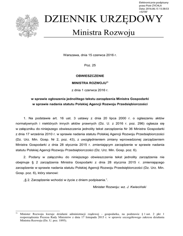 Elektronicznie podpisany przez Piotr ZYCHLA Data: 2016.06.15 15:38:53 +02'00' DZIENNIK URZĘDOWY Ministra Rozwoju Warszawa, dnia 15 czerwca 2016 r. Poz. 25 OBWIESZCZENIE MINISTRA ROZWOJU1) z dnia 1 czerwca 2016 r. w sprawie ogłoszenia jednolitego tekstu zarządzenia Ministra Gospodarki w sprawie nadania statutu Polskiej Agencji Rozwoju Przedsiębiorczości 1. Na podstawie art. 16 ust. 3 ustawy z dnia 20 lipca 2000 r. o ogłaszaniu aktów normatywnych i niektórych innych aktów prawnych (Dz. U. z 2016 r. poz. 296) ogłasza się w załączniku do niniejszego obwieszczenia jednolity tekst zarządzenia Nr 36 Ministra Gospodarki z dnia 17 września 2010 r. w sprawie nadania statutu Polskiej Agencji Rozwoju Przedsiębiorczości (Dz. Urz. Min. Gosp. Nr 2, poz. 43), z uwzględnieniem zmiany wprowadzonej zarządzeniem Ministra Gospodarki z dnia 28 stycznia 2015 r. zmieniającym zarządzenie w sprawie nadania statutu Polskiej Agencji Rozwoju Przedsiębiorczości (Dz. Urz. Min. Gosp. poz. 6). 2. Podany w załączniku do niniejszego obwieszczenia tekst jednolity zarządzenia nie obejmuje § 2 zarządzenia Ministra Gospodarki z dnia 28 stycznia 2015 r. zmieniającego zarządzenie w sprawie nadania statutu Polskiej Agencji Rozwoju Przedsiębiorczości (Dz. Urz. Min. Gosp. poz. 6), który stanowi: „§ 2. Zarządzenie wchodzi w życie z dniem podpisania.”. Minister Rozwoju: wz. J. Kwieciński 1) Minister Rozwoju kieruje działami administracji rządowej - gospodarka, na podstawie § 1 ust. 2 pkt 1 rozporządzenia Prezesa Rady Ministrów z dnia 17 listopada 2015 r. w sprawie szczegółowego zakresu działania Ministra Rozwoju (Dz. U. poz. 1895). Dziennik Urzędowy Ministra Rozwoju –2– Poz. 25 Załącznik do obwieszczenia Ministra Rozwoju z dnia 1 czerwca 2016 r. (poz. 25) ZARZĄDZENIE Nr 36 MINISTRA GOSPODARKI1) z dnia 17 września 2010 r. w sprawie nadania statutu Polskiej Agencji Rozwoju Przedsiębiorczości Na podstawie art. 7 ust. 2 ustawy z dnia 9 listopada 2000 r. o utworzeniu Polskiej Agencji Rozwoju Przedsiębiorczości (Dz. U. z 2016 r. poz. 359) zarządza się, co następuje: § 1. Polskiej Agencji Rozwoju Przedsiębiorczości nadaje się statut stanowiący załącznik do zarządzenia. § 2. Traci moc zarządzenie Nr 5 Ministra Gospodarki z dnia 9 lipca 2002 r. w sprawie nadania statutu Polskiej Agencji Rozwoju Przedsiębiorczości, zmienione zarządzeniem Nr 17 Ministra Gospodarki, Pracy i Polityki Społecznej z dnia 1 kwietnia 2004 r. zmieniającym zarządzenie w sprawie nadania statutu Polskiej Agencji Rozwoju Przedsiębiorczości, zarządzeniem Nr 46 Ministra Gospodarki i Pracy z dnia 28 grudnia 2004 r. zmieniającym zarządzenie w sprawie nadania statutu Polskiej Agencji Rozwoju Przedsiębiorczości, zarządzeniem Nr 95 Ministra Gospodarki z dnia 22 marca 2007 r. zmieniającym zarządzenie w sprawie nadania statutu Polskiej Agencji Rozwoju Przedsiębiorczości, zarządzeniem Nr 164 Ministra Gospodarki z dnia 14 listopada 2007 r. zmieniającym zarządzenie w sprawie nadania statutu Polskiej Agencji Rozwoju Przedsiębiorczości, zarządzeniem Nr 7 Ministra Gospodarki z dnia 24 kwietnia 2008 r. zmieniającym zarządzenie w sprawie nadania statutu Polskiej Agencji Rozwoju Przedsiębiorczości i zarządzeniem Nr 18 Ministra Gospodarki z dnia 18 czerwca 2009 r. zmieniającym zarządzenie w sprawie nadania statutu Polskiej Agencji Rozwoju Przedsiębiorczości. § 3. Zarządzenie wchodzi w życie z dniem podpisania2). 1) 2) Obecnie działem administracji rządowej – gospodarka kieruje Minister Rozwoju, na podstawie § l ust. 2 pkt 1 rozporządzenia Prezesa Rady Ministrów z dnia 17 listopada 2015 r. w sprawie szczegółowego zakresu działania Ministra Rozwoju (Dz. U. poz. 1895). Zarządzenie zostało podpisane w dniu 17 września 2010 r. Dziennik Urzędowy Ministra Rozwoju –3– Poz. 25 Załącznik do zarządzenia Nr 36 Ministra Gospodarki z dnia 17 września 2010 r. STATUT POLSKIEJ AGENCJI ROZWOJU PRZEDSIĘBIORCZOŚCI Rozdział 1 Postanowienia ogólne § 1. Polska Agencja Rozwoju Przedsiębiorczości, zwana dalej „Agencją”, działa na podstawie ustawy z dnia 9 listopada 2000 r. o utworzeniu Polskiej Agencji Rozwoju Przedsiębiorczości (Dz. U. z 2016 r. poz. 359), zwanej dalej „ustawą”, oraz niniejszego statutu. § 2. 1. Agencja może używać nazwy skróconej „PARP” oraz znaku graficznego (logo Agencji). 2. W stosunkach z zagranicą Agencja może posługiwać się tłumaczeniem swojej nazwy na język angielski w brzmieniu „Polish Agency for Enterprise Development”. 3. Siedzibą Agencji jest miasto stołeczne Warszawa. § 3. 1. Agencja jest państwową osobą prawną, powołaną na podstawie ustawy w celu realizacji zadań publicznych, określonych w ustawie i przepisach wykonawczych do ustawy oraz zadań powierzonych przez podmioty sektora finansów publicznych, za zgodą ministra właściwego do spraw gospodarki, w trybie przepisu art. 5 ustawy. 2. Zadania z zakresu administracji rządowej Agencja realizuje w szczególności przez: 1) świadczenie usług doradczych i eksperckich przedsiębiorcom, instytucjom otoczenia przedsiębiorstw oraz organom administracji rządowej i organom jednostek samorządu terytorialnego; 2) udzielanie pomocy finansowej w zakresie określonym w odrębnych przepisach; 3) podejmowanie, wspieranie i finansowanie przedsięwzięć w zakresie transferu nowych technologii oraz działalności innowacyjnej, o których mowa w przepisach ustawy; 4) prowadzenie rejestru „Krajowy System Usług dla Małych i Średnich Przedsiębiorstw”, rejestru podmiotów działających na rzecz innowacyjności „Krajowa Sieć Innowacji”, o których mowa w przepisach ustawy, promowanie podmiotów wpisanych do tych rejestrów, organizowanie współpracy między nimi oraz świadczenie na ich rzecz usług doradczych, szkoleniowych i informacyjnych; 5) organizowanie szkoleń i seminariów, przedsięwzięć informacyjnych, promocyjnych, targowych i wystawiennic