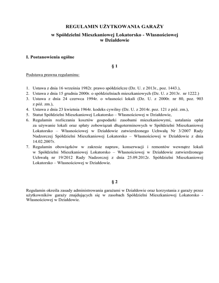 REGULAMIN UŻYTKOWANIA GARAŻY w Spółdzielni Mieszkaniowej Lokatorsko - Własnościowej w Działdowie I. Postanowienia ogólne §1 Podstawa prawna regulaminu: 1. Ustawa z dnia 16 września 1982r. prawo spółdzielcze (Dz. U. z 2013r., poz. 1443.), 2. Ustawa z dnia 15 grudnia 2000r. o spółdzielniach mieszkaniowych (Dz. U. z 2013r. nr 1222.) 3. Ustawa z dnia 24 czerwca 1994r. o własności lokali (Dz. U. z 2000r. nr 80, poz. 903 z póź. zm.), 4. Ustawa z dnia 23 kwietnia 1964r. kodeks cywilny (Dz. U. z 2014r. poz. 121 z póź. zm.), 5. Statut Spółdzielni Mieszkaniowej Lokatorsko – Własnościowej w Działdowie, 6. Regulamin rozliczania kosztów gospodarki zasobami mieszkaniowymi, ustalania opłat za używanie lokali oraz spłaty zobowiązań długoterminowych w Spółdzielni Mieszkaniowej Lokatorsko – Własnościowej w Działdowie zatwierdzonego Uchwałą Nr 3/2007 Rady Nadzorczej Spółdzielni Mieszkaniowej Lokatorsko – Własnościowej w Działdowie z dnia 14.02.2007r. 7. Regulamin obowiązków w zakresie napraw, konserwacji i remontów wewnątrz lokali w Spółdzielni Mieszkaniowej Lokatorsko – Własnościowej w Działdowie zatwierdzonego Uchwałą nr 19/2012 Rady Nadzorczej z dnia 25.09.2012r. Spółdzielni Mieszkaniowej Lokatorsko – Własnościowej w Działdowie. §2 Regulamin określa zasady administrowania garażami w Działdowie oraz korzystania z garaży przez użytkowników garaży znajdujących się w zasobach Spółdzielni Mieszkaniowej Lokatorsko Własnościowej w Działdowie. §3 Ilekroć w regulaminie jest mowa o: 1. spółdzielni – rozumie się przez to Spółdzielnię Mieszkaniową Lokatorsko – Własnościową w Działdowie; 2. zarządzie Spółdzielni – oznacza to Zarząd Spółdzielni Mieszkaniowej Lokatorsko – Własnościowej w Działdowie; 3. garażu – rozumie się przez to lokal o innym przeznaczeniu, o którym mowa w przepisach ustawy o własności lokali, przeznaczony do przechowywania pojazdów mechanicznych; 4. użytkowniku garażu – rozumie się przez to członka spółdzielni, któremu przysługuje spółdzielcze własnościowe prawo do garażu, członka Spółdzielni będącego właścicielem garażu, osobę niebędącą członkiem spółdzielni, której przysługuje spółdzielcze własnościowe prawo do garażu, właściciela garażu niebędącego członkiem spółdzielni, najemcę garażu; 5. statucie - rozumie się przez to Statut Spółdzielni Mieszkaniowej Lokatorsko – Własnościowej w Działdowie. §4 1. Spółdzielnia oddaje garaże do używania na zasadzie: 1) spółdzielczego własnościowego prawa, 2) prawa odrębnej własności, 3) prawa najmu. 2. Spółdzielcze własnościowe prawo do garażu jest ograniczonym prawem rzeczowym, prawem zbywalnym, przechodzi na spadkobierców i podlega egzekucji. 3. Odrębna własność garażu jest prawem zbywalnym, przechodzi na spadkobierców i podlega egzekucji. 4. Garaże wynajmowane jak również stanowiące przedmiot spółdzielczego własnościowego prawa są własnością Spółdzielni. II. Spółdzielcze własnościowe prawo do garażu i prawo odrębnej własności garażu §5 1. Osoby, które nabyły spółdzielcze własnościowe prawo lub prawo odrębnej własności garażu w drodze darowizny, dziedziczenia, zapisu, wzajemnej zamiany lub kupna, wstępują w prawa i obowiązki dotychczasowych użytkowników garażu. 2. Do istniejącego spółdzielczego własnościowego prawa do garażu stosuje się odpowiednio przepisy o spółdzielczym własnościowym prawie do lokalu o innym przeznaczeniu niż lokal mieszkalny. 3. Umowy zawarte przez członka albo osobę niebędącą członkiem spółdzielni, której przysługuje spółdzielcze własnościowe prawo do garażu, w sprawie korzystania z garażu lub jego części wygasają najpóźniej z chwilą wygaśnięcia spółdzielczego prawa do tego lokalu. III. Najem garażu. §6 1. Garaże, stanowiące własność Spółdzielni i niebędące własnościowego prawa do garażu, mogą być wynajmowane. przedmiotem spółdzielczego 2. Spółdzielnia prowadzi rejestr osób oczekujących na najem garażu. 3. Przydział najmu garażu następuje według kolejności zgłoszeń. 4. Najem garażu następuje na podstawie umowy zawartej na piśmie pod rygorem nieważności. 5. Zarząd Spółdzielni może wyrazić zgodę na najem garażu poza kolejnością z listy oczekujących: małżonkowi, zstępnym i wstępnym zmarłego najemcy garażu –na warunkach nieodbiegających od zawartych w dotychczasowej umowie z najemcą. IV. Obowiązki Spółdzielni i użytkowników garaży. §7 1. Do obowiązków Spółdzielni w zakresie eksploatacji garaży należy: 1) zabezpieczenie odpowiednich zbiorników do składowania odpadów komunalnych, 2) przeprowadzanie konserwacji i remontów wspólnych instalacji zewnętrznych, np. instalacji oświetlenia terenu zewnętrznego w obrębie zespołu garaży , 3) dokonywanie remontów nawierzchni dróg stanowiących część wspólną garaży, 4) utrzymywanie na bieżąco należytego stanu dróg stanowiących część wspólną garaży, 5) odśnieżanie nawierzchni dróg stanowiących część wspólną garaży w obrębie garaży, 6) kompleksowe uprzątnięcie dróg stanowiących część wspólną garaży w obrębie garaży raz w roku po okresie zimowym. 2. Do obowiązków użytkowników garaży w zakresie eksploatacji garaży należy: 1) utrzymywanie wnętrza garażu w należytym stanie technicznym, w tym instalacji wentylacyjnej, 2) przeprowadzanie prac konserwacyjnych i remontowych na własny koszt, również tych wynikających z przeglądów stanu technicznego przy zastosowaniu § 16 pkt.1 Regulaminu obowiązków w zakresie napraw, konserwacji i remontów wewnątrz lokali w Spółdzielni Mieszkaniowej Lokatorsko – Własnościowej w Działdowie zatwierdzonego Uchwałą nr 19/2012 Rady Nadzorczej z dnia 25.09.2012r. Spółdzielni Mieszkaniowej Lokatorsko – Własnościowej w Działdowie, 3) naprawa wewnętrznej insta