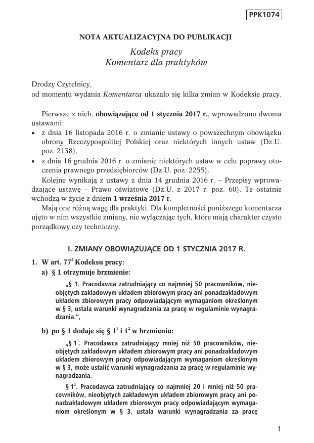 PPK1074 NOTA AKTUALIZACYJNA DO PUBLIKACJI Kodeks pracy Komentarz dla praktyków Drodzy Czytelnicy, od momentu wydania Komentarza ukazało się kilka zmian w Kodeksie pracy. Pierwsze z nich, obowiązujące od 1 stycznia 2017 r., wprowadzono dwoma ustawami: · z dnia 16 listopada 2016 r. o zmianie ustawy o powszechnym obowiązku obrony Rzeczypospolitej Polskiej oraz niektórych innych ustaw (Dz.U. poz. 2138), · z dnia 16 grudnia 2016 r. o zmianie niektórych ustaw w celu poprawy otoczenia prawnego przedsiębiorców (Dz.U. poz. 2255). Kolejne wynikają z ustawy z dnia 14 grudnia 2016 r. – Przepisy wprowadzające ustawę – Prawo oświatowe (Dz.U. z 2017 r. poz. 60). Te ostatnie wchodzą w życie z dniem 1 września 2017 r. Mają one różną wagę dla praktyki. Dla kompletności poniższego komentarza ujęto w nim wszystkie zmiany, nie wyłączając tych, które mają charakter czysto porządkowy czy techniczny. I. ZMIANY OBOWIĄZUJĄCE OD 1 STYCZNIA 2017 R. 2 1. W art. 77 Kodeksu pracy: a) § 1 otrzymuje brzmienie: „§ 1. Pracodawca zatrudniający co najmniej 50 pracowników, nieobjętych zakładowym układem zbiorowym pracy ani ponadzakładowym układem zbiorowym pracy odpowiadającym wymaganiom określonym w § 3, ustala warunki wynagradzania za pracę w regulaminie wynagradzania.”, 1 2 b) po § 1 dodaje się § 1 i 1 w brzmieniu: 1 „§ 1 . Pracodawca zatrudniający mniej niż 50 pracowników, nieobjętych zakładowym układem zbiorowym pracy ani ponadzakładowym układem zbiorowym pracy odpowiadającym wymaganiom określonym w § 3, może ustalić warunki wynagradzania za pracę w regulaminie wynagradzania. 2 § 1 . Pracodawca zatrudniający co najmniej 20 i mniej niż 50 pracowników, nieobjętych zakładowym układem zbiorowym pracy ani ponadzakładowym układem zbiorowym pracy odpowiadającym wymaganiom określonym w § 3, ustala warunki wynagradzania za pracę 1 Kodeks pracy. Komentarz dla praktyków w regulaminie wynagradzania, jeżeli zakładowa organizacja związkowa wystąpi z wnioskiem o jego ustalenie.”, c) § 2 otrzymuje brzmienie: „§ 2. W regulaminie wynagradzania pracodawca może ustalić także inne świadczenia związane z pracą i zasady ich przyznawania.”. 2 Na szczególną uwagę zasługują zmiany wprowadzone w art. 77 k.p. ukierunkowane na złagodzenie wymogów prawa pracy wobec małych pracodawców poprzez podniesienie progów dotyczących obowiązku wydania regulaminu wynagradzania z 20 do 50 pracowników. Pracodawcy zatrudniający mniej niż 50 pracowników nieobjętych zakładowym lub ponadzakładowym układem zbio2 rowym pracy odpowiadającym wymaganiom określonym w art. 77 § 3 k.p. mogą, ale nie muszą wydawać regulaminu wynagradzania. Poczyniono tu jednak jeden wyjątek. Dotyczy on pracodawców zatrudniających co najmniej 20 i mniej niż 50 pracowników nieobjętych zakładowym lub ponadzakładowym układem zbiorowym pracy odpowiadającym wymaganiom określonym w art. 772 § 3 k.p., u których działa zakładowa organizacja związkowa. Na wniosek takiej organizacji pracodawca ma obowiązek wydać żądany regulamin wynagradzania. Wydanie regulaminu następuje w normalnym trybie, tj. z zachowaniem procedury uzgodnieniowej przewidzianej dla tych aktów w art. 772 § 4 k.p. oraz art. 30 ust. 5 u.z.z. Oczywiste korzyści, jakie stąd płyną dla małych pracodawców, mogą nieść ze sobą również pewne zagrożenia. Rezygnując z wydania regulaminu wynagradzania, pracodawcy pozbawiają się ważnego w trudnych sytuacjach finansowych instrumentu ograniczania kosztów zatrudnienia. Nie będą mogli skorzystać z przewidzianej w art. 91 k.p. instytucji czasowego zawieszenia tego wewnątrzzakładowego aktu prawa pracy, jakim jest regulamin wynagradzania. Pracodawcy zatrudniający co najmniej 20 i mniej niż 50 pracowników nieobjętych zakładowym lub ponadzakładowym układem zbiorowym pracy odpowiadającym wymaganiom określonym w art. 772 § 3 k.p. nie będą mogli skorzystać z instytucji okresowego stosowania mniej korzystnych warunków o pracę, niż wynikające z umów o pracę, zawierając w tym celu stosowne porozumienie przewidziane w art. 231a k.p., ale zarezerwowane wyłącznie dla pracodawców zatrudniających poniżej 20 pracowników. Reasumując, pracodawcy zatrudniający co najmniej 20 i mniej niż 50 pracowników nieobjętych zakładowym lub ponadzakładowym układem zbiorowym pracy, którzy nie wydali regulaminu pracy, nie będą mogli zawierać porozumień o czasowym zawieszeniu stosowania przepisów aktu płacowego ani o zawieszeniu niektórych postanowień umów o pracę. 2 Nota aktualizacyjna 2. W art. 97 Kodeksu pracy: 3 a) § 1–1 otrzymują brzmienie: „§ 1. W związku z rozwiązaniem lub wygaśnięciem stosunku pracy pracodawca jest obowiązany niezwłocznie wydać pracownikowi świadectwo pracy, jeżeli nie zamierza nawiązać z nim kolejnego stosunku pracy w ciągu 7 dni od dnia rozwiązania lub wygaśnięcia poprzedniego stosunku pracy. Świadectwo pracy dotyczy okresu lub okresów zatrudnienia, za które dotychczas nie wydano świadectwa pracy. 1 § 1 . W przypadku nawiązania z tym samym pracownikiem kolejnego stosunku pracy w ciągu 7 dni od dnia rozwiązania lub wygaśnięcia poprzedniego stosunku pracy, pracodawca jest obowiązany wydać pracownikowi świadectwo pracy wyłącznie na jego wniosek, złożony w postaci papierowej lub elektronicznej; wniosek może być złożony w każdym czasie i dotyczyć wydania świadectwa pracy dotyczącego poprzedniego okresu zatrudnienia albo wszystkich okresów zatrudnienia, za które dotychczas nie wydano świadectwa pracy. 2 1 § 1 . W przypadku, o którym mowa w § 1 , pracodawca jest obowiązany wydać pracownikowi świadectwo pracy w ciągu 7 dni od dnia złożenia wniosku. 3 § 1 . Wydanie świadectwa pracy nie może być uzależnione od uprzedniego rozliczenia się pracownika z pracodawcą.”, b) § 4 otrzymuje brzmienie: „§ 4. Minister właściwy do spraw pra