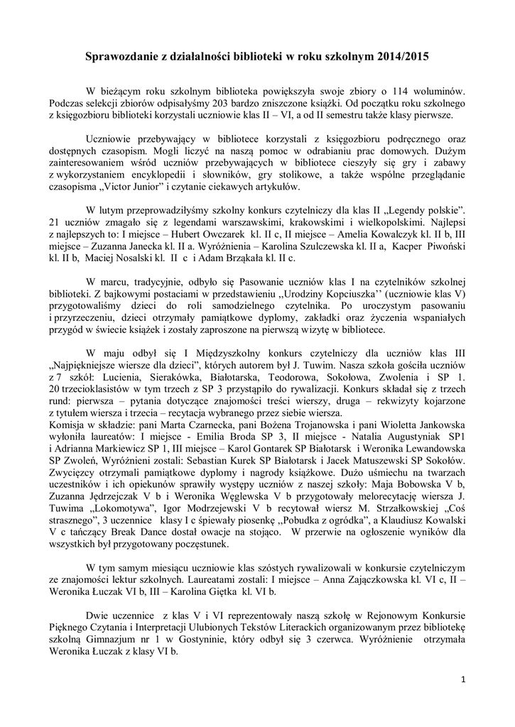 Sprawozdanie z działalności biblioteki w roku szkolnym 2014/2015 W bieżącym roku szkolnym biblioteka powiększyła swoje zbiory o 114 woluminów. Podczas selekcji zbiorów odpisałyśmy 203 bardzo zniszczone książki. Od początku roku szkolnego z księgozbioru biblioteki korzystali uczniowie klas II – VI, a od II semestru także klasy pierwsze. Uczniowie przebywający w bibliotece korzystali z księgozbioru podręcznego oraz dostępnych czasopism. Mogli liczyć na naszą pomoc w odrabianiu prac domowych. Dużym zainteresowaniem wśród uczniów przebywających w bibliotece cieszyły się gry i zabawy z wykorzystaniem encyklopedii i słowników, gry stolikowe, a także wspólne przeglądanie czasopisma „Victor Junior” i czytanie ciekawych artykułów. W lutym przeprowadziłyśmy szkolny konkurs czytelniczy dla klas II „Legendy polskie”. 21 uczniów zmagało się z legendami warszawskimi, krakowskimi i wielkopolskimi. Najlepsi z najlepszych to: I miejsce – Hubert Owczarek kl. II c, II miejsce – Amelia Kowalczyk kl. II b, III miejsce – Zuzanna Janecka kl. II a. Wyróżnienia – Karolina Szulczewska kl. II a, Kacper Piwoński kl. II b, Maciej Nosalski kl. II c i Adam Brząkała kl. II c. W marcu, tradycyjnie, odbyło się Pasowanie uczniów klas I na czytelników szkolnej biblioteki. Z bajkowymi postaciami w przedstawieniu ,,Urodziny Kopciuszka’’ (uczniowie klas V) przygotowaliśmy dzieci do roli samodzielnego czytelnika. Po uroczystym pasowaniu i przyrzeczeniu, dzieci otrzymały pamiątkowe dyplomy, zakładki oraz życzenia wspaniałych przygód w świecie książek i zostały zaproszone na pierwszą wizytę w bibliotece. W maju odbył się I Międzyszkolny konkurs czytelniczy dla uczniów klas III „Najpiękniejsze wiersze dla dzieci”, których autorem był J. Tuwim. Nasza szkoła gościła uczniów z 7 szkół: Lucienia, Sierakówka, Białotarska, Teodorowa, Sokołowa, Zwolenia i SP 1. 20 trzecioklasistów w tym trzech z SP 3 przystąpiło do rywalizacji. Konkurs składał się z trzech rund: pierwsza – pytania dotyczące znajomości treści wierszy, druga – rekwizyty kojarzone z tytułem wiersza i trzecia – recytacja wybranego przez siebie wiersza. Komisja w składzie: pani Marta Czarnecka, pani Bożena Trojanowska i pani Wioletta Jankowska wyłoniła laureatów: I miejsce - Emilia Broda SP 3, II miejsce - Natalia Augustyniak SP1 i Adrianna Markiewicz SP 1, III miejsce – Karol Gontarek SP Białotarsk i Weronika Lewandowska SP Zwoleń, Wyróżnieni zostali: Sebastian Kurek SP Białotarsk i Jacek Matuszewski SP Sokołów. Zwycięzcy otrzymali pamiątkowe dyplomy i nagrody książkowe. Dużo uśmiechu na twarzach uczestników i ich opiekunów sprawiły występy uczniów z naszej szkoły: Maja Bobowska V b, Zuzanna Jędrzejczak V b i Weronika Węglewska V b przygotowały melorecytację wiersza J. Tuwima „Lokomotywa”, Igor Modrzejewski V b recytował wiersz M. Strzałkowskiej „Coś strasznego”, 3 uczennice klasy I c śpiewały piosenkę ,,Pobudka z ogródka”, a Klaudiusz Kowalski V c tańczący Break Dance dostał owacje na stojąco. W przerwie na ogłoszenie wyników dla wszystkich był przygotowany poczęstunek. W tym samym miesiącu uczniowie klas szóstych rywalizowali w konkursie czytelniczym ze znajomości lektur szkolnych. Laureatami zostali: I miejsce – Anna Zajączkowska kl. VI c, II – Weronika Łuczak VI b, III – Karolina Giętka kl. VI b. Dwie uczennice z klas V i VI reprezentowały naszą szkołę w Rejonowym Konkursie Pięknego Czytania i Interpretacji Ulubionych Tekstów Literackich organizowanym przez bibliotekę szkolną Gimnazjum nr 1 w Gostyninie, który odbył się 3 czerwca. Wyróżnienie otrzymała Weronika Łuczak z klasy VI b. 1 Dużym zainteresowaniem wśród uczniów i rodziców cieszy się kiermasz używanych podręczników dla klas IV – V, którego organizatorem jest biblioteka szkolna. W II semestrze przygotowałyśmy wystawę książek dla uczniów klas I i prezentującą nowości wydawnicze dla klas IV - VI. Przez cały rok szkolny trwała akcja „Cała szkoła czyta dzieciom”, która cieszyła się dużym zainteresowaniem wśród uczniów klas IV – VI. Dzięki systematycznym spotkaniom w świetlicy dzieci zapoznały się z całym cyklem książek o Koszmarnym Karolku. Według harmonogramu zajęć z edukacji czytelniczej i medialnej w roku szkolnym przeprowadzono 21 lekcji, a na 37 godzinach lekcyjnych biblioteka obejmowała opieką uczniów klas I – VI i grupy „0” w trakcie zastępstw doraźnych. Natomiast na 176 godzinach 5 uczniów nieuczestniczących w lekcjach religii. Bibliotekę odwiedziło korzystając z czytelni 3132 uczniów, zarejestrowano 4910 wypożyczeń. Średnia dzienna wypożyczeń wyniosła 28,35 a średnia na ucznia 5,83. Najlepsze wyniki w czytelnictwie w klasach I - III osiągnęły klasy: z klas I - I a – 5,46 z klas II – II a – 15,52 z klas III – III c – 8,32 książki na ucznia. Najlepsze wyniki w czytelnictwie w klasach IV – VI osiągnęły klasy: z klas IV: IV c – 4,75 z klas V: V a – 4,96 z klas VI: VI b – 4,96 książki na ucznia. Wnioski do pracy w przyszłym roku szkolnym: 1. Przygotowanie suchego pomieszczenia i regałów do przechowywania nowych podręczników. 2. Zakup nowych stolików i krzeseł. 3. Remont pomieszczenia biblioteki. 4. Zakup ekranizacji lektur szkolnych na płytach DVD. Beata Dutkiewicz, Anna Osmałek 2