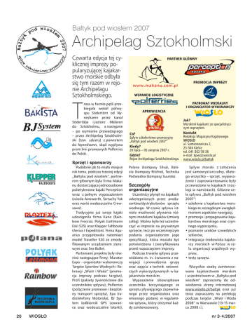 Bałtyk pod wiosłem 2007 Archipelag Sztokholmski Czwarta edycja tej cyklicznej imprezy popularyzującej kajakarstwo morskie odbyła się tym razem w rejonie Archipelagu Sztokholmskiego. T rasa w formie pętli przebiegała wokół półwyspu Södertörn od Nyneshamn przez kanał Södertälje i jezioro Mälaren do Sztokholmu, a następnie – po wymianie prowadzącego – przez Archipelag Sztokholmski (tzw. szkiery) z powrotem do Nyneshamn, skąd wypływa prom linii promowych Polferries do Polski. Sprzęt i sponsorzy Podobnie jak to miało miejsce rok temu, podczas trzeciej edycji „Bałtyku pod wiosłem”, partnerem głównym była firma Makanu dostarczająca jednoosobowe polietylenowe kajaki Perception wraz z pełnym wyposażeniem (wiosła Ainsworth, fartuchy Yak oraz worki wodoszczelne Crewsaver). Tradycyjnie już swoje kajaki udostępniła firma Kano (Rainbow Freccia), Polyak (Lettmann Eski 525) oraz Klepper Faltboote (Aerius I Expedition). Firma Aquarius przygotowała natomiast model Traveller 530 ze zmodyfikowanym urządzeniem sterowym oraz Sea Bullet. Partnerami projektu były również następujące firmy: Murator Expo – organizator wykonawczy Targów Sportów Wodnych i Rekreacji „Wiatr i Woda” (promocja imprezy podczas targów), Profi (pakiety żywnościowe dla uczestników spływu), Polferries (połączenie promowe i bezpłatny transport sprzętu), Epa (radiotelefony Motorola), BJ System (odbiornik GPS Lowrance oraz wodoszczelne latarki), 20 WIOSŁO PARTNER GŁÓWNY PROMOCJA IMPREZY WSPARCIE LOGISTYCZNE PATRONAT MEDIALNY APROWIZACJA Co? Spływ szkoleniowo-promocyjny „Bałtyk pod wiosłem 2007” Kiedy? 20 lipca – 05 sierpnia 2007 r. Gdzie? Rejon Archipelagu Sztokholmskiego. Polana (kompasy Silva), Bakista (kompasy Ritchie), Technika Podwodna (kompasy Suunto). Szczegóły organizacyjne Uczestnicy płynęli na kajakach udostępnionych przez producentów/dystrybutorów sprzętu wodnego. W czasie spływu istniała możliwość pływania różnymi modelami kajaków (zmiany załóg). Można było też uczestniczyć w imprezie na prywatnym sprzęcie, lecz po wcześniejszym podaniu organizatorom jego specyfikacji, która musiała być potwierdzona i zweryfikowana przed rozpoczęciem imprezy. Podczas trwania spływu przewidziano m. in. ćwiczenia z nawigacji i prowadzenia grupy oraz zajęcia z technik ratowniczych wykorzystywanych w kajakarstwie morskim. Wyposażenie obowiązkowe uczestnika korzystającego ze sprzętu pływającego zapewnianego przez organizatora oraz własnego podano w regulaminie spływu, który otrzymał każdy zainteresowany. I ORGANIZATOR WYKONAWCZY Jak? Morskimi kajakami ze specjalistycznym osprzętem. Kontakt Redakcja Magazynu Kajakowego WIOSŁO ul. Samsonowicza 2, 25-564 Kielce tel. 041-362-78-38 e-mail: [email protected] www.wioslo.pl/baltyk Spływ morski z założenia jest samowystarczalny, dlatego wszystko – sprzęt, wyposażenie i zaprowiantowanie były przewożone w kajakach (noclegi w namiotach). Główne cele spływu „Bałtyk pod wiosłem 2007”: • szkolenie z kajakarstwa mors kiego ze szczególnym uwzględnieniem aspektów nawigacji, • promocja i propagowanie kajakarstwa morskiego oraz czynnego wypoczynku, • poznanie uroków szwedzkich szkierów, • integracja środowiska kajakarzy morskich w Polsce w celu organizacji wspólnych wypraw, • testy sprzętu. Wszystkie osoby zainteresowane kajakarstwem morskim i uczestnictwem w „Bałtyku pod wiosłem” zapraszamy do odwiedzenia strony internetowej www.wioslo.pl/baltyk oraz już teraz zapraszamy na prelekcję podczas targów „Wiatr i Woda 2008” w Warszawie (13-15 marca 2008 r.). nr 3-4/2007