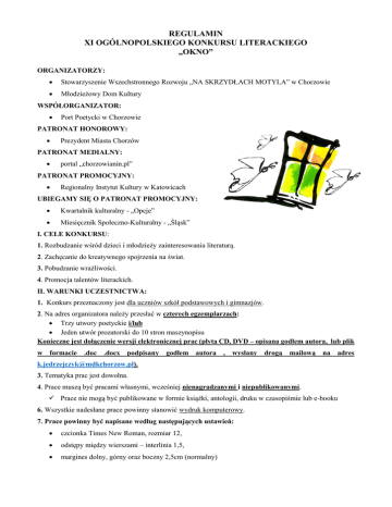 REGULAMIN XI OGÓLNOPOLSKIEGO KONKURSU LITERACKIEGO „OKNO” ORGANIZATORZY: Stowarzyszenie Wszechstronnego Rozwoju „NA SKRZYDŁACH MOTYLA” w Chorzowie Młodzieżowy Dom Kultury WSPÓŁORGANIZATOR: Port Poetycki w Chorzowie PATRONAT HONOROWY: Prezydent Miasta Chorzów PATRONAT MEDIALNY: portal „chorzowianin.pl” PATRONAT PROMOCYJNY: Regionalny Instytut Kultury w Katowicach UBIEGAMY SIĘ O PATRONAT PROMOCYJNY: Kwartalnik kulturalny - „Opcje” Miesięcznik Społeczno-Kulturalny - „Śląsk” I. CELE KONKURSU: 1. Rozbudzanie wśród dzieci i młodzieży zainteresowania literaturą. 2. Zachęcanie do kreatywnego spojrzenia na świat. 3. Pobudzanie wrażliwości. 4. Promocja talentów literackich. II. WARUNKI UCZESTNICTWA: 1. Konkurs przeznaczony jest dla uczniów szkół podstawowych i gimnazjów. 2. Na adres organizatora należy przesłać w czterech egzemplarzach: Trzy utwory poetyckie i/lub Jeden utwór prozatorski do 10 stron maszynopisu Konieczne jest dołączenie wersji elektronicznej prac (płyta CD, DVD – opisana godłem autora, lub plik w formacie .doc .docx podpisany godłem autora , wysłany drogą mailową na adres [email protected]). 3. Tematyka prac jest dowolna. 4. Prace muszą być pracami własnymi, wcześniej nienagradzanymi i niepublikowanymi. Prace nie mogą być publikowane w formie książki, antologii, druku w czasopiśmie lub e-booku 6. Wszystkie nadesłane prace powinny stanowić wydruk komputerowy. 7. Prace powinny być napisane według następujących ustawień: czcionka Times New Roman, rozmiar 12, odstępy między wierszami – interlinia 1,5, margines dolny, górny oraz boczny 2,5cm (normalny) 8. Każda nadesłana na konkurs praca powinna być oznaczona godłem (słowo lub wyrażenie, będące umownym znakiem autora, nie może to być znak graficzny). 9. Do prac należy dołączyć kopertę opatrzoną tym samym godłem autora. W kopercie należy umieścić podpisane oświadczenie* oraz kwestionariusz, który musi zawierać: imię i nazwisko, datę urodzenia, dokładny adres, telefon, adres e-mail. W kwestionariuszu należy umieścić godło oraz prawdziwe dane autora - nie pseudonim artystyczny. 10. PRACE, KTÓRE NIE BĘDĄ SPEŁNIAŁY WYŻEJ WYMIENIONYCH WYMOGÓW BĘDĄ ODRZUCANE. 11. Koszty przygotowania i dostarczenia prac oraz koszty przyjazdu na uroczyste wręczenie nagród ponosi uczestnik konkursu. III. TERMINY: 1. Prace należy przesyłać do 28 kwietnia 2017 r. (decyduje data stempla pocztowego), na adres: Młodzieżowy Dom Kultury ul. Lompy 13 41-500 Chorzów [ z dopiskiem KONKURS LITERACKI „OKNO” ] 2. Uroczyste rozstrzygnięcie konkursu nastąpi w pierwszych dwóch tygodniach czerwca 2017 r. w Młodzieżowym Domu Kultury w Chorzowie. O dokładnym terminie organizatorzy poinformują laureatów pisemnie lub telefonicznie. IV. NAGRODY: 1.Powołane przez organizatorów jury dokona oceny nadesłanych prac oraz zadecyduje o podziale nagród. 2. Prace będą oceniane w dwóch kategoriach wiekowych: a) uczniowie klas IV – VI szkoły podstawowej, b) uczniowie szkół gimnazjalnych. 3. Organizatorzy przewidują nagrody rzeczowe dla laureatów I, II i III miejsca w dziedzinie prozy oraz I, II i III miejsca w dziedzinie poezji oraz wyróżnienia dla każdej grupy wiekowej. V. USTALENIA KOŃCOWE: 1. Zgłoszenie prac do konkursu jest równoznaczne z wyrażeniem zgody do przetwarzania danych osobowych do celów organizacyjnych Młodzieżowego Domu Kultury oraz na publikację wizerunku w materiałach promocyjnych, prasie lokalnej, na stronie internetowej MDK, na profilu społecznościowym Facebook oraz na stronach instytucji współpracujących, do celów edukacyjnych i popularyzatorskich. 3. Organizatorzy nie zwracają nadesłanych prac, stają się one własnością organizatora. 4. Sprawy nie ujęte w regulaminie rozstrzyga organizator. 5. Administratorem danych jest Młodzieżowy Dom Kultury w Chorzowie 6. Koordynator imprezy: Katarzyna Jędrzejczyk ([email protected]) *Załącznik do Regulaminu XI Ogólnopolskiego Konkursu Literackiego „OKNO” Dane osobowe uczestnika konkursu: Imię Nazwisko Data urodzenia Adres zamieszkania (ulica, nr domu, nr lokalu, miejscowość, kod pocztowy) Numer telefonu Adres mail Kategoria wiekowa: (szkoła, klasa) Godło Tytuł utworu Dane opiekuna: Imię nazwisko Telefon kontaktowy OŚWIADCZENIE Oświadczam, iż przekazane prace konkursowe nie były wcześniej nagradzane i publikowane oraz nie naruszają majątkowych i osobistych praw autorskich osób trzecich. ……………………………………… Podpis uczestnika konkursu