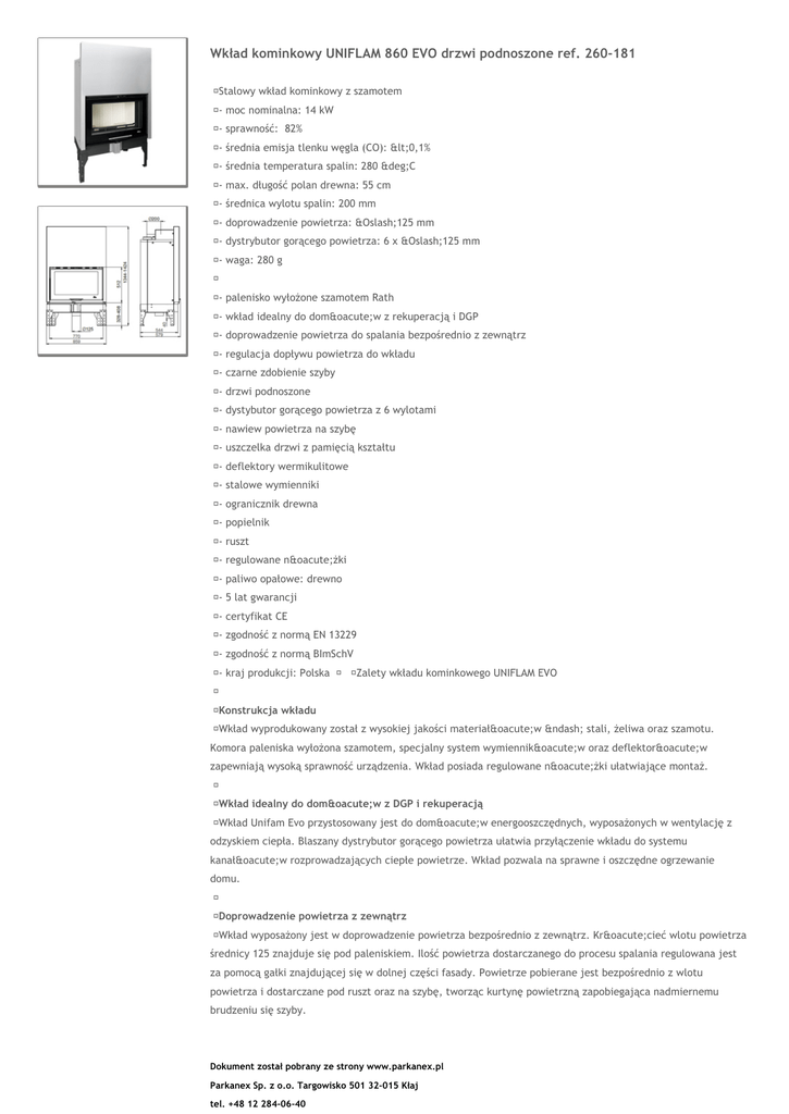 Wkład kominkowy UNIFLAM 860 EVO drzwi podnoszone ref. 260-181 Stalowy wkład kominkowy z szamotem - moc nominalna: 14 kW - sprawność: 82% - średnia emisja tlenku węgla (CO): <0,1% - średnia temperatura spalin: 280 °C - max. długość polan drewna: 55 cm - średnica wylotu spalin: 200 mm - doprowadzenie powietrza: Ø125 mm - dystrybutor gorącego powietrza: 6 x Ø125 mm - waga: 280 g - palenisko wyłożone szamotem Rath - wkład idealny do domów z rekuperacją i DGP - doprowadzenie powietrza do spalania bezpośrednio z zewnątrz - regulacja dopływu powietrza do wkładu - czarne zdobienie szyby - drzwi podnoszone - dystybutor gorącego powietrza z 6 wylotami - nawiew powietrza na szybę - uszczelka drzwi z pamięcią kształtu - deflektory wermikulitowe - stalowe wymienniki - ogranicznik drewna - popielnik - ruszt - regulowane nóżki - paliwo opałowe: drewno - 5 lat gwarancji - certyfikat CE - zgodność z normą EN 13229 - zgodność z normą BImSchV - kraj produkcji: Polska Zalety wkładu kominkowego UNIFLAM EVO Konstrukcja wkładu Wkład wyprodukowany został z wysokiej jakości materiałów – stali, żeliwa oraz szamotu. Komora paleniska wyłożona szamotem, specjalny system wymienników oraz deflektorów zapewniają wysoką sprawność urządzenia. Wkład posiada regulowane nóżki ułatwiające montaż. Wkład idealny do domów z DGP i rekuperacją Wkład Unifam Evo przystosowany jest do domów energooszczędnych, wyposażonych w wentylację z odzyskiem ciepła. Blaszany dystrybutor gorącego powietrza ułatwia przyłączenie wkładu do systemu kanałów rozprowadzających ciepłe powietrze. Wkład pozwala na sprawne i oszczędne ogrzewanie domu. Doprowadzenie powietrza z zewnątrz Wkład wyposażony jest w doprowadzenie powietrza bezpośrednio z zewnątrz. Krócieć wlotu powietrza średnicy 125 znajduje się pod paleniskiem. Ilość powietrza dostarczanego do procesu spalania regulowana jest za pomocą gałki znajdującej się w dolnej części fasady. Powietrze pobierane jest bezpośrednio z wlotu powietrza i dostarczane pod ruszt oraz na szybę, tworząc kurtynę powietrzną zapobiegająca nadmiernemu brudzeniu się szyby. Dokument został pobrany ze strony www.parkanex.pl Parkanex Sp. z o.o. Targowisko 501 32-015 Kłaj tel. +48 12 284-06-40 Łatwa eksploatacja Pojemny popielnik, żeliwny ruszt oraz sprawnie działający system nadmuchu powietrza na szybę sprawiają że eksploatacja i konserwacja kominka są łatwe i nie zajmują dużo czasu. Szeroki widok palącego się drewna Nowoczesna, stalowa fasada oraz duża szyba z czarnym zdobieniem zapewniają idealną wizję ognia. Klamka oraz uchwyt regulacji powietrza wykonane ze stali nierdzewnej uzupełniają całość tworząc nowoczesną stylistykę paleniska Uniflam Evo. moc nominalna: 14 kW sprawność: 82% średnia temperatura spalin: 280 °C max. długość polan drewna: 55 cm wyloty gorącego powietrza: 6 x 125 mm średnica wylotu spalin: 200 mm waga: 280 kg kraj produkcji: Polska Dokument został pobrany ze strony www.parkanex.pl Parkanex Sp. z o.o. Targowisko 501 32-015 Kłaj tel. +48 12 284-06-40 fax. +48 12 284-06-41 e-mail: [email protected]