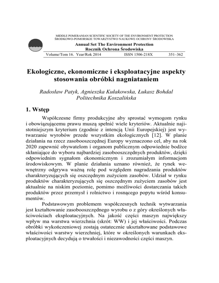 MIDDLE POMERANIAN SCIENTIFIC SOCIETY OF THE ENVIRONMENT PROTECTION ŚRODKOWO-POMORSKIE TOWARZYSTWO NAUKOWE OCHRONY ŚRODOWISKA Annual Set The Environment Protection Rocznik Ochrona Środowiska Volume/Tom 16. Year/Rok 2014 ISSN 1506-218X 351–362 Ekologiczne, ekonomiczne i eksploatacyjne aspekty stosowania obróbki nagniataniem Radosław Patyk, Agnieszka Kułakowska, Łukasz Bohdal Politechnika Koszalińska 1. Wstęp Współczesne firmy produkcyjne aby sprostać wymogom rynku i obowiązującemu prawu muszą spełnić wiele kryteriów. Aktualnie najistotniejszym kryterium (zgodnie z intencją Unii Europejskiej) jest wytwarzanie wyrobów przede wszystkim ekologicznych [12]. W planie działania na rzecz zasobooszczędnej Europy wyznaczono cel, aby na rok 2020 zapewnić obywatelom i organom publicznym odpowiednie bodźce skłaniające do wyboru najbardziej zasobooszczędnych produktów, dzięki odpowiednim sygnałom ekonomicznym i zrozumiałym informacjom środowiskowym. W planie działania uznano również, że rynek wewnętrzny odgrywa ważną rolę pod względem nagradzania produktów charakteryzujących się oszczędnym zużyciem zasobów. Udział w rynku produktów charakteryzujących się oszczędnym zużyciem zasobów jest aktualnie na niskim poziomie, pomimo możliwości dostarczania takich produktów przez przemysł i rolnictwo i rosnącego popytu wśród konsumentów. Podstawowym problemem współczesnych technik wytwarzania jest kształtowanie zasobooszczędnego wyrobu o z góry określonych właściwościach eksploatacyjnych. Na jakość części maszyn największy wpływ ma warstwa wierzchnia (skrót: WW) i jej właściwości. Podczas obróbki wykończeniowej zostają ostatecznie ukształtowane podstawowe właściwości warstwy wierzchniej, które w określonych warunkach eksploatacyjnych decydują o trwałości i niezawodności części maszyn. 352 Radosław Patyk, Agnieszka Kułakowska, Łukasz Bohdal Jedną z metod obróbki wykańczeniowej części maszyn, pozwalającej uzyskać warstwę wierzchnią o korzystnych właściwościach jest obróbka nagniataniem. Polega ona na wykorzystaniu miejscowego odkształcenia plastycznego, zachodzącego w warstwie wierzchniej przedmiotu wskutek określonego termodynamicznego działania twardego i gładkiego elementu nagniatającego w kształcie rolki, krążka, kulki lub koła zębatego, na nierówności powierzchni obrabianej [11]. Schemat elastycznego nagniatania powierzchni walcowych przedstawiono na rysunku 1. Rys. 1. Proces elastycznego nagniatania tocznego powierzchni walcowych: a) schemat procesu, b) rozkład sił działających w strefie nagniatania tocznego, Fw − siła wypadkowa oraz F1, F2, F3 jej składowe: F F F F , gdzie, F1 − siła styczna, F2 − siła osiowa (wzdłużna), F3 − siła normalna (odporowa, główna) Fig. 1. The elastic burnishing rolling process of cylindrical surface: a) shema of process, b) distribution of burnishing force in contact zone Fw – resultant force, and F1, F2, F3 her components F F F F , for F1 – tangential force, F2 – axial force, F3 – normal force (general) 2 w 2 w 1 2 2 1 2 2 2 3 2 3 Odkształcenia plastyczne wywołane tą metodą obróbki powstają w wyniku działania układu sił wywołujących naprężenia w przedmiocie obrabianym przekraczające wartość naprężenia uplastyczniającego. Daje to możliwość otrzymania przedmiotu o dużej gładkości powierzchni połączonej z umocnieniem mechanicznym warstwy wierzchniej oraz konstytuowania w niej naprężeń ściskających, powodując zwiększenie odporności na zużycie w warunkach eksploatacyjnych [1–3, 8–11]. Różnorodność przeznaczenia części oraz różnorodność warunków ich eksploatacji powodują, że wymagania odnośnie do stanu warstwy wierzchniej i dokładności wymiarowo-kształtowej są zróżnicowane. Wia- Ekologiczne, ekonomiczne i eksploatacyjne aspekty stosowania… 353 domo, że istotny wpływ na jakość produktu ma jakość półfabrykatu. Dotychczas tradycyjne nagniatanie rzadko stosowano na skalę przemysłową. Głównym powodem takiego stanu jest brak wytycznych dotyczących doboru parametrów technologicznych procesu nagniatania oraz niejednoznaczne dane dotyczące umiejscowienia tej operacji w procesie wytwarzania, co uniemożliwia tym samym sterowanie jakością WW wyrobu. Istotny wpływ na jakość technologiczną wyrobu nagniatanego mają parametry technologiczne obróbki, współczynnik tarcia oraz zarys nierówności (trójkątny, trapezowy itd.) powierzchni nagniatanej powstały w obróbce poprzedzającej [3, 8–10]. Podstawowym problemem w projektowaniu procesu nagniatania jest dobór parametrów technologicznych, z których najważniejszym jest główna siła nagniatania F3, która jest składową normalną wypadkowej siły nagniatania F. Nieprawidłowy dobór tego parametru powoduje niezamierzone zmiany wymiarowe i kształtowanie warstwy wierzchniej o właściwościach niezgodnych z wymaganymi. W skrajnych przypadkach może nastąpić zniszczenie WW przedmiotu. Dlatego też pomimo mnogości technologii wytwarzania ciągle istnieje potrzeba opracowywania nowych oraz ulepszania istniejących technologii szczególnie tych zasobooszczędnych w celu uzyskiwania wyrobów względnie tanich o dużej odporności na różne rodzaje zużycia eksploatacyjnego. 2. Ekonomiczne aspekty stosowania obróbki nagniataniem Przemysł maszynowy śledzi dokonania naukowców w zakresie powierzchniowej obróbki plastycznej ze względu na czynniki takie jak: możliwość łatwego kształtowania na obrabianej powierzchni regularnych nierówności, możliwość sterowania właściwościami WW, możliwość wygniatania na powierzchni obrabianej mikrorowków smarnych o dowolnym układzie, które zapobiegają zacieraniu i zmniejszają zużycie ścierne, szczególnie w obecności zanieczyszczeń, możliwość zastosowania w pewnych przypadkach do regeneracji wymiarowej części maszyn; możliwość stosowania na