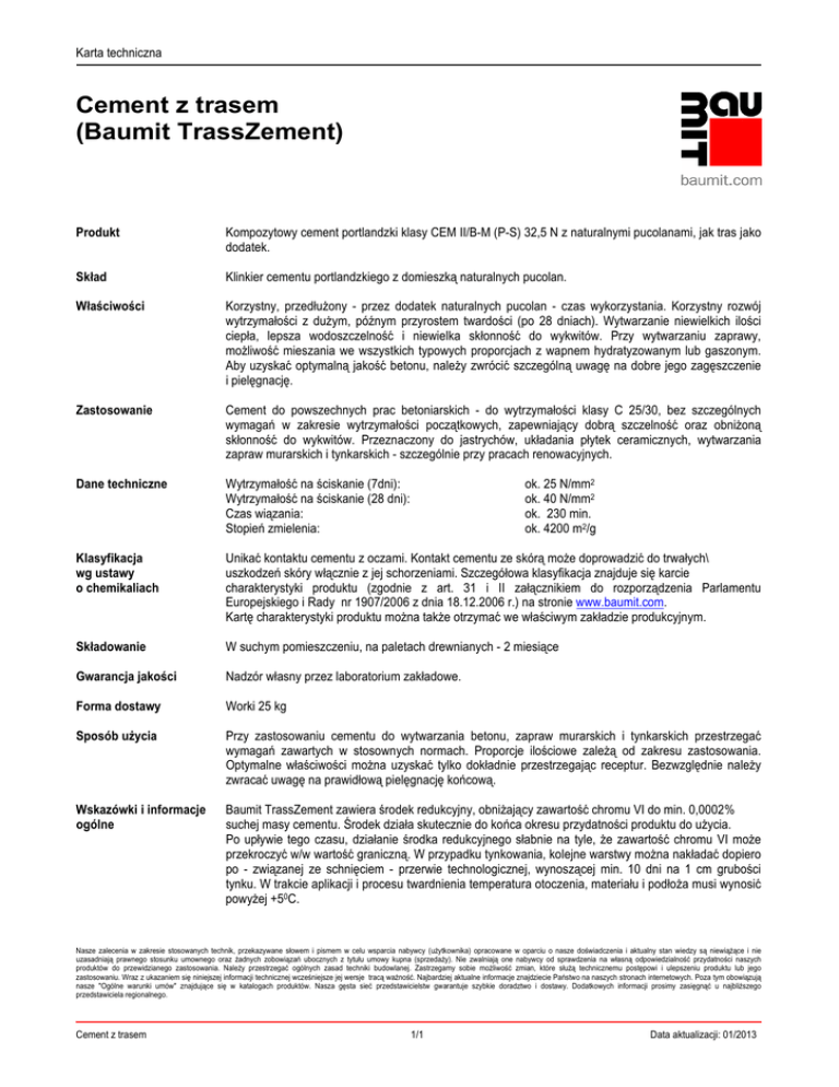 Karta techniczna Cement z trasem (Baumit TrassZement) Produkt Kompozytowy cement portlandzki klasy CEM II/B-M (P-S) 32,5 N z naturalnymi pucolanami, jak tras jako dodatek. Skład Klinkier cementu portlandzkiego z domieszką naturalnych pucolan. Właściwości Korzystny, przedłużony - przez dodatek naturalnych pucolan - czas wykorzystania. Korzystny rozwój wytrzymałości z dużym, późnym przyrostem twardości (po 28 dniach). Wytwarzanie niewielkich ilości ciepła, lepsza wodoszczelność i niewielka skłonność do wykwitów. Przy wytwarzaniu zaprawy, możliwość mieszania we wszystkich typowych proporcjach z wapnem hydratyzowanym lub gaszonym. Aby uzyskać optymalną jakość betonu, należy zwrócić szczególną uwagę na dobre jego zagęszczenie i pielęgnację. Zastosowanie Cement do powszechnych prac betoniarskich - do wytrzymałości klasy C 25/30, bez szczególnych wymagań w zakresie wytrzymałości początkowych, zapewniający dobrą szczelność oraz obniżoną skłonność do wykwitów. Przeznaczony do jastrychów, układania płytek ceramicznych, wytwarzania zapraw murarskich i tynkarskich - szczególnie przy pracach renowacyjnych. Dane techniczne Wytrzymałość na ściskanie (7dni): Wytrzymałość na ściskanie (28 dni): Czas wiązania: Stopień zmielenia: Klasyfikacja wg ustawy o chemikaliach Unikać kontaktu cementu z oczami. Kontakt cementu ze skórą może doprowadzić do trwałych\ uszkodzeń skóry włącznie z jej schorzeniami. Szczegółowa klasyfikacja znajduje się karcie charakterystyki produktu (zgodnie z art. 31 i II załącznikiem do rozporządzenia Parlamentu Europejskiego i Rady nr 1907/2006 z dnia 18.12.2006 r.) na stronie www.baumit.com. Kartę charakterystyki produktu można także otrzymać we właściwym zakładzie produkcyjnym. Składowanie W suchym pomieszczeniu, na paletach drewnianych - 2 miesiące Gwarancja jakości Nadzór własny przez laboratorium zakładowe. Forma dostawy Worki 25 kg Sposób użycia Przy zastosowaniu cementu do wytwarzania betonu, zapraw murarskich i tynkarskich przestrzegać wymagań zawartych w stosownych normach. Proporcje ilościowe zależą od zakresu zastosowania. Optymalne właściwości można uzyskać tylko dokładnie przestrzegając receptur. Bezwzględnie należy zwracać uwagę na prawidłową pielęgnację końcową. Wskazówki i informacje ogólne Baumit TrassZement zawiera środek redukcyjny, obniżający zawartość chromu VI do min. 0,0002% suchej masy cementu. Środek działa skutecznie do końca okresu przydatności produktu do użycia. Po upływie tego czasu, działanie środka redukcyjnego słabnie na tyle, że zawartość chromu VI może przekroczyć w/w wartość graniczną. W przypadku tynkowania, kolejne warstwy można nakładać dopiero po - związanej ze schnięciem - przerwie technologicznej, wynoszącej min. 10 dni na 1 cm grubości tynku. W trakcie aplikacji i procesu twardnienia temperatura otoczenia, materiału i podłoża musi wynosić powyżej +50C. ok. 25 N/mm2 ok. 40 N/mm2 ok. 230 min. ok. 4200 m2/g Nasze zalecenia w zakresie stosowanych technik, przekazywane słowem i pismem w celu wsparcia nabywcy (użytkownika) opracowane w oparciu o nasze doświadczenia i aktualny stan wiedzy są niewiążące i nie uzasadniają prawnego stosunku umownego oraz żadnych zobowiązań ubocznych z tytułu umowy kupna (sprzedaży). Nie zwalniają one nabywcy od sprawdzenia na własną odpowiedzialność przydatności naszych produktów do przewidzianego zastosowania. Należy przestrzegać ogólnych zasad techniki budowlanej. Zastrzegamy sobie możliwość zmian, które służą technicznemu postępowi i ulepszeniu produktu lub jego zastosowaniu. Wraz z ukazaniem się niniejszej informacji technicznej wcześniejsze jej wersje tracą ważność. Najbardziej aktualne informacje znajdziecie Państwo na naszych stronach internetowych. Poza tym obowiązują nasze "Ogólne warunki umów" znajdujące się w katalogach produktów. Nasza gęsta sieć przedstawicielstw gwarantuje szybkie doradztwo i dostawy. Dodatkowych informacji prosimy zasięgnąć u najbliższego przedstawiciela regionalnego. Cement z trasem 1/1 Data aktualizacji: 01/2013