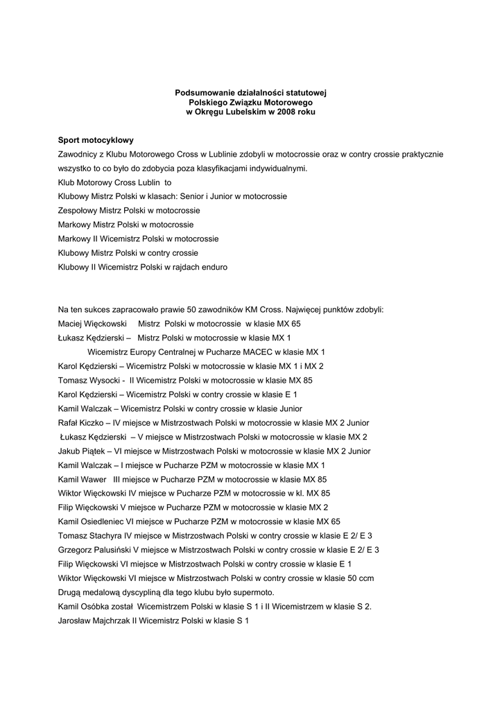 Podsumowanie działalności statutowej Polskiego Związku Motorowego w Okręgu Lubelskim w 2008 roku Sport motocyklowy Zawodnicy z Klubu Motorowego Cross w Lublinie zdobyli w motocrossie oraz w contry crossie praktycznie wszystko to co było do zdobycia poza klasyfikacjami indywidualnymi. Klub Motorowy Cross Lublin to Klubowy Mistrz Polski w klasach: Senior i Junior w motocrossie Zespołowy Mistrz Polski w motocrossie Markowy Mistrz Polski w motocrossie Markowy II Wicemistrz Polski w motocrossie Klubowy Mistrz Polski w contry crossie Klubowy II Wicemistrz Polski w rajdach enduro Na ten sukces zapracowało prawie 50 zawodników KM Cross. Najwięcej punktów zdobyli: Maciej Więckowski Mistrz Polski w motocrossie w klasie MX 65 Łukasz Kędzierski – Mistrz Polski w motocrossie w klasie MX 1 Wicemistrz Europy Centralnej w Pucharze MACEC w klasie MX 1 Karol Kędzierski – Wicemistrz Polski w motocrossie w klasie MX 1 i MX 2 Tomasz Wysocki - II Wicemistrz Polski w motocrossie w klasie MX 85 Karol Kędzierski – Wicemistrz Polski w contry crossie w klasie E 1 Kamil Walczak – Wicemistrz Polski w contry crossie w klasie Junior Rafał Kiczko – IV miejsce w Mistrzostwach Polski w motocrossie w klasie MX 2 Junior Łukasz Kędzierski – V miejsce w Mistrzostwach Polski w motocrossie w klasie MX 2 Jakub Piątek – VI miejsce w Mistrzostwach Polski w motocrossie w klasie MX 2 Junior Kamil Walczak – I miejsce w Pucharze PZM w motocrossie w klasie MX 1 Kamil Wawer III miejsce w Pucharze PZM w motocrossie w klasie MX 85 Wiktor Więckowski IV miejsce w Pucharze PZM w motocrossie w kl. MX 85 Filip Więckowski V miejsce w Pucharze PZM w motocrossie w klasie MX 2 Kamil Osiedleniec VI miejsce w Pucharze PZM w motocrossie w klasie MX 65 Tomasz Stachyra IV miejsce w Mistrzostwach Polski w contry crossie w klasie E 2/ E 3 Grzegorz Palusiński V miejsce w Mistrzostwach Polski w contry crossie w klasie E 2/ E 3 Filip Więckowski VI miejsce w Mistrzostwach Polski w contry crossie w klasie E 1 Wiktor Więckowski VI miejsce w Mistrzostwach Polski w contry crossie w klasie 50 ccm Drugą medalową dyscypliną dla tego klubu było supermoto. Kamil Osóbka został Wicemistrzem Polski w klasie S 1 i II Wicemistrzem w klasie S 2. Jarosław Majchrzak II Wicemistrz Polski w klasie S 1 Radosław Michalak zajął VI miejsce w Mistrzostwach polski w klasie S 2 Cenne sukcesy w motocrossie odnieśli zawodnicy KM Cross w zawodach międzynarodowych Maciej Więckowski X miejsce w Mistrzostwach Europy w kl. EMX 85 Tomasz Wysocki V miejsce w Mistrzostwach Europy Centralnej w Pucharze MACEC w klasie MX 85 Jakub Piątek VI miejsce w Mistrzostwach Europy Centralnej w Pucharze MACEC w klasie MX 1 Klub zorganizował rundę Pucharu MACEC w motocrossie w październiku na nowym Torze w Elizówce, która cieszyła się olbrzymim zainteresowaniem widzów, ale też i dużymi protestami okolicznych mieszkańcow. Klub Motorowy„Pionier” w Lublinie zorganizował 2 razy na Torze „Lublin” zawody motocyklowe w ramach Mistrzostw Polski w supermoto połączone z wyścigami zabytkowych motocykli oraz jeden raz w ramach Pucharu PZM w wyścigach skuterów, odpowiednio w maju i wrześniu 2008 roku. Zawody te cieszyły się dużym zainteresowaniem widzów. W 2008 roku ruszyła już drugi rok nieprofesjonalna liga żużlowa. Nasza lubelska drużyna Klub Żużlowy zdobyła zaszczytny tytuł Klubowego Mistrza Polski a Robert Szewczyk zdobył tytuł Mistrza Polski a jego kolega klubowy Ryszard Brzozowski II Wicemistrza Polski Wspólnie z Gazetą Wyborczą zorganizowaliśmy Plebiscyt na żużlową druzynę 60 – lecia w mieście Lublinie. Czytelnicy wybrali: krajową 8 kę: Zagraniczną trojkę Tadeusz Berej Robert Davos ADAMS Leigh Marek Kępa KASPER Antonin Jerzy Mordel NIELSEN Hans Dariusz Stenka Zbigniew Studziński Dariusz Śledż Włodzimierz Szwendrowski Trener ZWIERZCHOWSKI Witold Sport kartingowy W Ogólnopolskich Zawodach Kartingowych rangi Kartingowych Mistrzostw Polski oraz zawodach Pucharowych zawodnicy Okręgu Lubelskiego w klasyfikacji końcowej zajęli następujące miejsca: Kartingowe Mistrzostwa Polski Kategoria Młodzik 60 1. Parys Piotr – Automobilklub Wschodni – 12 miejsce Kategoria Młodzieżowa 125 1. Mikołaj Sokołowski - UKS Moto – Kart „Energetyk” – 11 miejsce Kategoria ROK 125 1. Ilona Zaniuk - Automobilklub Lubelski – 11 miejsce Puchar Easykart Kategoria Easykart 60 1. Toni Nowosad - Automobilklub Wschodni – 2 miejsce Kategoria Easykart 100 1. Jan Rzepiński - Automobilklub Lubelski – 3 miejsce W klasyfikacji zespołowej 1. Automobilklub Lubelski – 1 miejsce Kategoria Easykart 125 Light – Puchar GKSK 1. Seweryn Szczepanik – DMSB Niemcy – 1 miejsce 2. Ilona Zaniuk - Automobilklub Lubelski – 2 miejsce 3. Karol Próchniak- Automobilklub Lubelski – 3 miejsce W klasyfikacji zespołowej 1. Automobilklub Lubelski – 1 miejsce Kategoria Easykart 125 Shifter 1 Karol Próchniak - Automobilklub Lubelski – 1 miejsce 2. Adrian Czuchaj – Automobilklub Wschodni – 2 miejsce 3. Karol Strużek - Automobilklub Lubelski – 3 miejsce 4 Marek Wyrzykowski - Automobilklub Wschodni – 4 miejsce W klasyfikacji zespołowej 1. Automobilklub Lubelski – 1 miejsce 2.Automobilklub Wschodni – 2 miejsce Europejski Finał Easykarta w Poznaniu Kategoria Easykart 60 1.Toni Nowosad - Automobilklub Wschodni – 10 miejsce Kategoria Easykart 100 1 Patryk Szczepanik - Automobilklub Lubelski – 7 miejsce Kategoria Easykart 125 Light 1. Ilona Zaniuk - Automobilklub Lubelski – 10 miejsce Światowy Finał Easykarta w Lonato Kategoria Easykart 100 1 Patryk Szczepanik - Automobilklub Lubelski – 17 miejsce w finale A Kategoria Easykart 125 Light Seweryn Szczepanik - Automobilklub Lubelski – 5 miejsce w finale A Kategoria Easykart 125 Shifter Karol Próchniak - Automobilklub Lubelski – 8 miejsce w finale A Karol Strużek - Automobilklub Lubelski – 11 miejsce w finale A W Lublinie w miesiącu marcu zorganizowan
