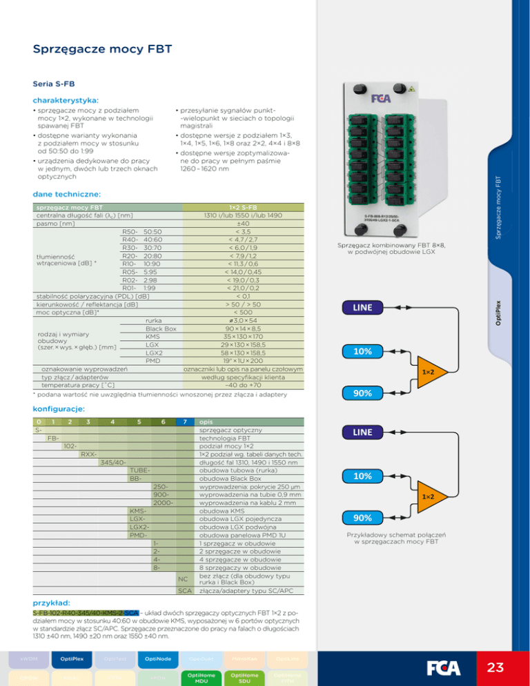 Sprzęgacze mocy FBT Seria S-FB • sprzęgacze mocy z podziałem mocy 1×2, wykonane w technologii spawanej FBT • przesyłanie sygnałów punkt-wielopunkt w sieciach o topologii magistrali • dostępne warianty wykonania z podziałem mocy w stosunku od 50:50 do 1:99 • dostępne wersje z podziałem 1×3, 1×4, 1×5, 1×6, 1×8 oraz 2×2, 4×4 i 8×8 • dostępne wersje zoptymalizowane do pracy w pełnym paśmie 1260 – 1620 nm • urządzenia dedykowane do pracy w jednym, dwóch lub trzech oknach optycznych Sprzęgacze mocy FBT charakterystyka: dane techniczne: * podana wartość nie uwzględnia tłumienności wnoszonej przez złącza i adaptery Sprzęgacz kombinowany FBT 8×8, w podwójnej obudowie LGX OptiNode 1×2 S-FB 1310 i/lub 1550 i/lub 1490 ±40 < 3,5 < 4,7 / 2,7 < 6,0 / 1,9 < 7,9 / 1,2 < 11,3 / 0,6 < 14,0 / 0,45 < 19,0 / 0,3 < 21,0 / 0,2 < 0,1 > 50 / > 50 < 500 !3,0 × 54 90 × 14 × 8,5 35 × 130 × 170 29 × 130 × 158,5 58 × 130 × 158,5 19" × 1U × 200 oznaczniki lub opis na panelu czołowym według specyfikacji klienta –40 do +70 OptiPlex sprzęgacz mocy FBT centralna długość fali (λc) [nm] pasmo [nm] R50- 50:50 R40- 40:60 R30- 30:70 R20- 20:80 tłumienność wtrąceniowa [dB] * R10- 10:90 R05- 5:95 R02- 2:98 R01- 1:99 stabilność polaryzacyjna (PDL) [dB] kierunkowość / reflektancja [dB] moc optyczna [dB]* rurka Black Box rodzaj i wymiary KMS obudowy LGX (szer. × wys. × głęb.) [mm] LGX2 PMD oznakowanie wyprowadzeń typ złącz / adapterów temperatura pracy [˚C] LINE 10% 1×2 90% konfiguracje: 0 S- 1 2 3 4 5 6 7 FB102RXX345/40TUBEBB2509002000KMSLGXLGX2PMD1248NC SCA opis sprzęgacz optyczny technologia FBT podział mocy 1×2 1×2 podział wg. tabeli danych tech. długość fal 1310, 1490 i 1550 nm obudowa tubowa (rurka) obudowa Black Box wyprowadzenia: pokrycie 250 µm wyprowadzenia na tubie 0,9 mm wyprowadzenia na kablu 2 mm obudowa KMS obudowa LGX pojedyncza obudowa LGX podwójna obudowa panelowa PMD 1U 1 sprzęgacz w obudowie 2 sprzęgacze w obudowie 4 sprzęgacze w obudowie 8 sprzęgaczy w obudowie bez złącz (dla obudowy typu rurka i Black Box) złącza/adaptery typu SC/APC LINE 10% 1×2 90% Przykładowy schemat połączeń w sprzęgaczach mocy FBT przykład: S-FB-102-R40-345/40-KMS-2-SCA – układ dwóch sprzęgaczy optycznych FBT 1×2 z podziałem mocy w stosunku 40:60 w obudowie KMS, wyposażonej w 6 portów optycznych w standardzie złącz SC/APC. Sprzęgacze przeznaczone do pracy na falach o długościach 1310 ±40 nm, 1490 ±20 nm oraz 1550 ±40 nm. xWDM OptiPlex OptiTest OptiNode OptiDukt MikroKan OptiLine OPGW FibAir FTTA xPON OptiHome MDU OptiHome SDU OptiHome FITH 23 Sprzęgacze mocy PLC Seria S-PL charakterystyka: • sprzęgacze mocy wykonane w technologii planarnej PLC • technologia PLC pozwala na uzyskanie lepszych parametrów transmisyjnych i mniejszych rozmiarów niż technologia spawana FBT Sprzęgacze mocy PLC • równomierny podział mocy sygnału wejściowego między wiele wyjść • łączenie sygnału z wielu wejść na jedno wyjście • dostępne sprzęgacze w obudowie Mini Box przeznaczone do spawania w kasetach spawów dane techniczne: OptiNode Sprzęgacz planarny PLC 1×8 w obudowie LGX OptiPlex • stopnie podziału sygnału od 1×2 do 1×64 • dostępne wersje z podziałem od 2×2 do 2×64 oraz od 1×3 do 1×24 • przesyłanie sygnałów punkt-wielopunkt w sieciach o topologii drzewa • szerokie okno optyczne – stabilność parametrów w całym paśmie 1250 do 1650 nm LINE 1×8 sprzęgacz mocy PLC 1×2 1×4 1×8 1×16 1×32 1×64 pasmo [nm] 1260 – 1650 tłumienność wtrąceniowa [dB] * < 4,0 < 7,0 < 10 < 13,2 < 16,5 < 20,5 jednorodność [dB] < 0,5 < 0,8 < 0,8 < 1,3 < 1,5 < 2,0 stabilność polaryzacyjna [dB] < 0,2 < 0,3 < 0,4 kierunkowość [dB] > 50 reflektancja [dB] > 50 moc optyczna [mW] < 500 4×4,5×45 4×7×60 4×12×80 6×20×80 6×40×100 Mini Box Black Box 10×80×100 18×80×120 18×115×141 KMS 35×130×170 — — — — rodzaj i wymiary LGX 29×130×158,5 — — — obudowy (szer. × wys. × gł.) [mm] LGX2 58×130×158,5 — — PMD 19"×1U×200 PMD2 — — — — — 19"×2U×200 oznakowanie wyprowadzeń oznaczniki lub opis na panelu czołowym typ złącz / adapterów według specyfikacji klienta temperatura pracy [˚C] od –40 do +70 12,5% * podana wartość nie uwzględnia tłumienności wnoszonej przez złącza i adaptery 12,5% konfiguracje: 12,5% 12,5% 0 S- 1 2 3 4 5 PL102104108 116132164- 12,5% 12,5% TUBEBB- 12,5% 2509002000- 12,5% KMSLGXLGX2PMDPMD2- Przykładowy schemat połączeń w sprzęgaczach mocy PLC 1248NC SCA opis sprzęgacz optyczny technologia PLC podział mocy 1×2 podział mocy 1×4 podział mocy 1×8 podział mocy 1×16 podział mocy 1×32 podział mocy 1×64 obudowa tubowa (Mini Box) obudowa Black Box wyprowadzenia w pokryciu pierwotnym 250 µm wyprowadzenia na tubie 0,9 mm wyprowadzenia na kablu stacyjnym 2 mm obudowa KMS obudowa LGX pojedyncza obudowa LGX podwójna obudowa panelowa PMD 1U obudowa panelowa PMD 2U 1 sprzęgacz w obudowie 2 sprzęgacze w obudowie 4 sprzęgacze w obudowie 8 sprzęgaczy w obudowie bez złącz (dla obudowy typu Mini Box i Black Box) złącza / adaptery typu SC/APC przykład: S-PL-108-BB-2000-SCA – sprzęgacz optyczny PLC 1×8 z równomiernym podziałem mocy w obudowie Black Box, wyprowadzenia na kablu stacyjnym 2 mm, zakończone złączami w standardzie SC/APC. 22 xWDM OptiPlex OptiTest OptiNode OptiDukt MikroKan OptiLine OPGW FibAir FTTA xPON OptiHome MDU OptiHome SDU OptiHome FITH