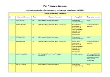 Pan Prezydent Zaprasza Uczniowie nagrodzeni za osiągnięcia naukowe i artystyczne w roku szkolnym 2010/2011 Konkursy przedmiotowe i artystyczne Lp. Imię i nazwisko ucznia Klasa Pełna nazwa konkursu Osiągnięcia Organizator konkursu 1. Rafał Felczyoski 1a IX Bolesławiecki Konkurs Matematyczny Finalista etapu międzypowiatowego PCEiKK 2. Martyna Słonecka 1a V Dolnośląski Przegląd Piosenki i Pieśni Patriotycznej Laureatka etapu regionalnego w kategorii zespół muzyczny (konkurs obejmuje dawne województwo jeleniogórskie) Kuratorium Oświaty we Wrocławiu 3. Rafał Wójtowicz 1a IX Bolesławiecki Konkurs Matematyczny Finalista etapu międzypowiatowego PCEiKK 4. Mikołaj Bielawski 1b V Dolnośląski Przegląd Piosenki i Pieśni Patriotycznej Laureat etapu regionalnego w kategorii zespół muzyczny (konkurs obejmuje dawne województwo jeleniogórskie) Kuratorium Oświaty we Wrocławiu 5. Weronika Kobyłecka 1b XVIII Diecezjalny Festiwal Piosenki Religijnej i Patriotycznej II miejsce zespołowo Referat Muzyki Kościelnej Legnickiej Kurii Biskupiej oraz Sankturaium Matki Bożej Łaskawej w Krzeszowie 6. Szymon Wardyoski 1c IX Bolesławiecki Konkurs Matematyczny Finalista etapu międzypowiatowego PCEiKK 7. Marta Parada 1d Ogólnopolski Konkurs Turystyczno-Krajoznawczy "Poznajemy Ojcowiznę" Finalistka etapu wojewódzkiego Polskie TowarzystwoTurystycznoKrajoznawcze i miesięcznik turystyczno-krajoznawczy "Poznaj swój kraj" 8. Emilia Szczepan 1d V Dolnośląski Przegląd Piosenki i Pieśni Patriotycznej Laureat etapu regionalnego w kategorii zespół muzyczny (konkurs obejmuje dawne województwo jeleniogórskie) Kuratorium Oświaty we Wrocławiu Przemysław Klimek 1e X Bolesławiecki Konkurs Matematyczny Finalista etapu międzypowiatowego PCEiKK 10. Sylwia Wojdyło 1e XVIII Diecezjalny Festiwal Piosenki Religijnej i Patriotycznej II miejsce zespołowo Referat Muzyki Kościelnej Legnickiej Kurii Biskupiej oraz Sankturaium Matki Bożej Łaskawej w Krzeszowie 11. Agnieszka Koryluk 2a Ogólnopolski Konkurs Filmowy zorganizowany przez Fundację Partnerstwa dla Środowiska - „Szkoła i dom pozytywnej energii” I miejsce zespołowo w Polsce Fundacja Partnerstwa dla Środowiska Etap dolnośląski – wybrana na posłankę do Sejmu Kancelaria Sejmu, Fundacja CEO, Fundacja Projekt Polska i MEN Ogólnopolski Konkurs Filmowy zorganizowany przez Fundację Partnerstwa dla Środowiska - „Szkoła i dom pozytywnej energii” I miejsce zespołowo Fundacja Partnerstwa dla Środowiska Ogólnopolski Konkurs Filmowy zorganizowany przez Fundację Partnerstwa dla Środowiska - „Szkoła i dom pozytywnej energii” I miejsce zespołowo w Polsce Fundacja Partnerstwa dla Środowiska Etap dolnośląski – wybrana na posłankę do Sejmu Kancelaria Sejmu, Fundacja CEO, Fundacja Projekt Polska i MEN 9. XVII Sesja Sejmu Dzieci i Młodzieży 12. 13. Karol Polewczyk Kamila Popek 2a 2a XVII Sesja Sejmu Dzieci i Młodzieży w Polsce 14. Laura Buryło 2b V Dolnośląski Przegląd Piosenki i Pieśni Patriotycznej Laureatka etapu regionalnego w kategorii zespół muzyczny (konkurs obejmuje dawne województwo jeleniogórskie) Kuratorium Oświaty we Wrocławiu 15. Patryk Kędziora 2b Ogólnopolski Konkurs Filmowy zorganizowany przez Fundację Partnerstwa dla Środowiska - „Szkoła i dom pozytywnej energii” I miejsce zespołowo w Polsce Fundacja Partnerstwa dla Środowiska 16. Karol Lisiecki 2b XVIII Diecezjalny Festiwal Piosenki Religijnej i Patriotycznej II miejsce zespołowo Referat Muzyki Kościelnej Legnickiej Kurii Biskupiej oraz Sanktuarium Matki Bożej Łaskawej w Krzeszowie 17. Kamila Kamioska 2c Zdolny Ślązak Gimnazjalista - częśd humanistyczna Laureatka etapu wojewódzkiego Kuratorium Wrocław XVII Sesja Sejmu Dzieci i Młodzieży Etap dolnośląski – wybrana na posłankę do Sejmu Laureatka etapu regionalnego Kancelaria Sejmu, Fundacja CEO, Fundacja Projekt Polska i MEN Liga Ochrony Przyrody w Jeleniej Górze Konkurs plastyczny „Czar miejsca, magia przestrzeni – plastyczne refleksje z wakacyjnych wędrówek w kategorii rysunek” w ramach XIII Dolnośląskiego Festiwalu Nauki. Wyróżnienie w etapie wojewódzkim Wydział Architektury Politechniki Wrocławskiej Regionalny Konkurs "W krainie łużyckich osobliwości" I miejsce drużynowo w etapie regionalnym RCEiKK w Lubaniu Powiatowy Konkurs Języka Polskiego – motyw „Dom” Wyróżnienie na etapie powiatowym PCEiKK Turniej Wiedzy o Sztuce III miejsce w powiecie PCEiKK i GS nr3 Ochrona przyrody w Polsce 18. Amelia Osip 2c Ogólnopolska Olimpiada Zdrowego Stylu Życia PCK IV miejsce w etapie powiatowym Polski Czerwony Krzyż XVII Sesja Sejmu Dzieci i Młodzieży Etap dolnośląski – wybrana na posłankę do Sejmu Kancelaria Sejmu, Fundacja CEO, Fundacja Projekt Polska i MEN III Dolnośląski Konkurs Historyczny Wiedzy o Rosji „Białe noce” Laureatka etapu wojewódzkiego Urząd Marszałkowski Województwa Dolnośląskiego, DODN we Wrocławiu, pod honorowym patronatem Konsula Generalnego Federacji Rosyjskiej 19. Bartosz Biały 2e Ogólnopolski Konkurs Filmowy zorganizowany przez Fundację Partnerstwa dla Środowiska - „Szkoła i dom pozytywnej energii” I miejsce zespołowo w Polsce Fundacja Partnerstwa dla Środowiska 20. Karolina Filistyoska 2e III Powiatowy Konkurs Wiedzy o Janie Pawle II „Pielgrzymki do Polski” II miejsce w powiecie PCEiKK 21. Liza Gargulioska 2e IV Powiatowy Konkurs Języka Niemieckiego "Deutschmeister" II miejsce w etapie powiatowym Gimnazjum w Iwinach i PCEiKK IX Ogólnopolski Konkurs Języka Niemieckiego dla Gimnazjalistów Laureatka etapu regionalnego Polskie Stowarzyszenie Nauczycieli Języka Niemieckiego 22. Sylwia Junak 2e Międzynarodowy Konkurs Plastyczny i Fotograficzny "Las zrównoważony" Wyróżnienie na szczeblu międzynarodowym Południowo – Zachodnie Forum Samorządu Terytorialnego „Pogranicze”, Nadleśnictwo Świeradów, MCEE w Lubaniu 23. Agata Brooska 3a Powiatowy Konkurs Poetycki „
