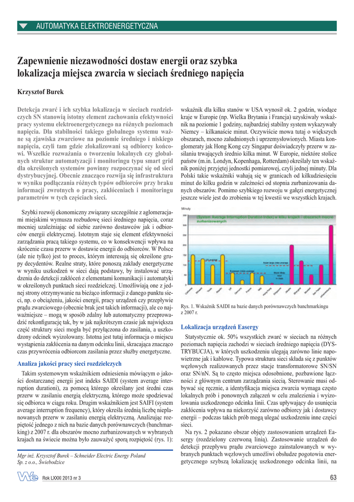 AUTOMATYKA ELEKTROENERGETYCZNA Zapewnienie niezawodności dostaw energii oraz szybka lokalizacja miejsca zwarcia w sieciach średniego napięcia Krzysztof Burek Detekcja zwarć i ich szybka lokalizacja w sieciach rozdzielczych SN stanowią istotny element zachowania efektywności pracy systemu elektroenergetycznego na różnych poziomach napięcia. Dla stabilności takiego globalnego systemu ważne są zjawiska zwarciowe na poziomie średniego i niskiego napięcia, czyli tam gdzie zlokalizowani są odbiorcy końcowi. Wszelkie rozważania o tworzeniu lokalnych czy globalnych struktur automatyzacji i monitoringu typu smart grid dla określonych systemów powinny rozpoczynać się od sieci dystrybucyjnej. Obecnie znacząco rozwija się infrastruktura w wyniku podłączania różnych typów odbiorców przy braku informacji zwrotnych o pracy, zakłóceniach i monitoringu parametrów w tych częściach sieci. Szybki rozwój ekonomiczny związany szczególnie z aglomeracjami miejskimi wymusza rozbudowę sieci średniego napięcia, coraz mocniej uzależniając od siebie zarówno dostawców jak i odbiorców energii elektrycznej. Istotnym staje się element efektywności zarządzania pracą takiego systemu, co w konsekwencji wpływa na skrócenie czasu przerw w dostawie energii do odbiorców. W Polsce (ale nie tylko) jest to proces, którym interesują się określone grupy decydentów. Realne straty, które ponoszą zakłady energetyczne w wyniku uszkodzeń w sieci dają podstawy, by instalować urządzenia do detekcji zakłóceń z elementami komunikacji i automatyki w określonych punktach sieci rozdzielczej. Umożliwiają one z jednej strony otrzymywanie na bieżąco informacji z danego punktu sieci, np. o obciążeniu, jakości energii, pracy urządzeń czy przepływie prądu zwarciowego (obecnie brak jest takich informacji), ale co najważniejsze – mogą w sposób zdalny lub automatyczny przeprowadzić rekonfigurację tak, by w jak najkrótszym czasie jak największa część struktury sieci mogła być przyłączona do zasilania, a uszkodzony odcinek wyizolowany. Istotna jest tutaj informacja o miejscu wystąpienia zakłócenia na danym odcinku linii, skracająca znacząco czas przywrócenia odbiorcom zasilania przez służby energetyczne. Analiza jakości pracy sieci rozdzielczych Takim systemowym wskaźnikiem odniesienia mówiącym o jakości dostarczanej energii jest indeks SAIDI (system average interruption durationi), za pomocą którego określany jest średni czas przerw w zasilaniu energią elektryczną, którego może spodziewać się odbiorca w ciągu roku. Drugim wskaźnikiem jest SAIFI (system average interruption frequency), który określa średnią liczbę nieplanowanych przerw w zasilaniu energią elektryczną. Analizując rozpiętość jednego z nich na bazie danych porównawczych (banchmarking) z 2007 r. dla obszarów mocno zurbanizowanych w wybranych krajach na świecie można było zauważyć sporą rozpiętość (rys. 1): Mgr inż. Krzysztof Burek – Schneider Electric Energy Poland Sp. z o.o., Świebodzice Rok LXXXI 2013 nr 3 wskaźnik dla kilku stanów w USA wynosił ok. 2 godzin, wiodące kraje w Europie (np. Wielka Brytania i Francja) uzyskiwały wskaźnik na poziomie 1 godziny, najbardziej stabilny system wykazywały Niemcy – kilkanaście minut. Oczywiście mowa tutaj o większych obszarach, mocno zaludnionych i uprzemysłowionych. Miasta konglomeraty jak Hong Kong czy Singapur doświadczyły przerw w zasilaniu trwających średnio kilka minut. W Europie, niektóre stolice państw (m.in. Londyn, Kopenhaga, Rotterdam) określały ten wskaźnik poniżej przyjętej jednostki pomiarowej, czyli jednej minuty. Dla Polski takie wskaźniki wahają się w granicach od kilkudziesięciu minut do kilku godzin w zależności od stopnia zurbanizowania danych obszarów. Pomimo szybkiego rozwoju w gałęzi energetycznej jeszcze wiele jest do zrobienia w tej kwestii we wszystkich krajach. Rys. 1. Wskaźnik SAIDI na bazie danych porównawczych banchmarkingu z 2007 r. Lokalizacja urządzeń Easergy Statystycznie ok. 50% wszystkich zwarć w sieciach na różnych poziomach napięcia zachodzi w sieciach średniego napięcia (DYSTRYBUCJA), w których uszkodzeniu ulegają zarówno linie napowietrzne jak i kablowe. Typowa struktura sieci składa się z punktów węzłowych realizowanych przez stacje transformatorowe SN/SN oraz SN/nN. Są to często miejsca odosobnione, pozbawione łączności z głównym centrum zarządzania siecią. Sterowanie musi odbywać się ręcznie, a identyfikacja miejsca zwarcia wymaga często lokalnych prób i ponownych załączeń w celu znalezienia i wyizolowania uszkodzonego odcinka linii. Czas upływający do usunięcia zakłócenia wpływa na niekorzyść zarówno odbiorcy jak i dostawcy energii – podczas takich prób mogą ulegać uszkodzeniu inne części sieci. Na rys. 2 pokazano obszar objęty zastosowaniem urządzeń Easergy (rozdzielony czerwoną linią). Zastosowanie urządzeń do detekcji przepływu prądu zwarciowego zainstalowanych w wybranych punktach węzłowych umożliwi obsłudze pogotowia energetycznego szybszą lokalizację uszkodzonego odcinka linii, na 63 AUTOMATYKA ELEKTROENERGETYCZNA Elektrownie Elektrownie cieplne cieplne i i nuklearne nuklearne Farmy fotowoltaiczne Farmy fotowoltaiczne Farmy Farmywiatrowe wiatrowe GENERA CJA GENERACJA Małe Ma ł e i i średnie średnie hydrogeneratory hydrogeneratory Automatyka Automatyka linii linii napowietrznych napowietrznych TRANSMISJA Stacje 110kV/SN DYSTRYBUCJA Automatyka linii linii Automatyka kablowych kablowych System Nadzoru System Nadzoru Rys. 2. Lokalizacja urządzeń Easergy w sieci dystrybucyjnej SN sterowania przez operatora. Firma Schneider Electric ma także w swojej ofercie rozłączniki sterowane radiowo typu PM6 współpracujące ze sterownikami typu T200P oraz reklozerami. W państwach zachodnich założenia dotyczące wskaźników SAIDI/SAIFI są często bardzo restrykcyjn