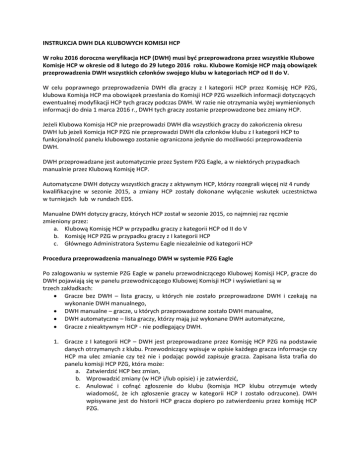 INSTRUKCJA DWH DLA KLUBOWYCH KOMISJI HCP W roku 2016 doroczna weryfikacja HCP (DWH) musi być przeprowadzona przez wszystkie Klubowe Komisje HCP w okresie od 8 lutego do 29 lutego 2016 roku. Klubowe Komisje HCP mają obowiązek przeprowadzenia DWH wszystkich członków swojego klubu w kategoriach HCP od II do V. W celu poprawnego przeprowadzenia DWH dla graczy z I kategorii HCP przez Komisję HCP PZG, klubowa Komisja HCP ma obowiązek przesłania do Komisji HCP PZG wszelkich informacji dotyczących ewentualnej modyfikacji HCP tych graczy podczas DWH. W razie nie otrzymania wyżej wymienionych informacji do dnia 1 marca 2016 r., DWH tych graczy zostanie przeprowadzone bez zmiany HCP. Jeżeli Klubowa Komisja HCP nie przeprowadzi DWH dla wszystkich graczy do zakończenia okresu DWH lub jeżeli Komicja HCP PZG nie przeprowadzi DWH dla członków klubu z I kategorii HCP to funkcjonalność panelu klubowego zostanie ograniczona jedynie do możliwości przeprowadzenia DWH. DWH przeprowadzane jest automatycznie przez System PZG Eagle, a w niektórych przypadkach manualnie przez Klubową Komisję HCP. Automatyczne DWH dotyczy wszystkich graczy z aktywnym HCP, którzy rozegrali więcej niż 4 rundy kwalifikacyjne w sezonie 2015, a zmiany HCP zostały dokonane wyłącznie wskutek uczestnictwa w turniejach lub w rundach EDS. Manualne DWH dotyczy graczy, których HCP został w sezonie 2015, co najmniej raz ręcznie zmieniony przez: a. Klubową Komisję HCP w przypadku graczy z kategorii HCP od II do V b. Komisję HCP PZG w przypadku graczy z I kategorii HCP c. Głównego Administratora Systemu Eagle niezależnie od kategorii HCP Procedura przeprowadzenia manualnego DWH w systemie PZG Eagle Po zalogowaniu w systemie PZG Eagle w panelu przewodniczącego Klubowej Komisji HCP, gracze do DWH pojawiają się w panelu przewodniczącego Klubowej Komisji HCP i wyświetlani są w trzech zakładkach: Gracze bez DWH – lista graczy, u których nie zostało przeprowadzone DWH i czekają na wykonanie DWH manualnego, DWH manualne – gracze, u których przeprowadzone zostało DWH manualne, DWH automatyczne – lista graczy, którzy mają już wykonane DWH automatyczne, Gracze z nieaktywnym HCP - nie podlegający DWH. 1. Gracze z I kategorii HCP – DWH jest przeprowadzane przez Komisję HCP PZG na podstawie danych otrzymanych z klubu. Przewodniczący wpisuje w opisie każdego gracza informacje czy HCP ma ulec zmianie czy też nie i podając powód zapisuje gracza. Zapisana lista trafia do panelu komisji HCP PZG, która może: a. Zatwierdzić HCP bez zmian, b. Wprowadzić zmiany (w HCP i/lub opisie) i je zatwierdzić, c. Anulować i cofnąć zgłoszenie do klubu (komisja HCP klubu otrzymuje wtedy wiadomość, że ich zgłoszenie graczy w kategorii HCP I zostało odrzucone). DWH wpisywane jest do historii HCP gracza dopiero po zatwierdzeniu przez komisję HCP PZG. 2. W przypadku graczy, u których w ciągu minionego roku nastąpiła manualna zmiana HCP, DWH przeprowadza Klubowa Komisja HCP. Dla takich osób DWH przeprowadzane jest indywidualnie i dla każdej z nich należy zadecydować o modyfikacji HCP lub pozostawieniu go bez zmian. W opisie należy wpisać powód takiej decyzji. HCP gracza może być podczas DWH pozostawiony bez zmian, lub zmodyfikowany o co najmniej 1 pełny punkt HCP. Brak wpisanego powodu blokuje możliwość zatwierdzenie gracza. Lista zatwierdzeń manualnych trafia do Komisji HCP PZG, która może sprawdzić zasadność każdej decyzji. Przykłady opisów: Przykład 1: Zmiana +1, medyczne (oznacza podniesienie HCP o 1 punkt z udokumentowanych powodów medycznych [dokumenty do wglądu w klubowej Komisji HCP]); Przykład 2: B.z. (oznacza bez zmian); Przykład 3: Zmiana -1, turnieje zagraniczne (obniżenie HCP o 1 punkt na podstawie udokumentowanych wyników z turniejów zagranicznych niezgłoszonych wcześniej przez gracza). Gracze z nieaktywnymi HCP nie podlegają DWH i nie są zamieszczeni na liście. Gracze, których HCP końcowy w ciągu roku jest niższy niż początkowy, nie mogą mieć manualnie podnoszonego HCP podczas DWH. Gracze, którzy w ciągu roku osiągnęli maksymalne podniesienie HCP na skutek rund kwalifikacyjnych, mogą podczas DWH podlegać dodatkowemu podniesieniu HCP zgodnie z algorytmem DWH. Po zakończeniu DWH w klubie, na panelu komisji HCP klubu, pojawi się komunikat z przyciskiem „Wygeneruj Raport”, który sygnalizuje, że DWH zostało zakończone. Raport generuje się do zakładki „Raporty DWH” w zakładce „Ustawienia” w panelu klubowym i pozostaje do wglądu lub wydruku. Następnie Komisja HCP klubu zapisuje raport do formatu PDF i przesyła do komisji HCP PZG. Po przeprowadzeniu DWH we wszystkich klubach zrzeszonych, na panelu komisji HCP PZG pojawia się komunikat „Wygeneruj łączny raport DWH za rok …”. Po wygenerowaniu, raport automatycznie zapisuje się do pod-zakładki „Raporty DWH” w zakładce „Ustawienia” w panelu Administratora PZG i pozostaje do wglądu lub wydruku. EGA może od PZG zażądać przesłania łącznego raportu rocznego DWH w celach referencyjnych. Wszelkie szczegóły dotyczące procedur DWH znajdują się w zakładce „Opis systemu HCP EGA” (załącznik C, str. 60)