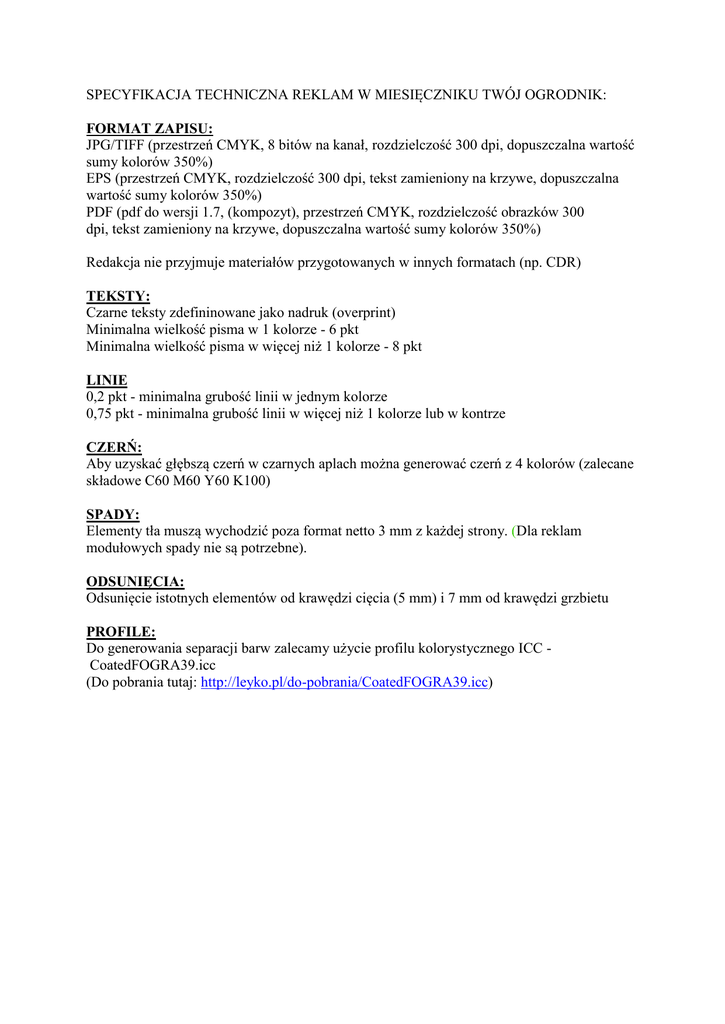 SPECYFIKACJA TECHNICZNA REKLAM W MIESIĘCZNIKU TWÓJ OGRODNIK: FORMAT ZAPISU: JPG/TIFF (przestrzeń CMYK, 8 bitów na kanał, rozdzielczość 300 dpi, dopuszczalna wartość sumy kolorów 350%) EPS (przestrzeń CMYK, rozdzielczość 300 dpi, tekst zamieniony na krzywe, dopuszczalna wartość sumy kolorów 350%) PDF (pdf do wersji 1.7, (kompozyt), przestrzeń CMYK, rozdzielczość obrazków 300 dpi, tekst zamieniony na krzywe, dopuszczalna wartość sumy kolorów 350%) Redakcja nie przyjmuje materiałów przygotowanych w innych formatach (np. CDR) TEKSTY: Czarne teksty zdefininowane jako nadruk (overprint) Minimalna wielkość pisma w 1 kolorze - 6 pkt Minimalna wielkość pisma w więcej niż 1 kolorze - 8 pkt LINIE 0,2 pkt - minimalna grubość linii w jednym kolorze 0,75 pkt - minimalna grubość linii w więcej niż 1 kolorze lub w kontrze CZERŃ: Aby uzyskać głębszą czerń w czarnych aplach można generować czerń z 4 kolorów (zalecane składowe C60 M60 Y60 K100) SPADY: Elementy tła muszą wychodzić poza format netto 3 mm z każdej strony. (Dla reklam modułowych spady nie są potrzebne). ODSUNIĘCIA: Odsunięcie istotnych elementów od krawędzi cięcia (5 mm) i 7 mm od krawędzi grzbietu PROFILE: Do generowania separacji barw zalecamy użycie profilu kolorystycznego ICC CoatedFOGRA39.icc (Do pobrania tutaj: http://leyko.pl/do-pobrania/CoatedFOGRA39.icc)
