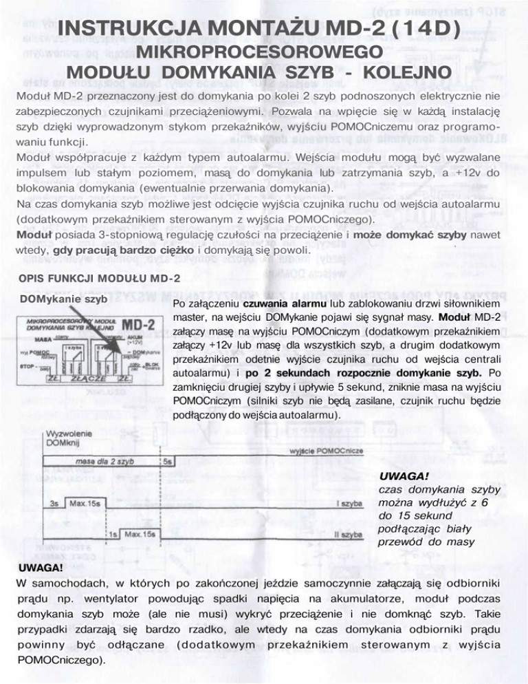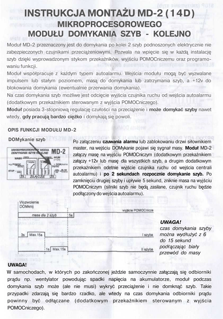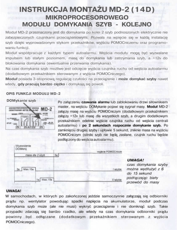 INSTRUKCJA MONTAŻU MD-2 (14D) MIKROPROCESOROWEGO MODUŁU DOMYKANIA SZYB - KOLEJNO Moduł MD-2 przeznaczony jest do domykania po kolei 2 szyb podnoszonych elektrycznie nie zabezpieczonych czujnikami przeciążeniowymi. Pozwala na wpięcie się w każdą instalację szyb dzięki wyprowadzonym stykom przekaźników, wyjściu POMOCniczemu oraz programowaniu funkcji. Moduł współpracuje z każdym typem autoalarmu. Wejścia modułu mogą być wyzwalane impulsem lub stałym poziomem, masą do domykania lub zatrzymania szyb, a +12v do blokowania domykania (ewentualnie przerwania domykania). Na czas domykania szyb możliwe jest odcięcie wyjścia czujnika ruchu od wejścia autoalarmu (dodatkowym przekaźnikiem sterowanym z wyjścia POMOCniczego). Moduł posiada 3-stopniową regulację czułości na przeciążenie i może domykać szyby nawet wtedy, gdy pracują bardzo ciężko i domykają się powoli. OPIS FUNKCJI MODUŁU MD-2 DOMykanie szyb Po załączeniu czuwania alarmu lub zablokowaniu drzwi siłownikiem master, na wejściu DOMykanie pojawi się sygnał masy. Moduł MD-2 załączy masę na wyjściu POMOCniczym (dodatkowym przekaźnikiem załączy +12v lub masę dla wszystkich szyb, a drugim dodatkowym przekaźnikiem odetnie wyjście czujnika ruchu od wejścia centrali autoalarmu) i po 2 sekundach rozpocznie domykanie szyb. Po zamknięciu drugiej szyby i upływie 5 sekund, zniknie masa na wyjściu POMOCniczym (silniki szyb nie będą zasilane, czujnik ruchu będzie podłączony do wejścia autoalarmu). UWAGA! czas domykania szyby można wydłużyć z 6 do 15 sekund podłączając biały przewód do masy UWAGA! W samochodach, w których po zakończonej jeździe samoczynnie załączają się odbiorniki prądu np. wentylator powodując spadki napięcia na akumulatorze, moduł podczas domykania szyb może (ale nie musi) wykryć przeciążenie i nie domknąć szyb. Takie przypadki zdarzają się bardzo rzadko, ale wtedy na czas domykania odbiorniki prądu powinny być odłączane (dodatkowym przekaźnikiem sterowanym z wyjścia POMOCniczego). STOP (zatrzymanie szyb) Zatrzymanie szyb (przerwanie domykania) nastąpi, gdy na wejściu STOP pojawi się sygnał masy - po wyłączeniu czuwania alarmu. Zakończenie domykania szyb nastąpi po ponownym wywołaniu DOMknij. Jeśli wejście STOP (przewód biały) będzie podłączone na stałe - lub przez styki siłownika master - do masy, to funkcja STOP nie będzie działać, natomiast wydłuży się czas domykania szyb. BLOKowanie domykania lub przerwanie domykania Funkcja przydatna, gdy moduł raz ma domykać szyby a Innym razem nie. Jeśli ma nie domykać trzeba na chwilę podać +12v na wejście BLOKowanie i następnie - w ciągu 15 sekund wysterować wejście DOMykanie (szyby pozostaną niezamknięte). W przypadku podłączenia wejścia BLOKowanie do +12v po stacyjce, po przekręceniu kluczyka w stacyjce (np. w czasie jazdy) moduł nie będzie domykał szyb, pomimo wysterowania wejścia DOMknij. PRZYKŁADY PODŁĄCZENIA MODUŁU Z WYKORZYSTANIEM WSZYSTKICH FUNKCJI Przykład I Domykanie 2 szyb po kolei - sterowanie silnikiem na jednym przewodzie (+12v) STEROWNIK CENT. ZAMKA. np. ST-31 Silnik mechanizmu szyby + U - Przewód do silnika na którym przy zamykaniu szyby pojawia się +12V Przykład II Domykanie 2 szyb po kolei - sterowanie silnikiem na dwóch przewodach (sterowanie masą kolejno, a +12v jednocześnie dla dwóch silników szyb) -U - Przewód do silnika na którym przy zamykaniu szyby pojawia się masa BARDZO WAŻNE!!! Przed sprawdzeniem domykania warto sprawdzić stan naładowania akumulatora (nowe samochody sprzedawane w salonach najczęściej mają rozładowane akumulatory) i ewentualnie doładować. W codziennej eksploatacji nie ma to juź znaczenia. Moduł MD-2 można zastosować w każdym samochodzie dzięki regulacji czułości na przeciążenie. Przy montażu modułu w nowych samochodach pętelka czerwona pozostaje zwarta (czułość standardowa np. dla Renault Kangoo). W kilkuletnich samochodach i nie doładowanych akumulatorach lub przy klinujących się szybach konieczne jest zmniejszenie czułości przecina się pętelkę czerwoną i pętelkę szarą (wewnątrz modułu - trzeba otworzyć moduł). Przy dobrym akumulatorze, gdy moduł MD-2 nie reaguje na spadek napięcia, można zmienić próg zadziałania przeciążenia (zwiększyć czułość) przecinając czerwoną pętelkę. pętelka pętelka czerwona Gdy moduł za szybko reaguje na spadek napięcia należy zmniejszyć czułość przecinając dwie pętle, szarą i czerwoną umieszczone wewnątrz modułu. Przykład III Domykanie 2 szyb po kolei - sterowanie jedne] szyby +12v, a drugiej szyby masą i +12v, np. w Renault Jak widać na rysunku do sterowania na dwóch przewodach silnika podnośnika szyby konieczne jest podłączenie dodatkowego przekaźnika sterowanego z wyjścia POMOCniczego. Łatwiejszym rozwiązaniem w tym przypadku jest użycie modułu MD-14 (zamiast MD-2). UWAGI PRAKTYCZNE Zasilanie modułu należy przylutować do przewodów idących bezpośrednio od akumulatora (przewód czerwony do +12v, a przewód czarny do przewodu podającego masę na słupek karoserii wewnątrz kabiny). Takie podłączenie gwarantuje, że moduł będzie reagował na spadki napięcia na akumulatorze spowodowane obciążeniem silnika szyby, a nie na spadki napięcia w instalacji. Instalację między silnikami szyb a wiązką (od przekaźników w module) zalecamy wykonać dość grubym przewodem (np.1,5). Nie wolno zapominać o bezpiecznikach zabezpieczających silniki podnośników szyb. Przed sprawdzeniem domykania szyb najlepiej szyby opuścić przy pracującym silniku samochodu. W nie których przypadkach może mieć to duże znaczenie, gdyż moduł MD-2 porównuje napięcie przed domykaniem z napięciem w trakcie domykania. Gdy napięcie na nie obciążonym akumulatorze spadnie bardzo nisko moduł może nie wychwycić spadku napięcia pomimo zwiększonej czułości (pętelka czerwona przec