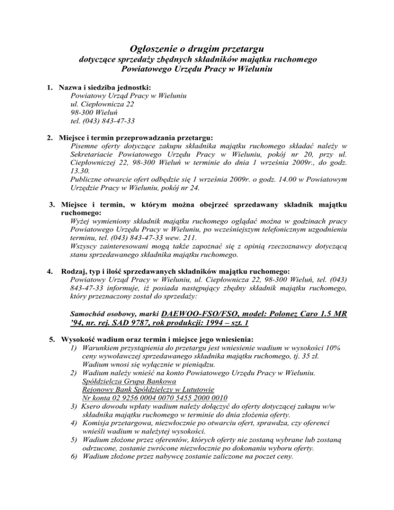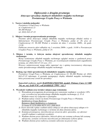 Ogłoszenie o drugim przetargu dotyczące sprzedaŜy zbędnych składników majątku ruchomego Powiatowego Urzędu Pracy w Wieluniu 1. Nazwa i siedziba jednostki: Powiatowy Urząd Pracy w Wieluniu ul. Ciepłownicza 22 98-300 Wieluń tel. (043) 843-47-33 2. Miejsce i termin przeprowadzania przetargu: Pisemne oferty dotyczące zakupu składnika majątku ruchomego składać naleŜy w Sekretariacie Powiatowego Urzędu Pracy w Wieluniu, pokój nr 20, przy ul. Ciepłowniczej 22, 98-300 Wieluń w terminie do dnia 1 września 2009r., do godz. 13.30. Publiczne otwarcie ofert odbędzie się 1 września 2009r. o godz. 14.00 w Powiatowym Urzędzie Pracy w Wieluniu, pokój nr 24. 3. Miejsce i termin, w którym moŜna obejrzeć sprzedawany składnik majątku ruchomego: WyŜej wymieniony składnik majątku ruchomego oglądać moŜna w godzinach pracy Powiatowego Urzędu Pracy w Wieluniu, po wcześniejszym telefonicznym uzgodnieniu terminu, tel. (043) 843-47-33 wew. 211. Wszyscy zainteresowani mogą takŜe zapoznać się z opinią rzeczoznawcy dotyczącą stanu sprzedawanego składnika majątku ruchomego. 4. Rodzaj, typ i ilość sprzedawanych składników majątku ruchomego: Powiatowy Urząd Pracy w Wieluniu, ul. Ciepłownicza 22, 98-300 Wieluń, tel. (043) 843-47-33 informuje, iŜ posiada następujący zbędny składnik majątku ruchomego, który przeznaczony został do sprzedaŜy: Samochód osobowy, marki DAEWOO-FSO/FSO, model: Polonez Caro 1.5 MR ’94, nr. rej. SAD 9787, rok produkcji: 1994 – szt. 1 5. Wysokość wadium oraz termin i miejsce jego wniesienia: 1) Warunkiem przystąpienia do przetargu jest wniesienie wadium w wysokości 10% ceny wywoławczej sprzedawanego składnika majątku ruchomego, tj. 35 zł. Wadium wnosi się wyłącznie w pieniądzu. 2) Wadium naleŜy wnieść na konto Powiatowego Urzędu Pracy w Wieluniu. Spółdzielcza Grupa Bankowa Rejonowy Bank Spółdzielczy w Lututowie Nr konta 02 9256 0004 0070 5455 2000 0010 3) Ksero dowodu wpłaty wadium naleŜy dołączyć do oferty dotyczącej zakupu w/w składnika majątku ruchomego w terminie do dnia złoŜenia oferty. 4) Komisja przetargowa, niezwłocznie po otwarciu ofert, sprawdza, czy oferenci wnieśli wadium w naleŜytej wysokości. 5) Wadium złoŜone przez oferentów, których oferty nie zostaną wybrane lub zostaną odrzucone, zostanie zwrócone niezwłocznie po dokonaniu wyboru oferty. 6) Wadium złoŜone przez nabywcę zostanie zaliczone na poczet ceny. 7) Wadium nie podlega zwrotowi w przypadku, gdy: a) Ŝaden z uczestników przetargu nie zaoferuje co najmniej ceny wywoławczej; b) uczestnik przetargu, który wygrał przetarg, uchyli się od zawarcia umowy. 6. Cena wywoławcza: - 350 zł brutto Podana cena jest ceną wywoławczą, ustaloną zgodnie z „Instrukcją w sprawie sposobu i trybu gospodarowania składnikami majątku ruchomego powierzonego jednostkom organizacyjnym powiatu”. 7. Wymagania, jakim powinna odpowiadać oferta: Oferta pisemna powinna zawierać: 1) imię, nazwisko i adres lub nazwę (firmę) i siedzibę oferenta; 2) oferowaną cenę, która nie moŜe być niŜsza niŜ podana w pkt 6 niniejszego ogłoszenia cena wywoławcza i warunki jej zapłaty; 3) oświadczenie oferenta, Ŝe zapoznał się ze stanem przedmiotu przetargu; 4) kserokopia wpłaty wadium. 8. Termin, miejsce, tryb złoŜenia oferty. Oferty składać naleŜy w zamkniętych kopertach opatrzonych dopiskiem „Oferta na zakup samochodu - nie otwierać przed 01.09.2009r. godz. 14.00.” Publiczne otwarcie ofert odbędzie się dnia 01.09.2009r. o godz. 14.00 w Powiatowym Urzędzie Pracy w Wieluniu, pokój nr 24. Oferta jest wiąŜąca przez okres 30 dni od dnia złoŜenia oferty. 9. Organizatorowi przetargu przysługuje prawo zamknięcia przetargu bez wybrania którejkolwiek z ofert. 10. Informacje dotyczące odrzucenia oferty. Komisja odrzuca ofertę, jeŜeli: 1) została złoŜona po wyznaczonym terminie, w niewłaściwym miejscu lub przez osobę, która nie wniosła wadium; 2) nie zawiera danych , o których mowa w pkt 7, lub dane te są niekompletne, nieczytelne lub budzą inną wątpliwość, zaś złoŜenie wyjaśnień mogłoby prowadzić do uznania jej za nową ofertę; 3) uczestnik przetargu nie zaoferował co najmniej ceny wywoławczej. 11. Informacje dodatkowe. Zbędny składnik majątku ruchomego sprzedany zostanie osobie/podmiotowi, który zaoferuje najwyŜszą cenę. W razie ustalenia, Ŝe kilku oferentów zaoferowało tę samą cenę, komisja przetargowa postanawia o kontynuowaniu przetargu w formie aukcji między tymi oferentami. Umowę sprzedaŜy w trybie przetargu uwaŜa się za zawartą z chwilą otrzymania przez oferenta zawiadomienia o przyjęciu jego oferty. Nabywca jest zobowiązany zapłacić cenę nabycia w terminie wyznaczonym przez prowadzącego przetarg nie dłuŜszym niŜ 7 dni. Wydanie przedmiotu sprzedaŜy nabywcy następuje niezwłocznie po zapłaceniu ceny nabycia.