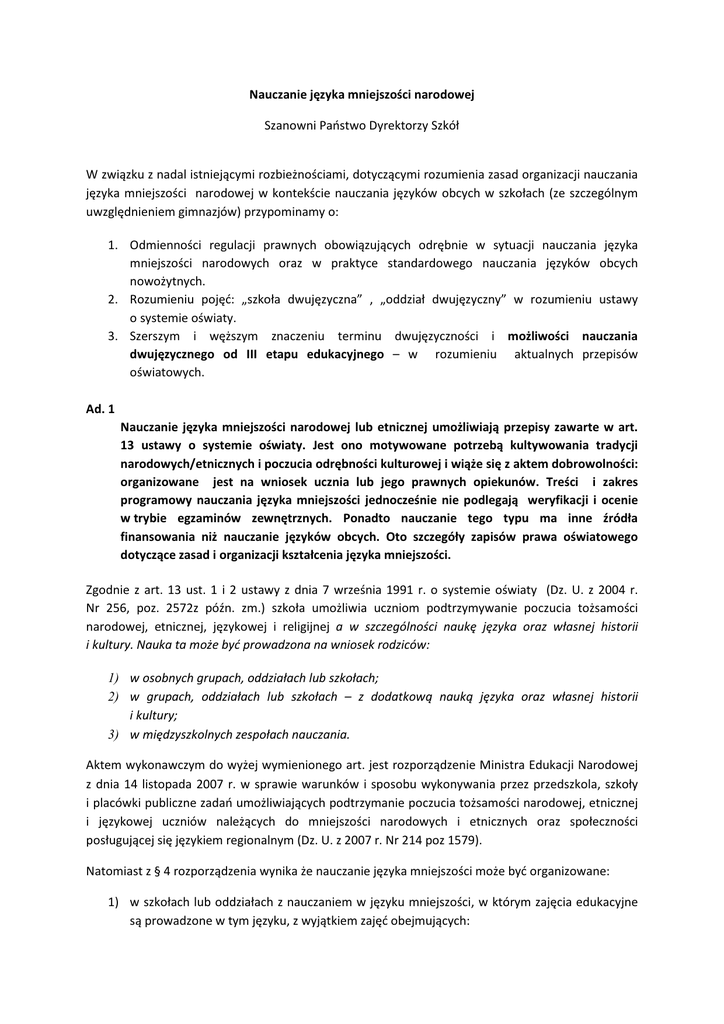 Nauczanie języka mniejszości narodowej Szanowni Państwo Dyrektorzy Szkół W związku z nadal istniejącymi rozbieżnościami, dotyczącymi rozumienia zasad organizacji nauczania języka mniejszości narodowej w kontekście nauczania języków obcych w szkołach (ze szczególnym uwzględnieniem gimnazjów) przypominamy o: 1. Odmienności regulacji prawnych obowiązujących odrębnie w sytuacji nauczania języka mniejszości narodowych oraz w praktyce standardowego nauczania języków obcych nowożytnych. 2. Rozumieniu pojęć: „szkoła dwujęzyczna” , „oddział dwujęzyczny” w rozumieniu ustawy o systemie oświaty. 3. Szerszym i węższym znaczeniu terminu dwujęzyczności i możliwości nauczania dwujęzycznego od III etapu edukacyjnego – w rozumieniu aktualnych przepisów oświatowych. Ad. 1 Nauczanie języka mniejszości narodowej lub etnicznej umożliwiają przepisy zawarte w art. 13 ustawy o systemie oświaty. Jest ono motywowane potrzebą kultywowania tradycji narodowych/etnicznych i poczucia odrębności kulturowej i wiąże się z aktem dobrowolności: organizowane jest na wniosek ucznia lub jego prawnych opiekunów. Treści i zakres programowy nauczania języka mniejszości jednocześnie nie podlegają weryfikacji i ocenie w trybie egzaminów zewnętrznych. Ponadto nauczanie tego typu ma inne źródła finansowania niż nauczanie języków obcych. Oto szczegóły zapisów prawa oświatowego dotyczące zasad i organizacji kształcenia języka mniejszości. Zgodnie z art. 13 ust. 1 i 2 ustawy z dnia 7 września 1991 r. o systemie oświaty (Dz. U. z 2004 r. Nr 256, poz. 2572z późn. zm.) szkoła umożliwia uczniom podtrzymywanie poczucia tożsamości narodowej, etnicznej, językowej i religijnej a w szczególności naukę języka oraz własnej historii i kultury. Nauka ta może być prowadzona na wniosek rodziców: 1) w osobnych grupach, oddziałach lub szkołach; 2) w grupach, oddziałach lub szkołach – z dodatkową nauką języka oraz własnej historii i kultury; 3) w międzyszkolnych zespołach nauczania. Aktem wykonawczym do wyżej wymienionego art. jest rozporządzenie Ministra Edukacji Narodowej z dnia 14 listopada 2007 r. w sprawie warunków i sposobu wykonywania przez przedszkola, szkoły i placówki publiczne zadań umożliwiających podtrzymanie poczucia tożsamości narodowej, etnicznej i językowej uczniów należących do mniejszości narodowych i etnicznych oraz społeczności posługującej się językiem regionalnym (Dz. U. z 2007 r. Nr 214 poz 1579). Natomiast z § 4 rozporządzenia wynika że nauczanie języka mniejszości może być organizowane: 1) w szkołach lub oddziałach z nauczaniem w języku mniejszości, w którym zajęcia edukacyjne są prowadzone w tym języku, z wyjątkiem zajęć obejmujących: a) w szkole podstawowej: w I etapie edukacyjnym – kształcenie zintegrowane w zakresie treści nauczania języka polskiego; w II etapie edukacyjnym – język polski oraz część historii i społeczeństwa dotyczącą historii Polski, 2) w szkołach lub oddziałach, w których zajęcia edukacyjne są prowadzone w dwóch językach: polskim oraz języku mniejszości, będącym drugim językiem nauczania; 3) w szkołach lub oddziałach z dodatkową nauką języka mniejszości, prowadzoną w formie odrębnych zajęć, w których zajęcia edukacyjne są prowadzone w języku polskim, z wyjątkiem zajęć z języka mniejszości; 4) w międzyszkolnych zespołach nauczania języka mniejszości. Rozwijając bardziej szczegółowo powyższe zagadnienie, z przepisów oświatowych wynika, co następuje. Zgodnie z obowiązującymi przepisami ustawowymi uczeń należący do mniejszości narodowej ma prawo oczekiwać od szkoły, aby zapewniła mu dodatkowe zajęcia służące jego podtrzymaniu tożsamości narodowej, kulturowej i językowej. Udział w tych zajęciach jest dobrowolny i wiąże się z subiektywnie odczuwanym poczuciem własnej odrębności i chęci jej podtrzymania. Wpływa to na charakter przedmiotu, jakim jest język mniejszości narodowej lub etnicznej – jest to przedmiot dodatkowy o szczególnej specyfice, służący wyrażeniu i podtrzymaniu własnej tożsamości językowej i kulturowej, a więc wkraczający w obszar suwerennych decyzji ucznia i jego rodziców. Na określenie charakteru przedmiotu „język mniejszości narodowej lub etnicznej” nie ma wpływu stopień znajomości tego języka wynoszony przez ucznia z domu. W wielu przypadkach językiem tym posługują się uczniowie w środowisku rodzinnym, zdarza się jednak, że znajomość języka mniejszości zanikła w starszych pokoleniach i uczeń rozpoczyna jego naukę od podstaw. Ze względu na charakter tego przedmiotu język mniejszości narodowej lub etnicznej nie może być wykorzystany do badań, w oparciu o wyniki egzaminu gimnazjalnego, kompetencji językowych uczniów w polskich szkołach publicznych w zakresie znajomości języków obcych nowożytnych. Nauka drugiego języka obcego nowożytnego obowiązuje wszystkich uczniów gimnazjum i nie ma podstaw do wprowadzenia odrębnych zasad dla wybranej grupy uczniów. Jest natomiast możliwe, aby uczeń gimnazjum, który uczy się języka niemieckiego jako jednego z dwóch języków obcych nowożytnych, złożył jednocześnie pisemny wniosek w sprawie udziału – w ramach podtrzymywania swojej tożsamości narodowej – w zajęciach z języka niemieckiego jako języka mniejszości (zgodnie z przepisami § 2 rozporządzenia Ministra Edukacji Narodowej z dnia 14 listopada 2007 r. w sprawie warunków i sposobu wykonywania przez przedszkola, szkoły i placówki publiczne zadań umożliwiających podtrzymywanie poczucia tożsamości narodowej, etnicznej i językowej uczniów należących do mniejszości narodowych i etnicznych oraz społeczności posługującej się językiem regionalnym – Dz. U. z 2007 r. Nr 214, poz. 1579). W takiej sytuacji szkoła jest zobowiązana zorganizować zajęcia z języka niemieckiego jako j