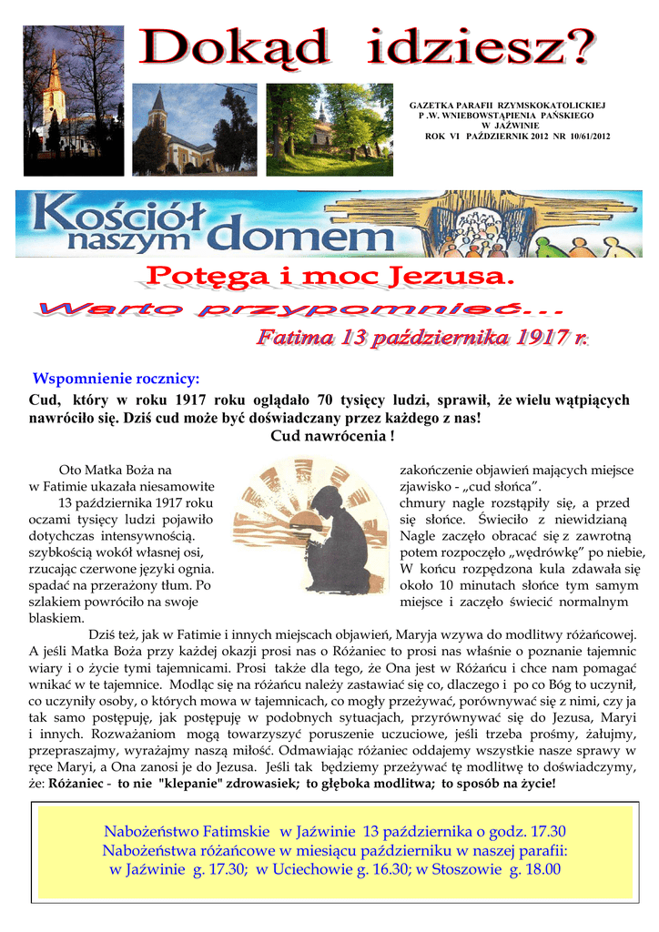 GAZETKA PARAFII RZYMSKOKATOLICKIEJ P .W. WNIEBOWSTĄPIENIA PAŃSKIEGO W JAŹWINIE ROK VI PAŹDZIERNIK 2012 NR 10/61/2012 Wspomnienie rocznicy: Cud, który w roku 1917 roku oglądało 70 tysięcy ludzi, sprawił, Ŝe wielu wątpiących nawróciło się. Dziś cud moŜe być doświadczany przez kaŜdego z nas! Cud nawrócenia ! Oto Matka BoŜa na zakończenie objawień mających miejsce w Fatimie ukazała niesamowite zjawisko - „cud słońca”. 13 października 1917 roku chmury nagle rozstąpiły się, a przed oczami tysięcy ludzi pojawiło się słońce. Świeciło z niewidzianą dotychczas intensywnością. Nagle zaczęło obracać się z zawrotną szybkością wokół własnej osi, potem rozpoczęło „wędrówkę” po niebie, rzucając czerwone języki ognia. W końcu rozpędzona kula zdawała się spadać na przeraŜony tłum. Po około 10 minutach słońce tym samym szlakiem powróciło na swoje miejsce i zaczęło świecić normalnym blaskiem. Dziś teŜ, jak w Fatimie i innych miejscach objawień, Maryja wzywa do modlitwy róŜańcowej. A jeśli Matka BoŜa przy kaŜdej okazji prosi nas o RóŜaniec to prosi nas właśnie o poznanie tajemnic wiary i o Ŝycie tymi tajemnicami. Prosi takŜe dla tego, Ŝe Ona jest w RóŜańcu i chce nam pomagać wnikać w te tajemnice. Modląc się na róŜańcu naleŜy zastawiać się co, dlaczego i po co Bóg to uczynił, co uczyniły osoby, o których mowa w tajemnicach, co mogły przeŜywać, porównywać się z nimi, czy ja tak samo postępuję, jak postępuję w podobnych sytuacjach, przyrównywać się do Jezusa, Maryi i innych. RozwaŜaniom mogą towarzyszyć poruszenie uczuciowe, jeśli trzeba prośmy, Ŝałujmy, przepraszajmy, wyraŜajmy naszą miłość. Odmawiając róŜaniec oddajemy wszystkie nasze sprawy w ręce Maryi, a Ona zanosi je do Jezusa. Jeśli tak będziemy przeŜywać tę modlitwę to doświadczymy, Ŝe: RóŜaniec - to nie "klepanie" zdrowasiek; to głęboka modlitwa; to sposób na Ŝycie! NaboŜeństwo Fatimskie w Jaźwinie 13 października o godz. 17.30 NaboŜeństwa róŜańcowe w miesiącu październiku w naszej parafii: w Jaźwinie g. 17.30; w Uciechowie g. 16.30; w Stoszowie g. 18.00 Komunia duchowa . O Najsłodszy Jezu, wierzę mocno i Ŝywo , Ŝe jesteś tu w Najświętszym Sakramencie Miłości. Pragnę najgoręcej połączyć się z Tobą, boś Ty jest moją jedyną radością, szczęściem i Ŝywotem. W tej chwili jednak nie mogę Cię przyjąć sakramentalnie, przybądź przeto duchowo do serca mego i napełnij je Twymi łaskami. Oddaję Ci, o Panie, całkowicie serce, ciało i duszę i wszystko, co posiadam, nie daj mi się nigdy rozłączyć z Tobą. Amen. 5. Dar umiejętności. Ten dar pozwala człowiekowi widzieć, Ŝe Pan Bóg działa w naszym Ŝyciu. Czyli patrząc na świat, jego piękno i ład, Ŝe to Jego dzieło. Widzę teŜ, Ŝe Bóg działa w historii mojego Ŝycia. Widzę Jego miłość. Rozumiem, Ŝe wszystko, co dobre, prawdziwe i piękne pochodzi od Niego. Świadectwo. Dar umiejętności, czyli zapraszamy do ogrodu. W czasie koncertów jestem otwarta na to, co przychodzi mi do głowy z zewnątrz – opowiada znana piosenkarka Antonina Krzystoń. Nagle zmieniam program, śpiewam piosenki, których nie wykonywałam od lat. Kiedyś na przykład wchodziłam na scenę teatru i nagle miałam taki jakby strumień światła. Uświadomiłam sobie, Ŝe ci ludzie w tym zestawieniu juŜ nigdy więcej nie przyjdą, Ŝe widzę ich pierwszy i ostatni raz. I w tym momencie skończyły się moje koncerty, a zaczęły się spotkania z ludźmi. Widzę, Ŝe wszystko jest zanurzone w Bogu. Czy ja stworzyłam swój głos? Swoją wraŜliwość? Zdolność pisania i łapania melodii? Myślę, Ŝe Pan Bóg kaŜdego zaprasza do ogrodu. Od ciebie zaleŜy jaki zrobisz bukiet, ale przecieŜ to On daje wzrost kwiatom. ( Opr. na podstawie „Małego Gościa Niedzielnego” nr 6 2012) Pielgrzymka młodzieŜy do Sanktuarium Matki BoŜej Królowej Rodzin w Wambierzycach. W kaŜdą trzecią sobotę miesiąca września młodzieŜ naszej diecezji pielgrzymuje do Sanktuarium Matki BoŜej Królowej Rodzin w Wambierzycach. W tym roku, 15.09. przybyło ponad 1500 pielgrzymów. Z naszej parafii ,w spotkaniu u Matki, uczestniczyło 20 osób. Uroczystość rozpoczęła się Eucharystią sprawowaną przez ks.bpa Adama i obecnych kapłanów. Po obiedzie młodzieŜ wysłuchała konferencji a po niej rozpoczął się koncert zespołu. MłodzieŜ świetnie się bawiła. Gdy zapadł zmrok teatr z Gliwic przedstawił spektakl pantomimy pt. Siewca, oparty na przypowieści Pana Jezusa .To radosne spotkanie zakończył Apel i po iluminacji bazyliki i z błogosławieństwem BoŜym, udzielonym przez księdza Biskupa - powróciliśmy do domu. Nasi parafianie w Strzegomiu. 16 września w Strzegomiu odbyły się diecezjalne doŜynki połączone z uroczys- Nasza delegacja w drodze na strzegomski rynek. Ks. abp Francesco Pio Tamburrino przyjmuje doŜynkowy chleb. tościami obchodów 750 – lecia powstania strzegomskiej parafii, 10 – lecia nadania kościołowi św. Piotra i Pawła w Strzegomiu tytułu Bazyliki Mniejszej oraz ogłoszenia św. Piotra i Pawła Patronami Miasta Strzegomia. Uroczystej Mszy św. przewodniczył JE ks. abp Francesco Pio Tamburrino - Sekretarz Watykańskiej Kongregacji Kultu BoŜego i Dyscypliny Sakramentów. W tych uroczystościach dekanat dzierŜoniowski, z doŜynkowym wieńcem, reprezentowali nasi parafianie: Piotr Soboń, Leokadia Soboń, Hanna Szmigiel Alicja Jach, Ewa Lisiecka. Pięknie im dziękujemy za godne reprezentowanie naszej Wspólnoty. Pięknie teŜ dziękujemy P. Radosławowi Wojciechowskiemu za wypoŜyczenie samochodu oraz P. Jackowi Kirkiewiczowi - kierowcy. NaboŜeństwo Fatimskie. 13 września 2012 r., po Mszy świętej , poświęciliśmy figurkę Matki BoŜej Fatimskiej. Jest to dar serca naszych parafian, Państwa Izabeli i Piotra Laskowskich. Przywieźli ją z Fatimy Tego właśnie dnia , 13 września 