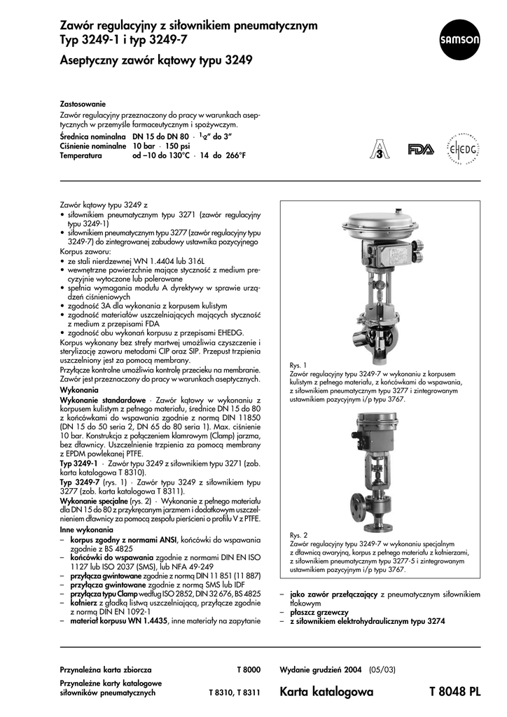 Zawór regulacyjny z si³ownikiem pneumatycznym Typ 3249-1 i typ 3249-7 Aseptyczny zawór k¹towy typu 3249 Zastosowanie Zawór regulacyjny przeznaczony do pracy w warunkach aseptycznych w przemyœle farmaceutycznym i spo¿ywczym. Œrednica nominalna DN 15 do DN 80 · 1⁄2” do 3” Ciœnienie nominalne 10 bar · 150 psi Temperatura od –10 do 130°C · 14 do 266°F Zawór k¹towy typu 3249 z • si³ownikiem pneumatycznym typu 3271 (zawór regulacyjny typu 3249-1) • si³ownikiem pneumatycznym typu 3277 (zawór regulacyjny typu 3249-7) do zintegrowanej zabudowy ustawnika pozycyjnego Korpus zaworu: • ze stali nierdzewnej WN 1.4404 lub 316L • wewnêtrzne powierzchnie maj¹ce stycznoœæ z medium precyzyjnie wytoczone lub polerowane • spe³nia wymagania modu³u A dyrektywy w sprawie urz¹dzeñ ciœnieniowych • zgodnoœæ 3A dla wykonania z korpusem kulistym • zgodnoœæ materia³ów uszczelniaj¹cych maj¹cych stycznoœæ z medium z przepisami FDA • zgodnoœæ obu wykonañ korpusu z przepisami EHEDG. Korpus wykonany bez strefy martwej umo¿liwia czyszczenie i sterylizacjê zaworu metodami CIP oraz SIP. Przepust trzpienia uszczelniony jest za pomoc¹ membrany. Przy³¹cze kontrolne umo¿liwia kontrolê przecieku na membranie. Zawór jest przeznaczony do pracy w warunkach aseptycznych. Wykonania Wykonanie standardowe · Zawór k¹towy w wykonaniu z korpusem kulistym z pe³nego materia³u, œrednice DN 15 do 80 z koñcówkami do wspawania zgodnie z norm¹ DIN 11850 (DN 15 do 50 seria 2, DN 65 do 80 seria 1). Max. ciœnienie 10 bar. Konstrukcja z po³¹czeniem klamrowym (Clamp) jarzma, bez d³awnicy. Uszczelnienie trzpienia za pomoc¹ membrany z EPDM powlekanej PTFE. Typ 3249-1 · Zawór typu 3249 z si³ownikiem typu 3271 (zob. karta katalogowa T 8310). Typ 3249-7 (rys. 1) · Zawór typu 3249 z si³ownikiem typu 3277 (zob. karta katalogowa T 8311). Wykonanie specjalne (rys. 2) · Wykonanie z pe³nego materia³u dla DN 15 do 80 z przykrêcanym jarzmem i dodatkowym uszczelnieniem d³awnicy za pomoc¹ zespo³u pierœcieni o profilu V z PTFE. Inne wykonania – korpus zgodny z normami ANSI, koñcówki do wspawania zgodnie z BS 4825 – koñcówki do wspawania zgodnie z normami DIN EN ISO 1127 lub ISO 2037 (SMS), lub NFA 49-249 – przy³¹cza gwintowane zgodnie z norm¹ DIN 11 851 (11 887) – przy³¹cza gwintowane zgodnie z norm¹ SMS lub IDF – przy³¹cza typu Clamp wed³ug ISO 2852, DIN 32 676, BS 4825 – ko³nierz z g³adk¹ listw¹ uszczelniaj¹c¹, przy³¹cze zgodnie z norm¹ DIN EN 1092-1 – materia³ korpusu WN 1.4435, inne materia³y na zapytanie – jako zawór prze³¹czaj¹cy z pneumatycznym si³ownikiem t³okowym – p³aszcz grzewczy – z si³ownikiem elektrohydraulicznym typu 3274 Przynale¿na karta zbiorcza Wydanie grudzieñ 2004 (05/03) Przynale¿ne karty katalogowe si³owników pneumatycznych T 8000 T 8310, T 8311 Rys. 1 Zawór regulacyjny typu 3249-7 w wykonaniu z korpusem kulistym z pe³nego materia³u, z koñcówkami do wspawania, z si³ownikiem pneumatycznym typu 3277 i zintegrowanym ustawnikiem pozycyjnym i/p typu 3767. Rys. 2 Zawór regulacyjny typu 3249-7 w wykonaniu specjalnym z d³awnic¹ awaryjn¹, korpus z pe³nego materia³u z ko³nierzami, z si³ownikiem pneumatycznym typu 3277-5 i zintegrowanym ustawnikiem pozycyjnym i/p typu 3767. Karta katalogowa T 8048 PL Sposób dzia³ania Medium przep³ywa przez zawór w kierunku zamykania grzyba (oznaczonym za pomoc¹ strza³ki). Po³o¿enie grzyba (3) zaworu decyduje o przep³ywie w przeœwicie miêdzy grzybem (3) i gniazdem (2) zaworu. W wykonaniu standardowym trzpieñ jest uszczelniony za pomoc¹ membrany (6.2), w wykonaniu specjalnym dodatkowo za pomoc¹ d³awnicy awaryjnej (4). W wykonaniu standardowym przy³¹cze kontrolne (4.4) s³u¿y do wzrokowej kontroli szczelnoœci. W wykonaniu specjalnym mo¿na kontrolowaæ ciœnienie lub doprowadzaæ ciecz zaporow¹ do membrany (6.2). Po³o¿enie bezpieczeñstwa W zale¿noœci od u³o¿enia sprê¿yn w si³owniku (szczegó³owe informacje zob. karta katalogowa T 8310 i T 8311) w przypadku zaniku energii zasilania zawór regulacyjny mo¿e przyjmowaæ dwa ró¿ne po³o¿enia bezpieczeñstwa: "trzpieñ si³ownika wysuwany na zewn¹trz" (FA) w przypadku zaniku energii zasilania zawór jest zamykany; "trzpieñ si³ownika wci¹gany do wewn¹trz" (FE) w przypadku zaniku energii zasilania zawór jest otwierany. 5 5.1 4.4 6.2 3 2 Rys. 3 · Zawór k¹towy typu 3249 w wykonaniu standardowym 4.4 5 4 5.1 6.2 3 Legenda do rys. 3 i 4 2 gniazdo, toczone 3 grzyb 4 d³awnica 4.4 przy³¹cze kontrolne 2 5 górna czêœæ zaworu (jarzmo) 5.1 tuleja prowadz¹ca 6.2 membrana Rys. 4 · Zawór k¹towy typu 3249 w wykonaniu specjalnym T 8048 PL Tabela 1a · Dane techniczne zaworu typu 3249 Wykonanie DIN Œrednica nominalna ANSI 1⁄ DN 15 ... 80 zob. tabela 1b Ciœnienie max. 10 bar Uszczelnienie gniazda i grzyba 1) metal na metal · miêkkie (nie dotyczy wykonania 3A) Charakterystyka sta³oprocentowa lub liniowa Stosunek regulacji Przeciek wed³ug DIN EN 1349 Nierównoœci powierzchni i sposób jej uszlachetniania ... 3” zgodnie z tabel¹ 1b Przy³¹cza Dopuszczalne temperatury 2” 150 psi 50 : 1 do DN 50 · 30 :1 od DN 65 temp. robocza –10°C ... 130°C (zob. tabela 1b) 14°F ... 266°F (zob. tabela 1b) 150°C do 30 min 300°F do 30 min temp. sterylizacji uszczelnienie metal na metal IV uszczelnienie miêkkie VI (nie dotyczy wykonania 3A lub zgodnie z przepisami EHEDG) Ra £ 1,6 mm · œrutowanie szklanymi kulkami na zewn¹trz Ra £ 0,6 mm · polerowanie Ra £ 0,8 mm · dok³adne toczenie Ra £ 0,6 mm · polerowanie wewn¹trz Ra £ 0,4 mm · polerowanie na jedwabisty po³ysk Ra £ 0,4 mm · polerowanie na wysoki po³ysk 1) zgodnoœæ z wykonaniem 3A i dla przemys³u spo¿ywczego tylko z zastosowaniem uszczelnienia metalowego Tabela 1b · Przy³¹cza, zakres roboczy dla max. ciœnieñ i temperatur Koñcówki do wspawania Przy³¹cza gwintowane Aseptyczne gwintowane po³¹czen