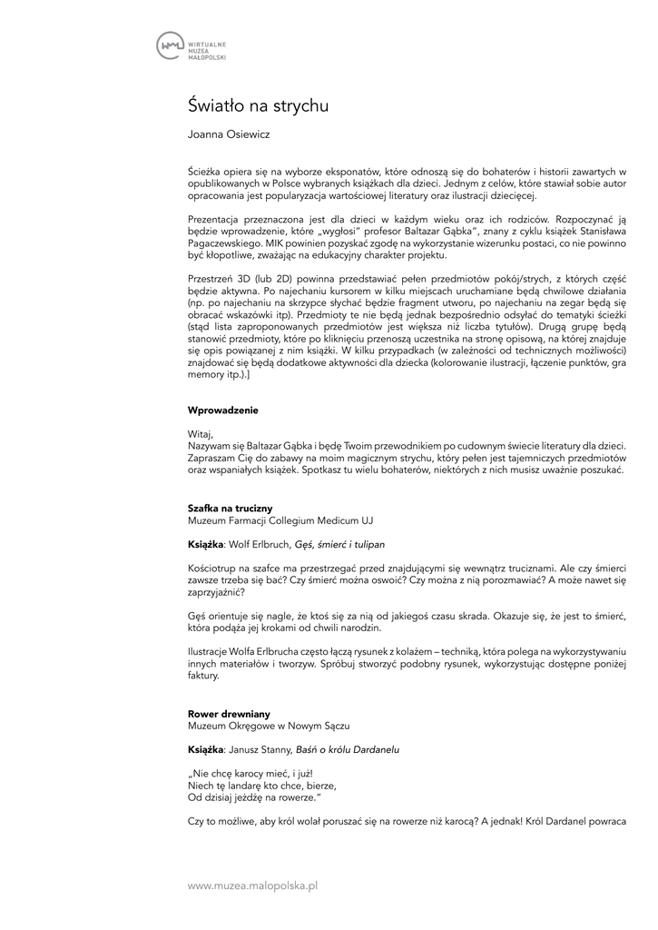 Światło na strychu Joanna Osiewicz Ścieżka opiera się na wyborze eksponatów, które odnoszą się do bohaterów i historii zawartych w opublikowanych w Polsce wybranych książkach dla dzieci. Jednym z celów, które stawiał sobie autor opracowania jest popularyzacja wartościowej literatury oraz ilustracji dziecięcej. Prezentacja przeznaczona jest dla dzieci w każdym wieku oraz ich rodziców. Rozpoczynać ją będzie wprowadzenie, które „wygłosi” profesor Baltazar Gąbka”, znany z cyklu książek Stanisława Pagaczewskiego. MIK powinien pozyskać zgodę na wykorzystanie wizerunku postaci, co nie powinno być kłopotliwe, zważając na edukacyjny charakter projektu. Przestrzeń 3D (lub 2D) powinna przedstawiać pełen przedmiotów pokój/strych, z których część będzie aktywna. Po najechaniu kursorem w kilku miejscach uruchamiane będą chwilowe działania (np. po najechaniu na skrzypce słychać będzie fragment utworu, po najechaniu na zegar będą się obracać wskazówki itp). Przedmioty te nie będą jednak bezpośrednio odsyłać do tematyki ścieżki (stąd lista zaproponowanych przedmiotów jest większa niż liczba tytułów). Drugą grupę będą stanowić przedmioty, które po kliknięciu przenoszą uczestnika na stronę opisową, na której znajduje się opis powiązanej z nim książki. W kilku przypadkach (w zależności od technicznych możliwości) znajdować się będą dodatkowe aktywności dla dziecka (kolorowanie ilustracji, łączenie punktów, gra memory itp.).] Wprowadzenie Witaj, Nazywam się Baltazar Gąbka i będę Twoim przewodnikiem po cudownym świecie literatury dla dzieci. Zapraszam Cię do zabawy na moim magicznym strychu, który pełen jest tajemniczych przedmiotów oraz wspaniałych książek. Spotkasz tu wielu bohaterów, niektórych z nich musisz uważnie poszukać. Szafka na trucizny Muzeum Farmacji Collegium Medicum UJ Książka: Wolf Erlbruch, Gęś, śmierć i tulipan Kościotrup na szafce ma przestrzegać przed znajdującymi się wewnątrz truciznami. Ale czy śmierci zawsze trzeba się bać? Czy śmierć można oswoić? Czy można z nią porozmawiać? A może nawet się zaprzyjaźnić? Gęś orientuje się nagle, że ktoś się za nią od jakiegoś czasu skrada. Okazuje się, że jest to śmierć, która podąża jej krokami od chwili narodzin. Ilustracje Wolfa Erlbrucha często łączą rysunek z kolażem – techniką, która polega na wykorzystywaniu innych materiałów i tworzyw. Spróbuj stworzyć podobny rysunek, wykorzystując dostępne poniżej faktury. Rower drewniany Muzeum Okręgowe w Nowym Sączu Książka: Janusz Stanny, Baśń o królu Dardanelu „Nie chcę karocy mieć, i już! Niech tę landarę kto chce, bierze, Od dzisiaj jeżdżę na rowerze.” Czy to możliwe, aby król wolał poruszać się na rowerze niż karocą? A jednak! Król Dardanel powraca www.muzea.malopolska.pl do zamku po bezowocnych poszukiwaniach smoka i z powodu zimnego przyjęcia przez swój dwór, zmienia się nie do poznania. Między innymi zamienia królewski płaszcz na frak, goli brodę i wsiada na rower właśnie. Pomóż królowi wydostać się z zamku. Model lokomotywy „Kraków” Muzeum Historyczne Miasta Krakowa Książka: Julian Tuwim, Lokomotywa Niewątpliwie najsłynniejszą literacką lokomotywą jest ta z wiersza Juliana Tuwima, która „stoi i sapie, dyszy i dmucha, żar z rozgrzanego jej brzucha bucha”. Klasyczne ilustracje Jana Marcina Szancera stanowią mistrzowskie dopełnienie wiersza. Przyłącz wagony do lokomotywy, aby utworzyły pełne słowo. Kapelusz Karola Wojtyły Muzeum Dom Rodzinny Ojca Świętego Jana Pawła II w Wadowicach Książka: Lewis Carroll, Alicja w krainie czarów Czy wiesz, kto w literackim świecie (oprócz prof. Gąbki oczywiście) jest najsłynniejszym miłośnikiem kapelusza? To Szalony Kapelusznik, który w Krainie Czarów gościł Alicję na bardzo dziwnym podwieczorku, a później był świadkiem w jeszcze dziwniejszym procesie o kradzież ciastek. Proces kończy się wirującą w powietrzu talią kart. Spróbuj jak najszybciej znaleźć parę do odkrytej karty. Balsaminka w kształcie ryby Muzeum Okręgowe w Nowym Sączu Książka: Janosch, Ach, jak cudowna jest Panama „– Czy wolałby pan rybę z solą i pieprzem, szanowny panie Tygrysku, czy też z cytryną i cebulką? – Ja wolałbym i to, i to – odpowiadał Tygrysek – i żeby wszystkiego było bardzo dużo.” Miś i Tygrysek są przyjaciółmi. Mieszkają w małym, przytulnym domku nad rzeką. Miś codziennie chodzi z wędką na ryby, a potem gotuje obiad, bo jest świetnym kucharzem. Pewnego dnia przyjaciele wyruszają na poszukiwanie Panamy, a po drodze przeżywają wiele niesamowitych przygód. Czy wiesz, gdzie leży Panama? Miś z Tygryskiem nie wiedzieli, ale w końcu udało im się dotrzeć tam, gdzie chcieli. Spójrz na mapę Ameryki Środkowej i spróbuj dopasować nazwy do krajów. Drewniana skrzynia malowana z szufladką Muzeum – Nadwiślański Park Etnograficzny w Wygiełzowie i Zamek Lipowiec Książka: Rien Poortvliet, Wil Huygen, Skrzaty “W drugim kącie komórki na buty od dnia ślubu stoi skrzynia panny młodej. Dostała ją w posagu. Jest wspaniale rzeźbiona i bajecznie kolorowa.” W takiej skrzyni przechowywano posag panny młodej – kołdry, poduszki, obrusy. Co jeszcze można w niej przechowywać? Prawie wszystko! Skrzaty na przykład składają w niej prezenty – owoce, bibeloty, pamiątkowe kartki z przysłowiami, którymi po swoim ślubie obdarują gości. Również i skrzacie skrzynie są często bajecznie zdobione. Pokoloruj swoją skrzynię. www.muzea.malopolska.pl Rzeźba „Chrystus na Osiołku Palmowym” Muzeum Narodowe w Krakowie Książka: Carlo Collodi, Pinokio [w przekładzie Jarosława Mikołajewskiego, il. Roberto Innocenti] „I tak zapisane jest w księgach mądrości, że wszystkie leniwe dzieci, które gwiżdżą na książki, na szkołę i nauczycieli oraz trwonią czas na