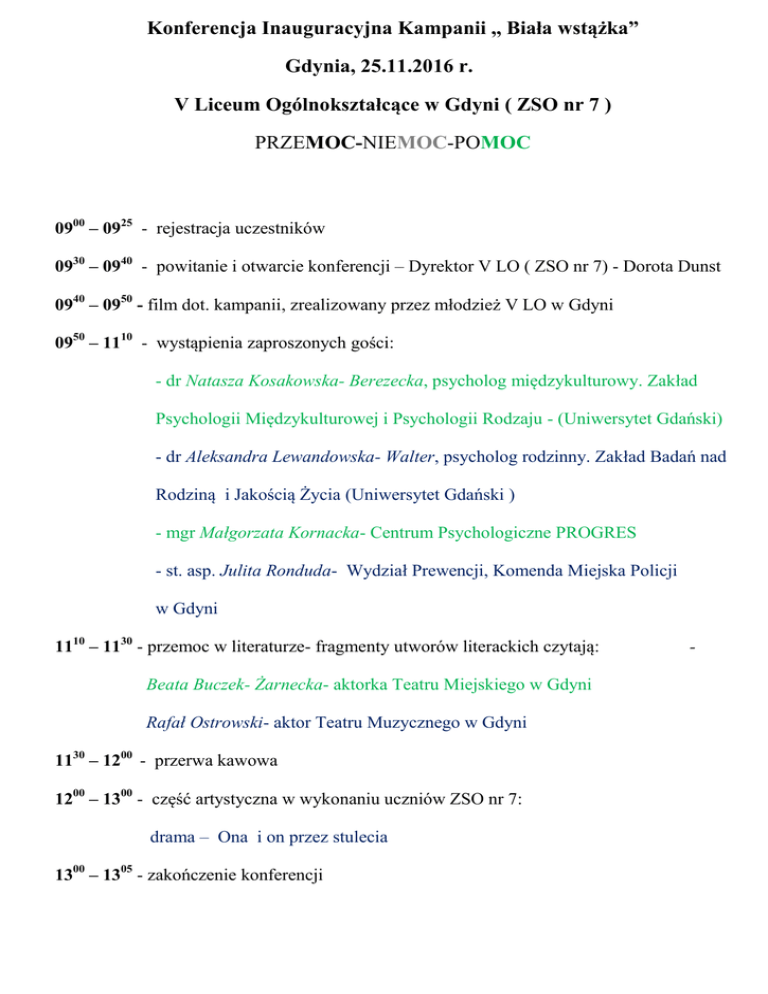 Konferencja Inauguracyjna Kampanii ,, Biała wstążka” Gdynia, 25.11.2016 r. V Liceum Ogólnokształcące w Gdyni ( ZSO nr 7 ) PRZEMOC-NIEMOC-POMOC 0900 – 0925 - rejestracja uczestników 0930 – 0940 - powitanie i otwarcie konferencji – Dyrektor V LO ( ZSO nr 7) - Dorota Dunst 0940 – 0950 - film dot. kampanii, zrealizowany przez młodzież V LO w Gdyni 0950 – 1110 - wystąpienia zaproszonych gości: - dr Natasza Kosakowska- Berezecka, psycholog międzykulturowy. Zakład Psychologii Międzykulturowej i Psychologii Rodzaju - (Uniwersytet Gdański) - dr Aleksandra Lewandowska- Walter, psycholog rodzinny. Zakład Badań nad Rodziną i Jakością Życia (Uniwersytet Gdański ) - mgr Małgorzata Kornacka- Centrum Psychologiczne PROGRES - st. asp. Julita Ronduda- Wydział Prewencji, Komenda Miejska Policji w Gdyni 1110 – 1130 - przemoc w literaturze- fragmenty utworów literackich czytają: Beata Buczek- Żarnecka- aktorka Teatru Miejskiego w Gdyni Rafał Ostrowski- aktor Teatru Muzycznego w Gdyni 1130 – 1200 - przerwa kawowa 1200 – 1300 - część artystyczna w wykonaniu uczniów ZSO nr 7: drama – Ona i on przez stulecia 1300 – 1305 - zakończenie konferencji -