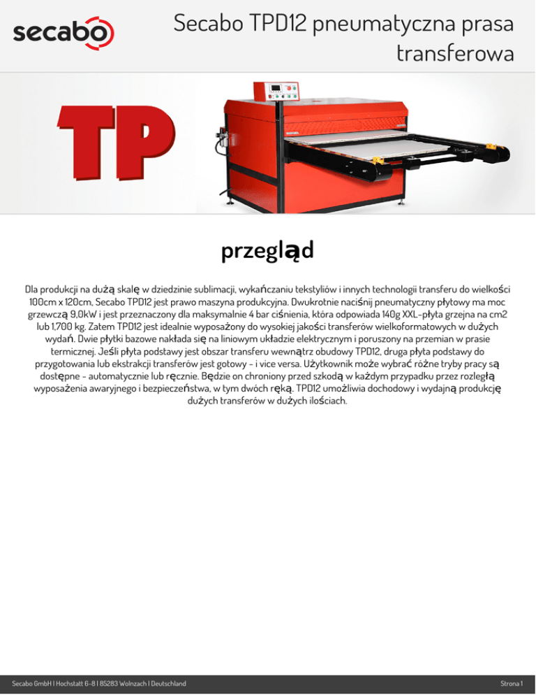 Secabo TPD12 pneumatyczna prasa transferowa przegląd Dla produkcji na dużą skalę w dziedzinie sublimacji, wykańczaniu tekstyliów i innych technologii transferu do wielkości 100cm x 120cm, Secabo TPD12 jest prawo maszyna produkcyjna. Dwukrotnie naciśnij pneumatyczny płytowy ma moc grzewczą 9,0kW i jest przeznaczony dla maksymalnie 4 bar ciśnienia, która odpowiada 140g XXL-płyta grzejna na cm2 lub 1,700 kg. Zatem TPD12 jest idealnie wyposażony do wysokiej jakości transferów wielkoformatowych w dużych wydań. Dwie płytki bazowe nakłada się na liniowym układzie elektrycznym i poruszony na przemian w prasie termicznej. Jeśli płyta podstawy jest obszar transferu wewnątrz obudowy TPD12, druga płyta podstawy do przygotowania lub ekstrakcji transferów jest gotowy - i vice versa. Użytkownik może wybrać różne tryby pracy są dostępne - automatycznie lub ręcznie. Będzie on chroniony przed szkodą w każdym przypadku przez rozległą wyposażenia awaryjnego i bezpieczeństwa, w tym dwóch ręką. TPD12 umożliwia dochodowy i wydajną produkcję dużych transferów w dużych ilościach. Secabo GmbH | Hochstatt 6-8 | 85283 Wolnzach | Deutschland Strona 1 Secabo TPD12 pneumatyczna prasa transferowa Funkcje Regulator cyfrowy Zmienne ciśnienie robocze Bezpieczna Czas i temperaturę można łatwo regulować w regulatorze cyfrowym i monitorowane. nacisk prasy można łatwo regulować dostosowując go do rodzaju tkaniny oraz metody transferu. bezpieczeństwo oraz jakość urządzenia jest kontrolowana według niemieckich standardów bezpieczeństwa. Dokładny rozkład temperatury Niska histerezy Dwa blaty Wysokiej jakości płyta grzewcza zapewnia równomierny rozkład temperatury na całej powierzchni płyty. Nowoczesne sterowanie pozwala na zminimalizowanie wachań temperatury,co zapewnia na stale dobre wyniki pracy. Dwie płyty robocze umożliwiają uzyskanie znacznie większej wydajności oraz zwiększenie ilości operacji transferowych. Otwiera się automatycznie Ten naciśnij ciepła otwiera się automatycznie po ustawionym czasie. Secabo GmbH | Hochstatt 6-8 | 85283 Wolnzach | Deutschland Strona 2 Secabo TPD12 pneumatyczna prasa transferowa Parametry techniczne Obszerna powierzchnia robocza max. Wysokość transferu Ustawienie nacisku max. nacisk maksymalna temperatura max. regulacja czasu Zasilanie prądowe Zużycie powietrza Otoczenie Wymiary Waga netto Dostawa Secabo GmbH | Hochstatt 6-8 | 85283 Wolnzach | Deutschland 2 x 100cm x 120cm 20 mm Ustawianie ciśnienia pneumatycznego 4 bar, 1700 kg 140 g/cm² 225 °C 999 s 3P + N + PE, 9.0kW. Połączenie z wymogami przez specjalistę. 170l / min maksymalna 5 ° C - + 35 ° C / 30% - 70% wilgotności 275cm x 170cm x 150cm 782 kg Prasa transferowa, kabel zasilający bez wtyczki, zestaw przyłączeniowy do sprężarki, niemiecki podręcznik Strona 3 Secabo TPD12 pneumatyczna prasa transferowa Widoki Secabo GmbH | Hochstatt 6-8 | 85283 Wolnzach | Deutschland Strona 4