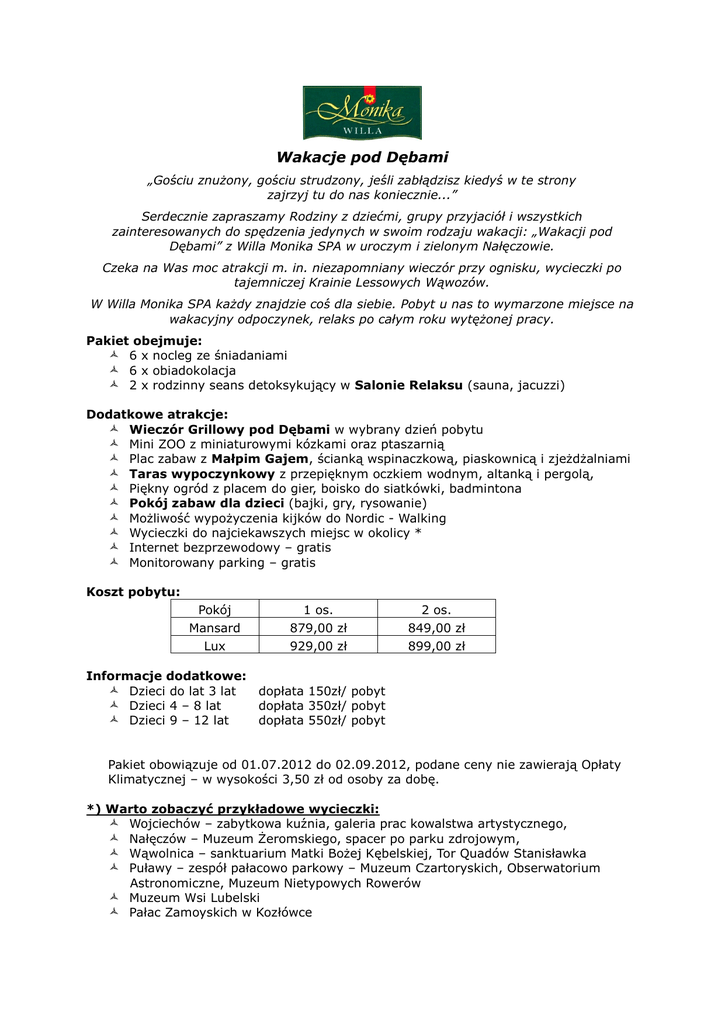 Wakacje pod Dębami „Gościu znużony, gościu strudzony, jeśli zabłądzisz kiedyś w te strony zajrzyj tu do nas koniecznie...” Serdecznie zapraszamy Rodziny z dziećmi, grupy przyjaciół i wszystkich zainteresowanych do spędzenia jedynych w swoim rodzaju wakacji: „Wakacji pod Dębami” z Willa Monika SPA w uroczym i zielonym Nałęczowie. Czeka na Was moc atrakcji m. in. niezapomniany wieczór przy ognisku, wycieczki po tajemniczej Krainie Lessowych Wąwozów. W Willa Monika SPA każdy znajdzie coś dla siebie. Pobyt u nas to wymarzone miejsce na wakacyjny odpoczynek, relaks po całym roku wytężonej pracy. Pakiet obejmuje:  6 x nocleg ze śniadaniami  6 x obiadokolacja  2 x rodzinny seans detoksykujący w Salonie Relaksu (sauna, jacuzzi) Dodatkowe atrakcje:  Wieczór Grillowy pod Dębami w wybrany dzień pobytu  Mini ZOO z miniaturowymi kózkami oraz ptaszarnią  Plac zabaw z Małpim Gajem, ścianką wspinaczkową, piaskownicą i zjeżdżalniami  Taras wypoczynkowy z przepięknym oczkiem wodnym, altanką i pergolą,  Piękny ogród z placem do gier, boisko do siatkówki, badmintona  Pokój zabaw dla dzieci (bajki, gry, rysowanie)  Możliwość wypożyczenia kijków do Nordic - Walking  Wycieczki do najciekawszych miejsc w okolicy *  Internet bezprzewodowy – gratis  Monitorowany parking – gratis Koszt pobytu: Pokój Mansard Lux 1 os. 879,00 zł 929,00 zł 2 os. 849,00 zł 899,00 zł Informacje dodatkowe:  Dzieci do lat 3 lat dopłata 150zł/ pobyt  Dzieci 4 – 8 lat dopłata 350zł/ pobyt  Dzieci 9 – 12 lat dopłata 550zł/ pobyt Pakiet obowiązuje od 01.07.2012 do 02.09.2012, podane ceny nie zawierają Opłaty Klimatycznej – w wysokości 3,50 zł od osoby za dobę. *) Warto zobaczyć przykładowe wycieczki:  Wojciechów – zabytkowa kuźnia, galeria prac kowalstwa artystycznego,  Nałęczów – Muzeum Żeromskiego, spacer po parku zdrojowym,  Wąwolnica – sanktuarium Matki Bożej Kębelskiej, Tor Quadów Stanisławka  Puławy – zespół pałacowo parkowy – Muzeum Czartoryskich, Obserwatorium Astronomiczne, Muzeum Nietypowych Rowerów  Muzeum Wsi Lubelski  Pałac Zamoyskich w Kozłówce WILLA MONIKA SPA Zofia Śnieżyk- Matwiejczuk, Jarosław Matwiejczuk S.C. ul. Kolejowa 37, 24-140 Nałęczów NIP 716-25-50-912 Kom: 609 925 609 Tel: 81 501 51 25 Fax: 81 501 51 26 E-mail grupy zorganizowane: [email protected] E-mail goście indywidualni: [email protected]