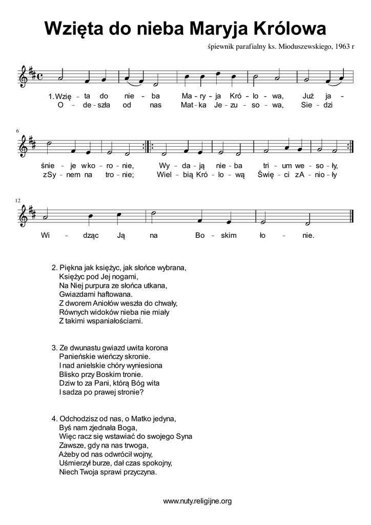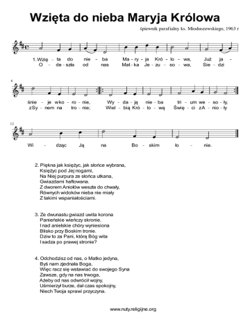Wzięta do nieba Maryja Królowa śpiewnik parafialny ks. Mioduszewskiego, 1963 r 1. Wzię O ta do de szła nie od ba nas Ma ry Mat ka ja Je Kró zu da ją bią Kró nie lo ba wą lo so wa, wa, Już Sie ja dzi 6 śnie z Sy je w ko nem na ro tro nie, nie; Wy Wiel tri Świę um we ci z A so ły, nio ły 12 Wi dząc Ją na Bo skim ło nie. 2. Piękna jak księżyc, jak słońce wybrana, Księżyc pod Jej nogami, Na Niej purpura ze słońca utkana, Gwiazdami haftowana. Z dworem Aniołów weszła do chwały, Równych widoków nieba nie miały Z takimi wspaniałościami. 3. Ze dwunastu gwiazd uwita korona Panieńskie wieńczy skronie. I nad anielskie chóry wyniesiona Blisko przy Boskim tronie. Dziw to za Pani, którą Bóg wita I sadza po prawej stronie? 4. Odchodzisz od nas, o Matko jedyna, Byś nam zjednała Boga, Więc racz się wstawiać do swojego Syna Zawsze, gdy na nas trwoga, Ażeby od nas odwrócił wojny, Uśmierzył burze, dał czas spokojny, Niech Twoja sprawi przyczyna. www.nuty.religijne.org