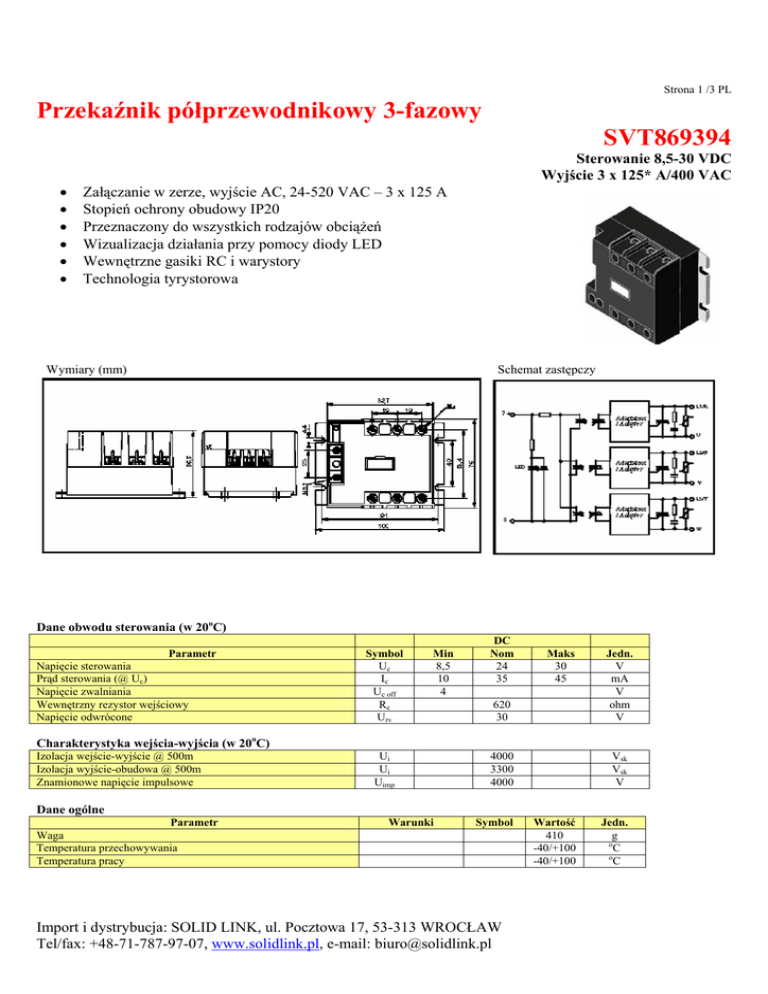 Strona 1 /3 PL Przekaźnik półprzewodnikowy 3-fazowy SVT869394 • • • • • • Sterowanie 8,5-30 VDC Wyjście 3 x 125* A/400 VAC Załączanie w zerze, wyjście AC, 24-520 VAC – 3 x 125 A Stopień ochrony obudowy IP20 Przeznaczony do wszystkich rodzajów obciążeń Wizualizacja działania przy pomocy diody LED Wewnętrzne gasiki RC i warystory Technologia tyrystorowa Wymiary (mm) Schemat zastępczy Dane obwodu sterowania (w 20oC) Parametr Napięcie sterowania Prąd sterowania (@ Uc) Napięcie zwalniania Wewnętrzny rezystor wejściowy Napięcie odwrócone Symbol Uc Ic Uc off Rc Urv Min 8,5 10 4 DC Nom 24 35 Maks 30 45 620 30 Jedn. V mA V ohm V 4000 3300 4000 Vsk Vsk V Charakterystyka wejścia-wyjścia (w 20oC) Izolacja wejście-wyjście @ 500m Izolacja wyjście-obudowa @ 500m Znamionowe napięcie impulsowe Ui Ui Uimp Dane ogólne Parametr Waga Temperatura przechowywania Temperatura pracy Warunki Symbol Import i dystrybucja: SOLID LINK, ul. Pocztowa 17, 53-313 WROCŁAW Tel/fax: +48-71-787-97-07, www.solidlink.pl, e-mail: [email protected] Wartość 410 -40/+100 -40/+100 Jedn. g o C o C Strona 2 /3 PL Dane obwodu wyjściowego (w 20oC) Warunki (480Vsk + 10%) (patrz rys. 1) (patrz rys. 1) tp=10ms (rys. 2) @Ie nom @Ue, 50Hz IEC 1000-4-4 IEC 1000-4-5 EN60947-4-x Symbol Ue Wartość 400 530 Uemax Up 1200 Usync 12 Ie AC-51 125* Ie AC-53 32 Itsm 2000 Vd 1,4 Ilk 5 Ie min 5 ton max 10 toff max 10 f 10-440 dv/dt 500 di/dt 50 I2t 20000 2 kV kryterium A 2 kV kryterium A Jedn. Vsk Vsk V V Ask Ask A V mA mA ms ms Hz V/µs A/µs A2s Całkowita moc rozpraszana (W) * ograniczony do 50 A przez połączenia Parametr Napięcie znamionowe Zakres napięć Napięcie szczytowe Poziom synchronizacji Prąd znamionowy AC-51 Prąd znamionowy AC-53 Niepowtarzalny prąd udarowy Spadek napięcia w stanie przewodzenia Prąd upływu w stanie wyłączenia Min. prąd obciążenia Czas włączania Czas wyłączania Zakres częstotliwości dv/dt w stanie wyłączenia Maks. di/dt niepowtarzalne I2t (<10 ms) EMC test na odporność na zakłócenia przewodzone EMC test na odporność na zakłócenia przewodzone Zgodność 1-niepowtarzalny prąd udarowy Itsm bez powtórnie przyłożonego napięcia podany w celu określenia zabezpieczenia. 2-Powtarzalny prąd udarowy Itsm (Tj=70 st. C). Powtarzanie się udarów prądowych skraca żywotność przekaźnika półprzewodnikowego. Uwaga: przekaźniki półprzewodnikowe nie zapewniają izolacji galwanicznej pomiędzy obciążeniem a zasilaniem. Producent: celduc Import i dystrybucja: SOLID LINK, ul. Pocztowa 17, 53-313 WROCŁAW Tel/fax: +48-71-787-97-07, www.solidlink.pl, e-mail: [email protected] Strona 3 /3 PL Import i dystrybucja: SOLID LINK, ul. Pocztowa 17, 53-313 WROCŁAW Tel/fax: +48-71-787-97-07, www.solidlink.pl, e-mail: [email protected]