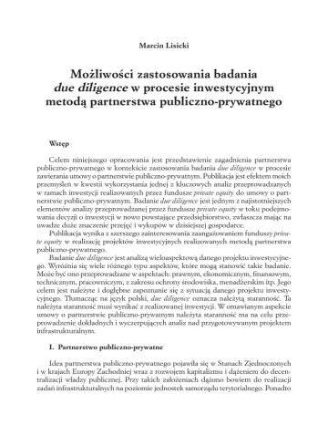 Marcin Lisicki Możliwości zastosowania badania due diligence w procesie inwestycyjnym metodą partnerstwa publiczno-prywatnego Wstęp Celem niniejszego opracowania jest przedstawienie zagadnienia partnerstwa publiczno-prywatnego w kontekście zastosowania badania due diligence w procesie zawierania umowy o partnerstwie publiczno-prywatnym. Publikacja jest efektem moich przemyśleń w kwestii wykorzystania jednej z kluczowych analiz przeprowadzanych w ramach inwestycji realizowanych przez fundusze private equity do umowy o partnerstwie publiczno-prywatnym. Badanie due diligence jest jednym z najistotniejszych elementów analizy przeprowadzanej przez fundusze private equity w toku podejmowania decyzji o inwestycji w nowo powstające przedsiębiorstwo, zwłaszcza mając na uwadze duże znaczenie przejęć i wykupów w dzisiejszej gospodarce. Publikacja wynika z szerszego zainteresowania zaangażowaniem funduszy private equity w realizację projektów inwestycyjnych realizowanych metodą partnerstwa publiczno-prywatnego. Badanie due diligence jest analizą wieloaspektową danego projektu inwestycyjnego. Wyróżnia się wiele różnego typu aspektów, które mogą stanowić takie badanie. Może być ono przeprowadzane w aspektach: prawnym, ekonomicznym, finansowym, technicznym, pracowniczym, z zakresu ochrony środowiska, menadżerskim itp. Jego celem jest należyte i dogłębne zapoznanie się z sytuacją danego projektu inwestycyjnego. Tłumacząc na język polski, due diligence oznacza należytą staranność. Ta należyta staranność musi wynikać z realizowanej inwestycji. W omawianym aspekcie umowy o partnerstwie publiczno-prywatnym należyta staranność ma na celu przeprowadzenie dokładnych i wyczerpujących analiz nad przygotowywanym projektem infrastrukturalnym. I. Partnerstwo publiczno-prywatne Idea partnerstwa publiczno-prywatnego pojawiła się w Stanach Zjednoczonych i w krajach Europy Zachodniej wraz z rozwojem kapitalizmu i dążeniem do decentralizacji władzy publicznej. Przy takich założeniach dążono bowiem do realizacji zadań infrastrukturalnych na poziomie jednostek samorządu terytorialnego. Ponadto Możliwości zastosowania badania due diligence w procesie inwestycyjnym... 97 realizacja tych zadań miała być wykonywana ze środków pochodzących z budżetów poszczególnych jednostek samorządów terytorialnych. W takiej sytuacji jednostki terytorialne zostały zmuszone do poszukiwania oszczędności we własnych budżetach. Mechanizmem umożliwiającym realizację projektów infrastrukturalnych jest partnerstwo publiczno-prywatne. Umożliwia on bowiem z jednej strony zaoszczędzenie jednostkom samorządu terytorialnego środków finansowych, które miałyby być przeznaczone na inwestycję infrastrukturalną, z drugiej zaś doprowadza do podziału ryzyka między obydwu partnerów umowy o partnerstwie publiczno-prywatnym, to jest podmiot publiczny, jakim jest jednostka samorządu terytorialnego, oraz podmiot prywatny, jakim jest przedsiębiorstwo realizujące inwestycję. W ramach partnerstwa publiczno-prywatnego mogą uczestniczyć dwie strony. Zawsze musi to być z jednej strony podmiot publiczny, a z drugiej – podmiot prywatny. Umowa o partnerstwie publiczno-prywatnym nie może łączyć tylko podmiotów publicznych albo tylko podmiotów prywatnych. Zadania infrastrukturalne, według ustawy, są powierzone podmiotowi publicznemu. Są to zadania ustawowe związane z zapotrzebowaniem społeczności lokalnych na zaspokajanie podstawowych potrzeb. Obowiązki te zostały zasadniczo wymienione w ustawach samorządowych, to jest w ustawach: o samorządzie gminnym, powiatowym i województwa. Analizując na przykład ustawę o samorządzie gminnym, należy zwrócić uwagę na jej artykuł 7, w którym wymienione zostały zadania własne gminy. Według art. 7 ust. 1 u.s.g.: „Zaspokajanie zbiorowych potrzeb wspólnoty należy do zadań własnych gminy. W szczególności zadania własne obejmują sprawy: 1) ładu przestrzennego, gospodarki nieruchomościami, ochrony środowiska i przyrody oraz gospodarki wodnej; 2) gminnych dróg, ulic, mostów, placów oraz organizacji ruchu drogowego; 3) wodociągów i zaopatrzenia w wodę, kanalizacji, usuwania i oczyszczania ścieków komunalnych, utrzymania czystości i porządku oraz urządzeń sanitarnych, wysypisk i unieszkodliwiania odpadów komunalnych, zaopatrzenia w energię elektryczną i cieplna oraz gaz, 3a) działalność w zakresie telekomunikacji; 4) lokalnego transportu zbiorowego; 5) ochrony zdrowia; 6) pomocy społecznej, w tym ośrodków i zakładów opiekuńczych; 7) gminnego budownictwa mieszkaniowego; 8) edukacji publicznej; 9) kultury w tym bibliotek gminnych i innych instytucji kultury oraz ochrony zabytków i opieki nad zabytkami; Ustawa z dnia 8 marca 1990 r. o samorządzie gminnym (tekst jedn.: Dz. U. z 2001 r. Nr 142, poz. 1591 z późn. zm., dalej: u.s.g.). Ustawa z dnia 5 czerwca 1998 r. o samorządzie powiatowym (tekst jedn.: Dz. U. z 2001 r. Nr 142, poz. 1592 z późn. zm.); ustawa z dnia 5 czerwca 1998 r. o samorządzie województwa (tekst jedn.: Dz. U. z 2001 r. Nr 142, poz. 1590 z późn. zm.). 98 Hereditas Mercaturæ • Marcin Lisicki 10) kultury fizycznej i turystyki, w tym terenów rekreacyjnych i urządzeń sportowych; 11) targowisk i hal targowych; 12) zieleni gminnej i zadrzewień; 13) cmentarzy gminnych; 14) porządku publicznego i bezpieczeństwa obywateli oraz ochrony przeciwpożarowej i przeciwpowodziowej, w tym wyposażenia i utrzymania gminnegomagazynu przeciwpowodziowego; 15) utrzymania gminnych obiektów i urządzeń użyteczności publicznej oraz obiektów administracyjnych; 16) polityki prorodzinnej, w tym zapewnienia kobietom w ciąży opieki socjalnej, medycznej i prawnej; 17) wspierania i upowszechniania idei samorządowej, w tym tworzenia warunków do działania i rozwoju jednostek pomocniczych i wdrażania programów pobudzania aktywności obywatelskiej; 18) promocji gmin