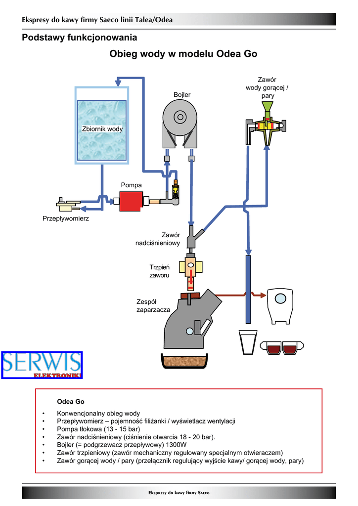 Ekspresy do kawy firmy Saeco linii Talea/Odea Podstawy funkcjonowania Obieg wody w modelu Odea Go Bojler 1 Caldaia Zawór wody gorącej / pary Rubinetto Zbiornik wody Serbatoio Pompa Przepływomierz Valvola Pompa EP5 sicurezza Zawór nadciśnieniowy Perno Caldaia conTrzpień spillo zaworu Gruppo Zespół zaparzacza Odea Go • • • • • • • Konwencjonalny obieg wody Przepływomierz – pojemność filiżanki / wyświetlacz wentylacji Pompa tłokowa (13 - 15 bar) Zawór nadciśnieniowy (ciśnienie otwarcia 18 - 20 bar). Bojler (= podgrzewacz przepływowy) 1300W Zawór trzpieniowy (zawór mechaniczny regulowany specjalnym otwieraczem) Zawór gorącej wody / pary (przełącznik regulujący wyjście kawy/ gorącej wody, pary) Ekspresy do kawy firmy Saeco Ekspresy do kawy firmy Saeco linii Talea/Odea Obieg wody w modelach Talea, Odea Giro Caldaia Bojler 1 Rubinetto zawór gorąca woda / para tylko w serii Talea Zbiornik wody Serbatoio Przepływomierz Pompa EP5 Turbina Zawór nadciśnieniowy Sistema di (rura z parą) sicurezza mleczko jako dodatek (Milk Island) Zawór dwudrożny Elettropilota 1 Zawór Valvola elektryczny scarico RedukcjaValvola zaworu 2 ciśnienia ok. 4 bar 4bar Valvolakawy 3 ok. 4 bar Zawór 4 bar Trzpień Perno Caldaia bez zaworu senza spillo Tacka na resztki wody • • • • Milk Island) Island (Milk mleczko jako dodatek solo su Talea Gruppo Zespół zaparzacza Talea, Odea Giro Cewka zaworu spełnia wiele funkcji, które zostały opisane w poniższych wątkach. Mechaniczny zawór jest zintegrowany z zaworem elektrycznym, który zostaje otwarty przy ciśnieniu około 18 - 20 barów Podczas dozowania kawy i gorącej wody / pary zawór jest zamknięty, zawór kawy otwiera się przy ciśnieniu ok. 4 barów i woda jest tłoczona przez zespół zaparzacza Zawór nadciśnieniowy reguluje ciśnieniem pary w rurze, które wypycha mleczko do kawy. Jednocześnie zawór ten zabezpiecza system przed uszkodzeniami spowodowanymi nadmiernym ciśnieniem, a nadmiar tego ciśnienia kierowany jest do zbiornika z wodą. Zawór wielodrożny otwiera wybiórczo w zależności od sytuacji, w kierunku przepływu (dozowanie) lub w kierunku przeciwnym przepływu (spadek ciśnienia) Ekspresy do kawy firmy Saeco