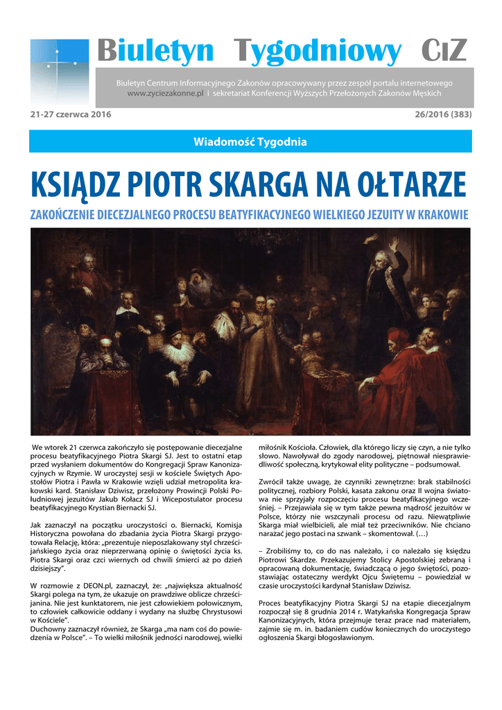 Biuletyn Tygodniowy CIZ Biuletyn Centrum Informacyjnego Zakonów opracowywany przez zespół portalu internetowego www.zyciezakonne.pl i sekretariat Konferencji Wyższych Przełożonych Zakonów Męskich 21-27 czerwca 2016 26/2016 (383) Wiadomość Tygodnia KSIĄDZ PIOTR SKARGA NA OŁTARZE ZAKOŃCZENIE DIECEZJALNEGO PROCESU BEATYFIKACYJNEGO WIELKIEGO JEZUITY W KRAKOWIE We wtorek 21 czerwca zakończyło się postępowanie diecezjalne procesu beatyfikacyjnego Piotra Skargi SJ. Jest to ostatni etap przed wysłaniem dokumentów do Kongregacji Spraw Kanonizacyjnych w Rzymie. W uroczystej sesji w kościele Świętych Apostołów Piotra i Pawła w Krakowie wzięli udział metropolita krakowski kard. Stanisław Dziwisz, przełożony Prowincji Polski Południowej jezuitów Jakub Kołacz SJ i Wicepostulator procesu beatyfikacyjnego Krystian Biernacki SJ. Jak zaznaczył na początku uroczystości o. Biernacki, Komisja Historyczna powołana do zbadania życia Piotra Skargi przygotowała Relację, która: „prezentuje nieposzlakowany styl chrześcijańskiego życia oraz nieprzerwaną opinię o świętości życia ks. Piotra Skargi oraz czci wiernych od chwili śmierci aż po dzień dzisiejszy”. W rozmowie z DEON.pl, zaznaczył, że: „największa aktualność Skargi polega na tym, że ukazuje on prawdziwe oblicze chrześcijanina. Nie jest kunktatorem, nie jest człowiekiem połowicznym, to człowiek całkowicie oddany i wydany na służbę Chrystusowi w Kościele”. Duchowny zaznaczył również, że Skarga „ma nam coś do powiedzenia w Polsce”. – To wielki miłośnik jedności narodowej, wielki miłośnik Kościoła. Człowiek, dla którego liczy się czyn, a nie tylko słowo. Nawoływał do zgody narodowej, piętnował niesprawiedliwość społeczną, krytykował elity polityczne – podsumował. Zwrócił także uwagę, że czynniki zewnętrzne: brak stabilności politycznej, rozbiory Polski, kasata zakonu oraz II wojna światowa nie sprzyjały rozpoczęciu procesu beatyfikacyjnego wcześniej. – Przejawiała się w tym także pewna mądrość jezuitów w Polsce, którzy nie wszczynali procesu od razu. Niewątpliwie Skarga miał wielbicieli, ale miał też przeciwników. Nie chciano narażać jego postaci na szwank – skomentował. (…) – Zrobiliśmy to, co do nas należało, i co należało się księdzu Piotrowi Skardze. Przekazujemy Stolicy Apostolskiej zebraną i opracowaną dokumentację, świadczącą o jego świętości, pozostawiając ostateczny werdykt Ojcu Świętemu – powiedział w czasie uroczystości kardynał Stanisław Dziwisz. Proces beatyfikacyjny Piotra Skargi SJ na etapie diecezjalnym rozpoczął się 8 grudnia 2014 r. Watykańska Kongregacja Spraw Kanonizacyjnych, która przejmuje teraz prace nad materiałem, zajmie się m. in. badaniem cudów koniecznych do uroczystego ogłoszenia Skargi błogosławionym. 21-27 czerwca 2016 Biuletyn Tygodniowy CiZ 26/2015 (383) ______________________________________________________________________________________________ szacunku i miłości. Ta miłość – do Ojczyzny i do bliźnich – zgodnie z duchem Ćwiczeń duchownych św. Ignacego, założyciela Towarzystwa Jezusowego, miała objawiać się w czynach, a nie pozostawać na poziomie słów i ulotnych deklaracji. O. KOŁACZ O AKTUALNOŚCI PRZESŁANIA KS. SKARGI Święci i błogosławieni do nas mówią, a my mamy ich słuchać – dopiero wtedy ich wołanie przynosi owoce – powiedział Jakub Kołacz SJ, przełożony Prowincji Polski Południowej Towarzystwa Jezusowego w czasie sesji zamykającej etap diecezjalny procesu beatyfikacyjnego Piotra Skargi SJ Patrząc na świat, w którym żyjemy, widzimy, że wołanie Piotra Skargi SJ nie uległo przedawnieniu, a może nawet w jeszcze większej mierze stało się wezwaniem na dziś. Być może właśnie stąd to „opóźnienie” w procesie beatyfikacji? Być może Pan Bóg dlatego to sprawił, bo właśnie dzisiaj bardziej niż kiedykolwiek potrzebujemy, aby w naszym kraju i w naszych duszach zabrzmiał raz jeszcze mocny głos proroka nadziei? Na przestrzeni kilku wieków wiele rzeczy i spraw stawało nam na przeszkodzie, spychając na dalszy plan sprawę wyniesienia O. Piotra Skargi SJ na ołtarze. Wielu ludziom trudno było zrozumieć, dlaczego dzieje się tak, iż jeden z najbardziej znanych polskich duchownych, bohater i wieszcz, nie zostaje uznany za wzór chrześcijańskich cnót. Dziś jednak – właśnie dzięki tym wiekom, które są za nami – mamy okazję, aby na tę postać spojrzeć z perspektywy wielu historycznych wydarzeń i zrozumieć coś, czego nie bylibyśmy w stanie pojąć 100 czy 200 lat temu: mianowicie, że przesłanie, a właściwie nawoływanie O. Piotra Skargi SJ wciąż jest aktualne, a może nawet dziś powinno zabrzmieć bardziej wyraziście niż kiedykolwiek wcześniej. Święci i błogosławieni do nas mówią, a my mamy ich słuchać – dopiero wtedy ich wołanie przynosi owoce. Ufamy, że głos Piotra Skargi SJ będzie na tyle mocny, że przebije się przez zgiełk fałszywych głosów, agitacji i kłamliwej retoryki. Ufamy, że O. Piotr pomoże nam odnaleźć prawdziwe wartości. Dziękuję Wszystkim, którzy na tym etapie przyczynili się do doprowadzenia do końca procesu na etapie diecezjalnym. Dziękuję za życzliwość Księdza Kardynała i całego Kościoła Krakowskiego. Życzmy sobie, aby nasza intuicja, a może nawet przekonanie co do świętości Piotra Skargi SJ, została potwierdzona przez Stolicę Świętą, abyśmy w ten sposób w jego osobie otrzymali kolejny drogowskaz na naszej drodze do nieba i do osobistej świętości. Za: www.deon.pl Żył i działał w czasach dla Polski chwalebnych, ale i trudnych. Przemawiał dobitnie, ale i ostro. Wychwalał cnoty, ale bezpardonowo ganił przywary i grzechy. We wszystkim tym miał jednak jeden cel: obrzydzić ludziom grzech, napiętnować wzajemną nienawiść, zburzyć mury podziałów – a wszystko po to, aby ukazać ja