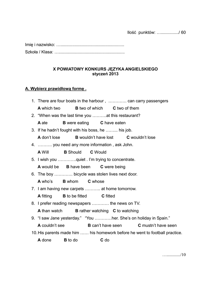 Ilość punktów: ….............../ 60 Imię i nazwisko: …...................................................... Szkoła / Klasa: …........................................................ X POWIATOWY KONKURS JĘZYKA ANGIELSKIEGO styczeń 2013 A. Wybierz prawidłową formę . 1. There are four boats in the harbour , …………. can carry passengers A which two B two of which C two of them 2. “When was the last time you ……….at this restaurant? A ate B were eating C have eaten 3. If he hadn‟t fought with his boss, he ……... his job. A don‟t lose B wouldn‟t have lost C wouldn‟t lose 4. ………. you need any more information , ask John. A Will B Should C Would 5. I wish you ………….quiet . I‟m trying to concentrate. A would be B have been C were being 6. The boy …………. bicycle was stolen lives next door. A who‟s B whom C whose 7. I am having new carpets ……….. at home tomorrow. A fitting B to be fitted C fitted 8. I prefer reading newspapers ………… the news on TV. A than watch B rather watching C to watching 9. “I saw Jane yesterday.” “You …………her. She‟s on holiday in Spain.” A couldn‟t see B can‟t have seen C mustn‟t have seen 10. His parents made him …… his homework before he went to football practice. A done B to do C do …............./10 B. Wyrazy w nawiasach napisz w odpowiedniej formie dodając odpowiednie słowa tam, gdzie to konieczne. 1. “If only I ( not / forget) ………………….…to post the letter. “ “Never mind. You can post it tomorrow instead .” 2. “Pam (always / complain) ………………………..about something” “Yes, It‟s annoying, isn‟t it?” 3. They (realize) …………………they (lose) …………………... their way and (start) ……………….to panic. 4. “Where did you get that beautiful jumper?” “ It (knit) …………………………by my grandmother years ago.” 5. Sorry , I didn‟t mean (interrupt) ………………………your meeting, Mr Jackson. 6. The president‟s speech was much (long) ……………………….than I thought it would be. 7. “What perfume are you wearing? It (smell) ………………nice . “Thanks. It‟s called „Angel‟ “ 8. “Will you call me when you arrive in Seattle” “If I (not arrive) ………………... too late, I (call) ……………………. you.” 9. Mike is used to (wear) ……………..………… suits to work. 10. (you / read) …………………..………the book I lent you yet? …............/10 C . Dokończ zdania. Wykorzystaj podane słowa tak aby znaczenie utworzonego zadnia było podobne do znaczenia zdania podanego. 1. The teacher said I could leave early. permission The teacher ….............................................................. to leave early. 2. James was the only one who didn‟t go to the concert. apart Everybody went…..............................................................................James 3. “You stole the money from my bag.” She said to Mark. accused She …..............................................................the money from her bag. 4. I don‟t think it‟s a good idea to buy another coat. were If …........................................................... I wouldn‟t buy another coat. 5. There probably won‟t be any more exams this term. unlikely It ……………………………..……………………be any more exams this term. 6. You mustn‟t eat in the library. forbidden It…................................................................................................in the library. 7. Someone stole his briefcase last week. had He …........................................................................................... last week. 8. The film was so amusing that we went to see it twice. such It was …........................................................................we went to see it twice. 9. These two jumpers look the same to me. tell I …........................................................................between these two jumpers. 10. My landlord doesn‟t let me keep a pet in my flat . allowed I …..................................................................................a pet in my flat. ….........../10 D.Uzupełnij zdania słowem utworzonym od podanego. 1.Children who (behave) ……………………… will be sent to the headmaster. 2. The two (contest) ……………………….fought hard to win the competition. 3.Our neighbours are building an (extend) ………………………..on their house. 4.I spend time in the countryside because I enjoy the (silent) …………………... 5.The committee wants to (popular) ………………………their product 6. I love spending time with my family – it‟s very (enjoy) …………………………. . 7. The prime minister made no ( refer) ………………………….to the election in his speech. 8.They are going to (wide)………………………that road because it is too narrow. 9.The manager gave his (approve) …………………………for this project to begin. 10. That club is (exclude) …………………… . You have to be a member to go in. …............./10 E. Wybierz właściwą odpowiedź. 1. Mark hates doing the chores. A. Me too, especially the ironing !. B. How awful! Will he be all right ? 2. The chimney needs reparing. A. I‟ll send someone to look at it right away . B. I‟ll go downstairs to check. 3. I can‟t come to the countryside. I suffer from hay fever. A. I think you should start a watch group! B. That‟s too bad.! 4. Guess what! I met a famous politician yesterday! A. No really? Tell me about it! B. Are you sure? I thought you didn‟t like politics! 5. Where are my keys? A. Look, they‟re under your nose. B. You shouldn‟t leave them there. 6. Listen to all the football fans chanting. A. Yes, they sound really enthusiastic. B. Have they started playin