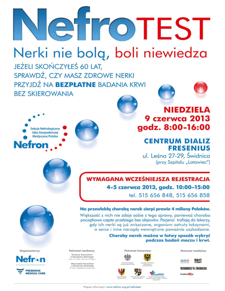 Więcej informacji: Świdnica, 27.05.2013 dr n. med. Ewa Trafidło Dyrektor Centrum Dializ Fresenius w Świdnicy e-mail: [email protected] Marta Andrzejewska Rzecznik Prasowy e-mail: [email protected] tel. +48 605 213 063 tel. 74 8515790, 781 444 116 Kampania społeczna NEFROTEST pierwszy raz w Świdnicy Zbadaj nerki za darmo i bez skierowania Osoby, które ukończyły 60 lat, będą miały okazję za darmo zbadać swoją krew pod kątem chorób nerek. W niedzielę, 9 czerwca 2013 roku, w Centrum Dializ Fresenius w Świdnicy (ul. Leśna 27-29, przy Szpitalu Latawiec) odbędzie się akcja NEFROTEST. Jest to część ogólnopolskiej kampanii społecznej organizowanej przez Nefron Sekcję Nefrologiczną Izby Gospodarczej Medycyna Polska oraz Centrum Dializ Fresenius w Świdnicy. Aby wziąć udział w badaniach, trzeba pamiętać o wcześniejszej rejestracji, bowiem liczba miejsc jest ograniczona i wynosi 400. Na terenie całego kraju akcję wspiera Pani Anna Komorowska – Małżonka Prezydenta RP. Na szczeblu regionalnym badania swoim patronatem objęli: Aleksander Marek Skorupa – Wojewoda Dolnośląski,Rafał Jurkowlaniec – Marszałek Województwa Dolnośląskiego, Zygmunt Worsa – Starosta Powiatu Świdnickiego, Wojciech Murdzek – Prezydent Miasta Świdnica oraz Grzegorz Kloc – Dyrektor Regionalnego Szpitala Specjalistycznego Latawiec w Świdnicy. Szacunkowo, w Polsce problemy z nerkami ma ponad 4 miliony osób. Większość z nich nie zdaje sobie z tego sprawy. „O nerkach, mówi się często jako o cichym zabójcy. Choroby tych narządów mogą rozwijać się nawet 20 lat, a pacjent nie zdaje sobie z tego sprawy. Nic go nie boli, a potem nagle trafia na dializy lub na pilną listę do przeszczepu nerki. Tym czasem wystarczy proste badanie moczu i krwi, by wykryć przewlekłą chorobę nerek we wczesnym stadium. Pacjent ma wtedy szansę na pełne wyleczenie” tłumaczy dr n. med. Ewa Trafidło, Dyrektor Centrum Dializ Fresenius w Świdnicy. W grupie największego ryzyka, zachorowania na niewydolność nerek są osoby właśnie po 60 roku życia, chore na cukrzycę, nadciśnienie czy schorzenia układu krążenia (pacjenci po przebytych zawałach, udarach, z miażdżycą). Profilaktyczne badania zalecane są też tym, którzy mają w rodzinie osoby chore na nerki. Właściwie każdy dorosły powinien poddać się raz na rok kontrolnym badaniom nerek. Kampania NEFROTEST ma zwrócić uwagę Polaków nerki. Na to, jak ważną rolę odgrywają w organizmie. Działają bowiem jak filtr, który usuwa wszystko to, co zbędne i szkodliwe z krwi. „Same badania to moment kulminacyjny kampanii. Oczywiście chcemy przebadać jak najwięcej osób, ale nie tylko o same badana chodzi. Najważniejsze, by wyczulić społeczeństwo na problem chorób nerek. Będziemy kłaść duży nacisk na samą kampanię informacyjną prowadzoną w mediach i przy pomocy naszych własnych materiałów” - tłumaczy Dariusz Aksamit, prezes Nefron Sekcji Nefrologicznej Izby Gospodarczej Medycyna Polska. Aby przebadać krew podczas świdnickiego NEFROTESTU trzeba pamiętać o wcześniejszej rejestracji. „Rejestracja pozwoli nam wprowadzić porządek podczas badań. Pacjenci będą przychodzić na konkretną godzinę, by uniknąć niepotrzebnego, długiego oczekiwania w kolejce. Przypominam też, że aby się przebadać, nie trzeba być na czczo.” - mówi Henryk Fenik, pielęgniarz oddziałowy Centrum Dializ Fresenius w Świdnicy. Trzeba także pamiętać, że na badania mogą zapisać się tylko osoby od 60 roku życia. Wymagany będzie numer PESEL. Rejestracja będzie przeprowadzana 4 i 5 czerwca br. pod jednym z dwóch numerów telefonów: 515 656 848 i 515 656 858, w godz. 10:00 – 15:00. Próbki krwi przebadanych 9 czerwca pacjentów trafią w ręce personelu z laboratorium DIAGNOSYKA z Wrocławia. Do mieszkańców powiatu świdnickiego trafiło ponadto 2000 bezpłatnych skierowań na badania krwi (kreatynina z eGFR) i moczu (badanie ogólne). To dodatkowa możliwość dla tych, którzy również chcą przebadać nerki, a nie zdołają się zarejestrować na niedzielne badania. „Skierowań można szukać między innymi w aptekach, parafiach czy patronujących akcji mediach. Dostali je także lekarze rodzinni. Zachęcamy pacjentów, którzy ukończyli 60 lat aby pytali o darmowe skierowania w tych miejscach. Badania z nich, można wykonać w dowolnym czasie, do końca lipca 2013 roku” - mówi dr n. med. Ewa Trafidło. Świdnica to już dwudzieste piąte miasto na mapie Polski, gdzie odbywa się kampania NEFROTEST. Od początku akcji w 2010 roku, przebadaliśmy ponad 12 tysięcy osób. Prawie zawsze jest dużo więcej chętnych niż dostępnych na badania miejsc. Wszyscy przebadani, których wyniki nie mieściły się w normach zostali skierowani na dalszą diagnostykę. Organizatorami akcji są Nefron Sekcja Nefrologiczna Izby Gospodarczej Medycyna Polska (organizacja skupiająca operatorów stacji dializ w Polsce) oraz Centrum Dializ Fresenius w Świdnicy. NEFROTEST w powiecie świdnickim objęli patronatem naukowym prof. Marian Klinger - Krajowy Konsultant w Dziedzinie Nefrologii oraz dr hab. n. med. Magdalena Krajewska - Konsultant Wojewódzki w Dziedzinie Nefrologii. Patronat honorowy nad akcją sprawują: Aleksander Marek Skorupa – Wojewoda Dolnośląski Rafał Jurkowlaniec – Marszałek Województwa Dolnośląskiego, Zygmunt Worsa – Starosta Powiatu Świdnickiego, Wojciech Murdzek – Prezydent Miasta Świdnica oraz Grzegorz Kloc – Dyrektor Regionalnego Szpitala Specjalistycznego Latawiec w Świdnicy. Kampanię NEFROTEST w całej Polsce wspiera Pani Anna Komorowska - Małżonka Prezydenta RP. * Nefron Sekcja Nefrologiczna Izby Gospodarczej Medycyna Polska powstała w czerwcu 2008 roku. Dziś zrzesza operatorów niemal 160 publicznych i niepublicznych stacji dializ w Polsce.