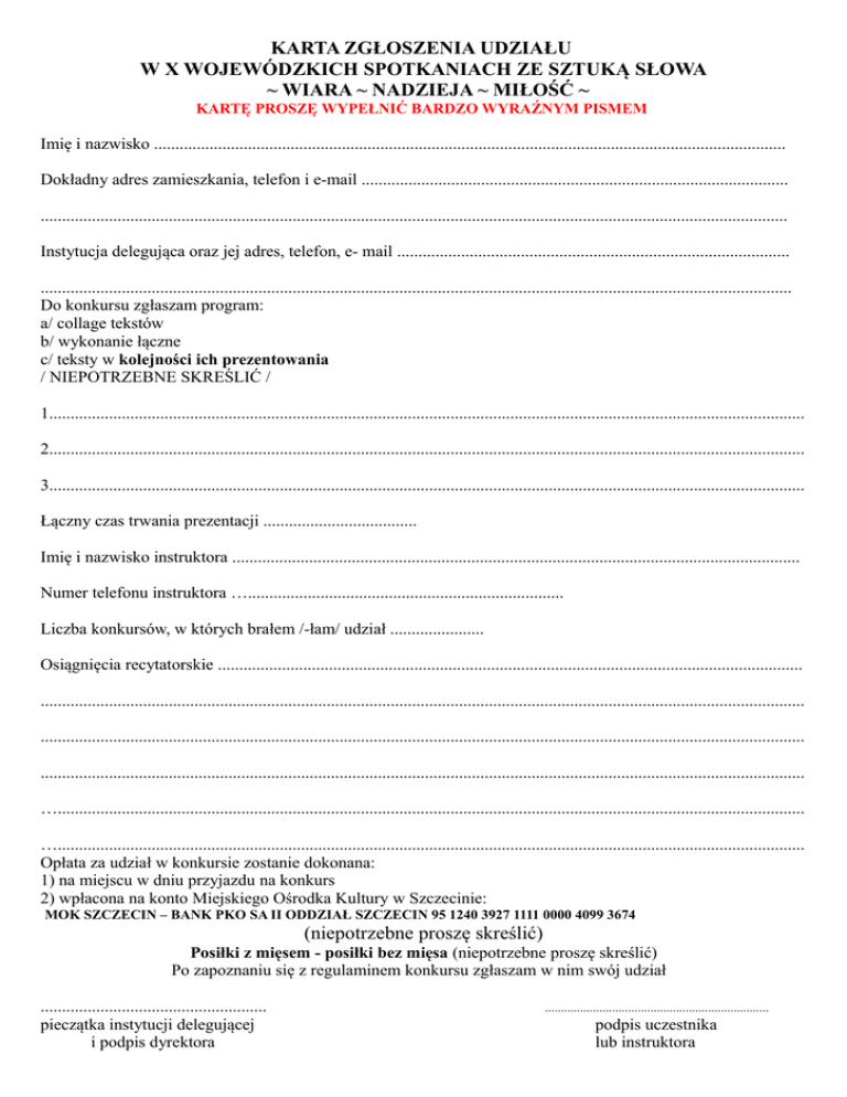 KARTA ZGŁOSZENIA UDZIAŁU W X WOJEWÓDZKICH SPOTKANIACH ZE SZTUKĄ SŁOWA ~ WIARA ~ NADZIEJA ~ MIŁOŚĆ ~ KARTĘ PROSZĘ WYPEŁNIĆ BARDZO WYRAŹNYM PISMEM Imię i nazwisko .................................................................................................................................................... Dokładny adres zamieszkania, telefon i e-mail .................................................................................................... ............................................................................................................................................................................... Instytucja delegująca oraz jej adres, telefon, e- mail ............................................................................................ ................................................................................................................................................................................ Do konkursu zgłaszam program: a/ collage tekstów b/ wykonanie łączne c/ teksty w kolejności ich prezentowania / NIEPOTRZEBNE SKREŚLIĆ / 1................................................................................................................................................................................. 2................................................................................................................................................................................. 3................................................................................................................................................................................. Łączny czas trwania prezentacji .................................... Imię i nazwisko instruktora ..................................................................................................................................... Numer telefonu instruktora ….......................................................................... Liczba konkursów, w których brałem /-łam/ udział ...................... Osiągnięcia recytatorskie ......................................................................................................................................... ................................................................................................................................................................................... ................................................................................................................................................................................... ................................................................................................................................................................................... …............................................................................................................................................................................... …............................................................................................................................................................................... Opłata za udział w konkursie zostanie dokonana: 1) na miejscu w dniu przyjazdu na konkurs 2) wpłacona na konto Miejskiego Ośrodka Kultury w Szczecinie: MOK SZCZECIN – BANK PKO SA II ODDZIAŁ SZCZECIN 95 1240 3927 1111 0000 4099 3674 (niepotrzebne proszę skreślić) Posiłki z mięsem - posiłki bez mięsa (niepotrzebne proszę skreślić) Po zapoznaniu się z regulaminem konkursu zgłaszam w nim swój udział ..................................................... pieczątka instytucji delegującej i podpis dyrektora ...................................................................... podpis uczestnika lub instruktora