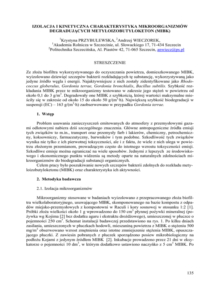 IZOLACJA I KINETYCZNA CHARAKTERYSTYKA MIKROORGANIZMÓW DEGRADUJĄCYCH METYLOIZOBUTYLOKETON (MIBK) 1 Krystyna PRZYBULEWSKA, 2Andrzej WIECZOREK, Akademia Rolnicza w Szczecinie, ul. Słowackiego 17, 71-434 Szczecin 2 Politechnika Szczecińska, Al. Piastów 42, 71-065 Szczecin, [email protected] 1 STRESZCZENIE Ze złoża biofiltra wykorzystywanego do oczyszczania powietrza, domieszkowanego MIBK, wyizolowano dziewięć szczepów bakterii rozkładających tę substancję, wykorzystywaną jako jedyne źródło węgla i energii. Najaktywniejsze z nich zostały zidentyfikowane jako Rhodococcus globerulus, Gordonia terrae, Gordonia bronchialis, Bacillus subtilis. Szybkość rozkładania MIBK przez te mikroorganizmy testowano w zakresie jego stężeń w powietrzu od około 0,1 do 3 g/m3. Degradowały one MIBK z szybkością, której wartości maksymalne mieściły się w zakresie od około 15 do około 50 g/(m3∙h). Największą szybkość biodegradacji w suspensji (EC) – 163 g/(m3∙h) zaobserwowano w przypadku Gordonia terrae. 1. Wstęp Problem usuwania zanieczyszczeń emitowanych do atmosfery z przemysłowymi gazami odlotowymi nabiera dziś szczególnego znaczenia. Główne antropogeniczne źródła emisji tych związków to m.in., transport oraz przemysły farb i lakierów, chemiczny, petrochemiczny, koksowniczy, farmaceutyczny, barwników i tym podobne. Szkodliwość tych związków wynika nie tylko z ich pierwotnej toksyczności, ale i z faktu, że wiele z nich ulega w powietrzu złożonym przemianom, prowadzącym często do istotnego wzrostu toksyczności emisji. Szkodliwe emisje można ograniczać na wiele sposobów. Jednymi z lepszych ze środowiskowego i ekonomicznego punktu widzenia są metody oparte na naturalnych zdolnościach mikroorganizmów do biodegradacji substancji organicznych. Celem pracy było poszukiwanie nowych szczepów bakterii zdolnych do rozkładu metyloizobutyloketonu (MIBK) oraz charakterystyka ich aktywności. 2. Metodyka badawcza 2.1. Izolacja mikroorganizmów Mikroorganizmy stosowane w badaniach wyizolowano z przepracowanego złoża biofiltra wielkolaboratoryjnego, usuwającego MIBK, skomponowanego na bazie kompostu z odpadów miejsko-przemysłowych z kompostowni w Raculi i kory sosnowej w stosunku 1:2 [1]. Próbki złoża wielkości około 1 g wprowadzono do 150 cm3 płynnej pożywki mineralnej (pożywka wg Kojima [2] bez dodatku agaru i ekstraktu drożdżowego), umieszczonej w płuczce o pojemności 250 cm3. Schemat instalacji badawczej przedstawiono na rys. 1. Po kilku dniach zasilania, umieszczonych w płuczkach hodowli, mieszaniną powietrza z MIBK o stężeniu 500 mg/m3 obserwowano wzrost zmętnienia oraz istotne zmniejszenie stężenia MIBK, opuszczającego płuczki. Z zawiesin pobranych z płuczek sporządzono posiew mikrobiologiczny na podłożu Kojami z jedynym źródłem MIBK [2]. Inkubacje prowadzono przez 21 dni w eksykatorze o pojemności 10 dm3, w którym dodatkowo ustawiono naczyńko z 5 cm3 MIBK. Po 135 tym czasie izolowano i namnażano na pożywce MPA firmy Biocorp, różniące się pod względem morfologicznym mikroorganizmy. Rys.1. Schemat aparatury badawczej; 1 – kolumna nawilżająca, 2 – rotametry, 3 – zawór, 4 – płuczka z MIBK, 5 – port poboru próbek na wlocie, 6 – filtry bakteryjne, 7 – wylot płuczki/pobór próbek, P1 do P4 – płuczki z zawiesiną aktywnych szczepów 2.2. Badanie aktywności degradacyjnej – eksperyment płuczkowy Biodegradację par MIBK w mieszaninach z powietrzem badano przy użyciu zestawu doświadczalnego, którego trzon stanowił zestaw równolegle zasilanych reaktorów (rys. 1). Na etapie izolacji mikroorganizmów używano w tym celu płuczek pojemności 250 cm3, a w testach kinetycznych płuczek o pojemności 25 cm3. Do każdej z nich wprowadzano 150 lub 10 pożywki mineralnej i dodawano 2 lub 0,5 cm3 inokulum, otrzymywanego metodą spłukiwania skosów bakteryjnych 3 cm3 soli fizjologicznej. Przez płuczki przetłaczano mieszaninę par MIBK i powietrza w ilości 3 – 10 dm3/h, przy stężeniach w zakresie 400 – 2700 mg/m3. Celem ochrony hodowli w płuczkach, przed zainfekowaniem mikroorganizmami obecnymi w powietrzu, przed płuczkami, na drodze strumienia gazów, zainstalowano filtry bakteryjne Anotop 25 0,2 μm (Whatman). Postęp procesu śledzono metodą chromatograficzną, z wykorzystaniem chromatografu gazowego Chrom 4. W badaniach kinetycznych mierzono też zmętnienie hodowli za pomocą spektrofotometru Spekol 11. W oparciu o wyniki analiz chromatograficznych i dane dotyczące przepływu mieszaniny par MIBK i powietrza przez płuczki obliczano obciążenie masowe płuczki MIBK, całkowitą skuteczność (sprawność) biodegradacji i zdolność eliminacji zanieczyszczeń (właściwą szybkość biodegradacji): G * C1 *10 3 (1) M V (C C 2 ) (2) Su 1 *100 C1 G * (C1 C 2 ) *10 3 V 3 gdzie: Ci – stężenie MIBK na wlocie/ wylocie, mg/m ; G – natężenie przepływu, m3/s; V – objętość zawiesiny, m3; M – obciążenie masowe płuczki MIBK, g∙/(m 3∙ s); Su – skuteczność biodegradacji, %; EC – zdolność eliminacji zanieczyszczeń, g/(m 3∙s). EC 136 (3) 3. Wyniki i dyskusja W trakcie badań wyizolowano 9 szczepów bakterii, zdolnych do wykorzystywania MIBK jako jedynego źródła węgla i energii. Najaktywniejsze mikroorganizmy zostały zidenty- 0,6 0,4 0,2 0 20 40 60 1,5 40 1 30 20 0,5 10 0 0 0 80 20 8,00 300 6,00 200 4,00 100 2,00 0,00 0 40 Czas 60 80 Stopień eliminacji 400 Obciążenie Stopień eliminacji 10,00 20 60 Czas Czas 0 40 35,00 30,00 25,00 20,00 15,00 10,00 5,00 0,00 200 150 100 50 Obciążenie 0 50 Zmętnienie 0,8 Szybkość reakcji 30 25 20 15 10 5 0 Zmętnienie Szybkość reakcji fikowane jako: Gordonia terrae, Gordonia bronchialis, Rhodococcus globerulus, i Bacillus subtilis dwoma metodami: MIDI i sekwencjonowania 16S rRNA przez laboratorium Microbial ID (Newark, DE, USA). Wyniki wstępnych pomiarów kinetyki biodegradacji, wykonane w „dużych płuczk