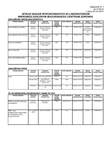 Załącznik nr 1 do P-0012 z dnia 25-10-2011 WYKAZ BADAŃ WYKONYWANYCH W LABORATORIUM MIKROBIOLOGICZNYM MAZURSKIEGO CENTRUM ZDROWIA ZAKAŻENIA DRÓG MOCZOWYCH Rodzaj materiału kierunek posiewu Pojemnik transportowy KOLOR butelki, zakrętki pojemnika biały Ilość materiału: Sposób zabezpieczenia Osoba pobierająca Osoba transportująca mocz środkow y strumień tlenowy ilościowy stery lny pojemnik z szerokim otworem 100-120ml 10ml lodówka 4-8ºC pacjent poinstruowany przez lekarza / plg pielęgniarka mocz pobrany przez cew nik tlenowy ilościowy stery lny pojemnik z szerokim otworem 100-120ml biały 10ml lodówka 4-8ºC lekarz pielęgniarka mocz po cystografii tlenowy ilościowy stery lny pojemnik z szerokim otworem 100-120ml biały 10ml lodówka 4-8ºC lekarz pielęgniarka mocz z cew nika tlenowy ilościowy stery lny pojemnik z szerokim otworem 100-120ml biały 10ml lodówka 4-8ºC pielęgniarka pielęgniarka mocz now orodka torebka tlenowy ilościowy stery lny pojemnik z szerokim otworem 100-120ml biały 2ml lodówka 4-8ºC pielęgniarka pielęgniarka kierunek posiewu Pojemnik transportowy Ilość materiału: Sposób zabezpieczenia Osoba pobierająca Osoba transportująca tlenowy dorośli Bact Alert AEROBIC FA KOLOR butelki, zakrętki pojemnika Zielona 5ml cieplarka 35-37ºC pielęgniarka pielęgniarka tlenowy dzieci Bact Alert PF AEROBIC - butelka pediatry czna Żółta 2-4ml cieplarka 35-37ºC pielęgniarka pielęgniarka 5ml cieplarka 35-37ºC pielęgniarka pielęgniarka KOLOR butelki, zakrętki pojemnika Żółta Ilość materiału: Sposób zabezpieczenia Osoba pobierająca Osoba transportująca powy żej 0,5ml cieplarka 35-37ºC lekarz pielęgniarka biały 2ml cieplarka 35-37ºC lekarz pielęgniarka ZAKAŻENIA KRWI Rodzaj materiału krew beztlenowy Bact Alert ANAEROBIC pomarańczowa FN PŁYN MÓZGOWO-RDZENIOWY I INNE PŁYNY Rodzaj materiału kierunek posiewu Pojemnik transportowy PMR na pos iew (doros ły lub dziecko) tlenowy jakościowy Bact Alert PF AEROBIC PMR - tes t antygenowy:H.influenzae N.m enigitidis :A,B,C; S.pneum oniae test + preparat z osadu stery lna probówka INNE PŁYNY Rodzaj materiału płyn z otrzewnej kierunek posiewu Pojemnik transportowy KOLOR Ilość materiału: Sposób butelki, zabezpieczenia zakrętki pojemnika Żółta butelka, 5ml butelka, cieplarka 35-37ºC niebieski 5 - 50 ml do butelka, Falcon pojemnika Falcon szaf ka 25ºC tlenowy jakościowy Bact Alert PF AEROBIC + Falcon 50 ml beztlenowy Bact Alert ANAEROBIC Pomarańczowa 5ml butelka, FN + Falcon 50 ml butelka, 5 - 50 ml do niebieski pojemnika Falcon Osoba pobierająca Osoba transportująca lekarz pielęgniarka cieplarka 35-37ºC butelka, Falcon szaf ka 25ºC lekarz pielęgniarka Sposób zabezpieczenia Osoba pobierająca Osoba transportująca szaf ka: 25ºC temp.pokojowa lekarz/plg pielęgniarka płyn z opłucnej płyn z os ierdzia płyn s tawowy płyn z kaletki ZAKAŻENIA GÓRNYCH DRÓG ODDECHOWYCH Rodzaj materiału KOLOR butelki, zakrętki pojemnika Czarny żel kierunek posiewu Pojemnik transportowy tlenowy podłoże transportowe z węglem tlenowy podłoże transportowe z węglem Czarny żel szaf ka: 25ºC temp.pokojowa lekarz pielęgniarka tlenowy podłoże transportowe bez węgla biały żel szaf ka: 25ºC temp.pokojowa lekarz/plg pielęgniarka ucho -płyn z tympanocentozy-aspirat, tlenowy Bact Alert AEROBIC FA Zielona 2-5ml cieplarka 35-37ºC lekarz pielęgniarka punktat z zatok – aspirat beztlenowy 2-5ml cieplarka 35-37ºC butelka, podłoże transportowe szaf ka: 25ºC temp.pokojowa lekarz pielęgniarka szaf ka: 25ºC temp.pokojowa lekarz/plg pielęgniarka wym az z gardła Ilość materiału: wym az z nos a wym az z nos ogardzieli wym az z nagłoś ni wym az z jam y us tnej wym az z ucha zewnętrznego wy maz na nosicielstwo:H.inf luenzae, N.meningitidis, S.pneumoniae tlenowy CO2 Bact Alert ANAEROBIC pomarańczowa FN + podłoże , czarny żel transportowe z węglem podłoże transportowe z węglem Czarny żel ZAKAŻENIA DOLNYCH DRÓG ODDECHOWYCH Rodzaj materiału kierunek posiewu Pojemnik transportowy plwocina tlenowy jakościowy stery lny pojemnik z szerokim otworem (100-120ml) wydzielina os krzelowa tlenowy jakościowy bronchoas pirat m et.s zczoteczkowa BAL -popłuczyny pęcherzykowo-os krzelowe (>140m l s oli fizjologicznej) m ini BAL - popłuczyny pęcherzykowo-os krzelowe bez bronchos kopii aspirat przeztchawiczy płyn z opłucnej KOLOR butelki, zakrętki pojemnika Czerwony Ilość materiału: Sposób zabezpieczenia Osoba pobierająca Osoba transportująca 3ml szaf ka: 25ºC temp.pokojowa pacjent poinstuowany przez lekarza/plg pielęgniarka Stery lna probówka poj 10-15ml lub stery lny pojemnik (100-120ml) Czerwony 2-3cm odcinek końcówki cewnika do odsy sania z wy dzieliną oskrzelową pobrać u pacjenta zaintubowanego szaf ka: 25ºC temp.pokojowa lekarz/plg pielęgniarka tlenowy ilościowy stery lna probówka z 1ml stery lnej soli f izjologicznej Czerwony szczoteczki wy płukać w 1ml srery lnej soli f izjologicznej szaf ka: 25ºC temp.pokojowa lekarz pielęgniarka beztlenowy stery lna probówka z 1ml stery lnej soli f izjologicznej Czerwony szczoteczki wy płukać w 1ml srery lnej soli f izjologicznej naty chmiastowe dostarczenie i posiew lekarz pielęgniarka tlenowy ilościowy FALKON o poj. 50ml Niebieski szaf ka: 25ºC temp.pokojowa lekarz pielęgniarka beztlenowy FALKON o poj. 50ml Niebieski pobrać o ile można max objętość pobrać o ile można max objętość naty chmiastowe dostarczenie i posiew lekarz pielęgniarka tlenowy jakościowy Stery lna probówka poj 10 - 15ml lub stery lny pojemnik Czerwony pobrać o ile można max objętość szaf ka: 25ºC temp.pokojowa lekarz pielęgniarka beztlenowy Stery lna probówka poj 10 - 15ml lub stery lny pojemnik Czerwony pobrać o ile można max objętość naty chmiastowe dostarczenie i posiew lekarz pielęgniarka tlenowy jakościowy Stery lna probówka poj 10 - 15ml lub stery lny pojemnik Czerwony pobrać o ile można max obj