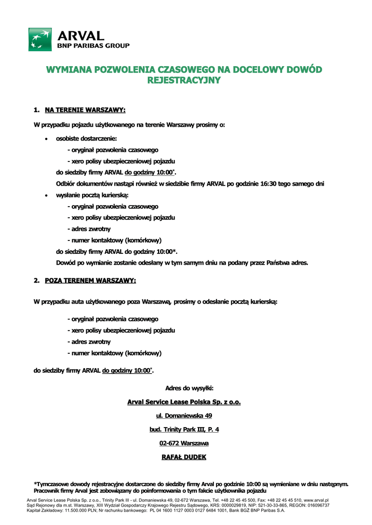 WYMIANA POZWOLENIA CZASOWEGO NA DOCELOWY DOWÓD REJESTRACYJNY 1. NA TERENIE WARSZAWY: W przypadku pojazdu użytkowanego na terenie Warszawy prosimy o: osobiste dostarczenie: - oryginał pozwolenia czasowego - xero polisy ubezpieczeniowej pojazdu do siedziby firmy ARVAL do godziny 10:00*. Odbiór dokumentów nastąpi również w siedzibie firmy ARVAL po godzinie 16:30 tego samego dni wysłanie pocztą kurierską: - oryginał pozwolenia czasowego - xero polisy ubezpieczeniowej pojazdu - adres zwrotny - numer kontaktowy (komórkowy) do siedziby firmy ARVAL do godziny 10:00*. Dowód po wymianie zostanie odesłany w tym samym dniu na podany przez Państwa adres. 2. POZA TERENEM WARSZAWY: W przypadku auta użytkowanego poza Warszawą, prosimy o odesłanie pocztą kurierską: - oryginał pozwolenia czasowego - xero polisy ubezpieczeniowej pojazdu - adres zwrotny - numer kontaktowy (komórkowy) do siedziby firmy ARVAL do godziny 10:00*. Adres do wysyłki: Arval Service Lease Polska Sp. z o.o. ul. Domaniewska 49 bud. Trinity Park III, P. 4 02-672 Warszawa RAFAŁ DUDEK *Tymczasowe dowody rejestracyjne dostarczone do siedziby firmy Arval po godzinie 10:00 są wymieniane w dniu następnym. Pracownik firmy Arval jest zobowiązany do poinformowania o tym fakcie użytkownika pojazdu Arval Service Lease Polska Sp. z o.o., Trinity Park III - ul. Domaniewska 49, 02-672 Warszawa, Tel. +48 22 45 45 500, Fax: +48 22 45 45 510, www.arval.pl Sąd Rejonowy dla m.st. Warszawy, XIII Wydział Gospodarczy Krajowego Rejestru Sądowego, KRS: 0000029819, NIP: 521-30-33-865, REGON: 016096737 Kapitał Zakładowy: 11.500.000 PLN; Nr rachunku bankowego: PL 04 1600 1127 0003 0127 6484 1001, Bank BGŻ BNP Paribas S.A. WYMIANA DOWÓDU REJESTRACYJNEGO (DUPLIKAT) 1. NA TERENIE WARSZAWY: W przypadku pojazdu użytkowanego na terenie Warszawy prosimy o dostarczenie: - oryginał dowodu rejestracyjnego - tablice rejestracyjne do siedziby firmy ARVAL do godziny 10:00. Odbiór dokumentów nastąpi również w siedzibie firmy ARVAL po godzinie 16:30 tego samego dnia. 2. POZA TERENEM WARSZAWY: W przypadku auta użytkowanego poza Warszawą, prosimy o odesłanie pocztą kurierską: - oryginał dowodu rejestracyjnego - tablice rejestracyjne do siedziby firmy ARVAL do godziny 10:00. W przesyłce bardzo prosimy podać adres zwrotny i numer kontaktowy (komórkowy). Adres wysyłki: Arval Service Lease Polska Sp. z o.o. ul. Domaniewska 49 bud. Trinity Park III, P. 4 02-672 Warszawa RAFAŁ DUDEK