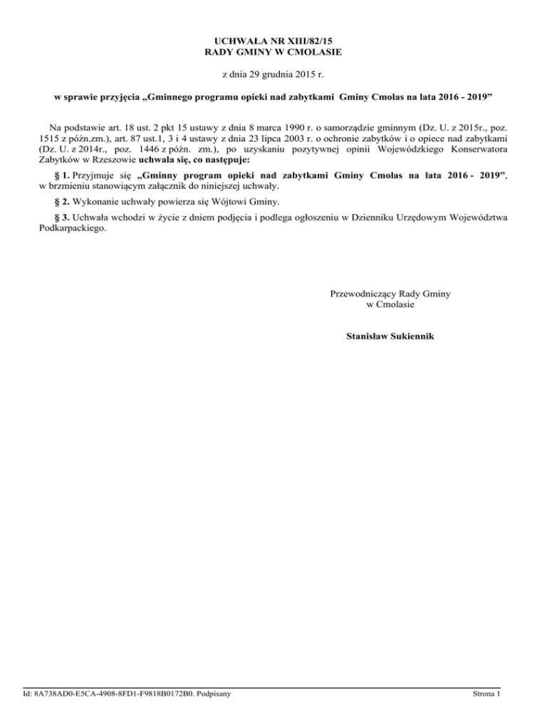 UCHWAŁA NR XIII/82/15 RADY GMINY W CMOLASIE z dnia 29 grudnia 2015 r. w sprawie przyjęcia „Gminnego programu opieki nad zabytkami Gminy Cmolas na lata 2016 - 2019” Na podstawie art. 18 ust. 2 pkt 15 ustawy z dnia 8 marca 1990 r. o samorządzie gminnym (Dz. U. z 2015r., poz. 1515 z późn.zm.), art. 87 ust.1, 3 i 4 ustawy z dnia 23 lipca 2003 r. o ochronie zabytków i o opiece nad zabytkami (Dz. U. z 2014r., poz. 1446 z późn. zm.), po uzyskaniu pozytywnej opinii Wojewódzkiego Konserwatora Zabytków w Rzeszowie uchwala się, co następuje: § 1. Przyjmuje się „Gminny program opieki nad zabytkami Gminy Cmolas na lata 2016 - 2019”, w brzmieniu stanowiącym załącznik do niniejszej uchwały. § 2. Wykonanie uchwały powierza się Wójtowi Gminy. § 3. Uchwała wchodzi w życie z dniem podjęcia i podlega ogłoszeniu w Dzienniku Urzędowym Województwa Podkarpackiego. Przewodniczący Rady Gminy w Cmolasie Stanisław Sukiennik Id: 8A738AD0-E5CA-4908-8FD1-F9818B0172B0. Podpisany Strona 1 Załącznik do uchwały Nr XIII/82/15 Rady Gminy w Cmolasie z dnia 29 grudnia 2015r. GMINNY PROGRAM OPIEKI NAD ZABYTKAMI GMINY CMOLAS NA LATA 2016-2019 I. Postanowienia ogólne Użyte w programie określenia oznaczają: 1) Program - rozumie się przez to Gminny program opieki nad zabytkami Gminy Cmolas na lata 20162019, 2) Konserwator zabytków – rozumie się przez to Podkarpackiego Wojewódzkiego Konserwatora Zabytków w Przemyślu, 3) Gmina – rozumie się przez to Gminę Cmolas 4) Rejestr zabytków – rozumie się przez to rejestr zabytków prowadzony przez Konserwatora Zabytków Województwa Podkarpackiego w Przemyślu. 5) Zabytek – nieruchomość lub rzecz ruchoma, ich części lub zespoły, będące dziełem człowieka lub związane z jego działalnością i stanowiące świadectwo minionej epoki bądź zdarzenia, których zachowanie leży w interesie społecznym ze względu na posiadaną wartość historyczna, artystyczną lub naukową 6) Zabytek nieruchomy – nieruchomość, jej część lub zespół nieruchomości, o których mowa w pkt 4 7) Zabytek ruchomy – rzecz ruchoma, jej część lub zespół rzeczy ruchomych, o których mowa w pkt 4 8) Zabytek archeologiczny – zabytek nieruchomy, będący powierzchnią, podziemną lub podwodną pozostałością egzystencji i działalności człowieka, złożoną z nawarstwień kulturowych i znajdujących się w nich wytworów bądź ich śladów albo zabytek ruchomy, będący tym wytworem, 9) Pomnik przyrody – pojedyncze twory przyrody żywej i nieożywionej lub ich skupienia o szczególnej wartości naukowej, kulturowej, historyczno – pamiątkowej i krajobrazowej oraz odznaczającej się indywidualnymi cechami wyróżniającymi je wśród innych tworów, w szczególności sędziwe i okazałych rozmiarów drzewa i krzewy gatunków rodzimych i obcych, źródła, wodospady, skałki, jary, głazy narzutowe, jaskinie, itp. 10) prace konserwatorskie – działania mające na celu zabezpieczenie i utrwalenie substancji zabytku, zahamowanie procesów jego destrukcji oraz dokumentowanie tych działań, 11) prace restauratorskie – działania mające na celu wyeksponowanie wartości artystycznych i estetycznych zabytku, w tym, jeżeli istnieje taka potrzeba, uzupełnienie lub odtworzenie jego części, oraz dokumentowanie tych działań, 12) roboty budowlane – roboty budowlane w rozumieniu przepisów ustawy Prawo budowlane, podejmowane przy zabytku lub otoczeniu zabytku, 13) badania konserwatorskie – działania mające na celu rozpoznanie historii i funkcji zabytku, ustalenie użytych do jego wykonania materiałów i zastosowanych technologii, określenie stanu zachowana tego zabytku oraz opracowanie diagnozy, projektu i programu prac konserwatorskich, a jeżeli istnieje taka potrzeba, również programu prac restauratorskich, 14) badania architektoniczne – działania ingerujące w substancję zabytku, mające na celu rozpoznanie i udokumentowanie pierwotnej formy obiektu budowlanego oraz ustalenie zakresu jego kolejnych przekształceń, 15) badania archeologiczne – działania mające na celu odkrycie, rozpoznanie, udokumentowanie i zabezpieczenie zabytku archeologicznego, 16) historyczny układ urbanistyczny lub ruralistyczny – przestrzenne założenie miejskie lub wiejskie, zawierające zespoły budowlane, pojedyncze budynki i formy zaprojektowanej zieleni, rozmieszczone w układzie historycznych podziałów własnościowych i funkcjonalnych, w tym ulic lub sieci dróg, Id: 8A738AD0-E5CA-4908-8FD1-F9818B0172B0. Podpisany Strona 1 17) historyczny zespół budowlany – powiązana przestrzennie grupa budynków wyodrębniona ze względu na formę architektoniczną, styl, zastosowane materiały, funkcję, czas powstania lub związek z wydarzeniami historycznymi, 18) krajobraz kulturowy – przestrzeń historycznie ukształtowana w wyniku działalności człowieka, zawierająca wytwory cywilizacji oraz elementy przyrodnicze, 19) otoczenie – teren wokół lub przy zabytku wyznaczonym w decyzji o wpisie tego terenu do rejestru zabytków w celu ochrony wartości widokowych zabytku oraz jego ochrony przed szkodliwym oddziaływaniem czynników zewnętrznych. Obowiązek opieki nad zabytkami nakładają na samorządy ustawy: • ustawa z dnia 8 marca 1990 roku o samorządzie gminnym (Dz. U. z 2015r. poz. 1515 z późn. zm.), • ustawa z dnia 23 lipca 2003 roku o ochronie zabytków i opiece nad zabytkami.( j.t. Dz. U. z 2014r. poz. 1446 z późn. zm.), ustawa z dnia 8 marca 1990 roku o samorządzie gminnym w art. 7 wśród zadań własnych gmin wymienia sprawy kultury, w tym bibliotek gminnych i innych instytucji kultury, oraz ochrony zabytków i opieki nad zabytkami. Ustawa z dnia 23 lipca 2003 roku o ochronie zabytków i opiece nad zabytkami nakłada na organy samorządowe w szczególności obowiązek: uwzględniania ochrony zabytków przy sporządzaniu i aktualizacji strategii rozwoju gmin, studiów uwarunkowań i kierunków zagospodar