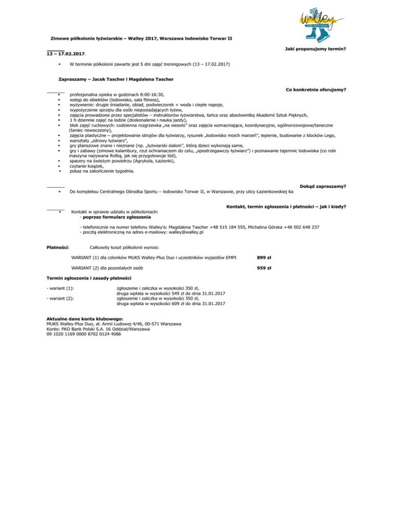 Zimowe półkolonie łyżwiarskie – Walley 2017, Warszawa lodowisko Torwar II Jaki proponujemy termin? 13 – 17.02.2017. W terminie półkolonii zawarte jest 5 dni zajęć treningowych (13 – 17.02.2017) Zapraszamy – Jacek Tascher i Magdalena Tascher Co konkretnie oferujemy? profesjonalna opieka w godzinach 8:00-16:30, wstęp do obiektów (lodowisko, sala fitness), wyżywienie: drugie śniadanie, obiad, podwieczorek + woda i ciepłe napoje, wypożyczenie sprzętu dla osób nieposiadających łyżew, zajęcia prowadzone przez specjalistów – instruktorów łyżwiarstwa, tańca oraz absolwentkę Akademii Sztuk Pięknych, 1 h dziennie zajęć na lodzie (doskonalenie i nauka jazdy), blok zajęć ruchowych: codzienna rozgrzewka „na wesoło” oraz zajęcia wzmacniające, koordynacyjne, ogólnorozwojowe/taneczne (taniec nowoczesny), zajęcia plastyczne – projektowanie strojów dla łyżwiarzy, rysunek „lodowisko moich marzeń”, lepienie, budowanie z klocków Lego, warsztaty „zdrowy łyżwiarz”, gry planszowe znane i nieznane (np. „łyżwiarski slalom”, którą dzieci wykonają same, gry i zabawy (zimowe kalambury, rzut ochraniaczem do celu, „spostrzegawczy łyżwiarz”) i poznawanie tajemnic lodowiska (co robi maszyna nazywana Rolbą, jak się przygotowuje lód), spacery na świeżym powietrzu (Agrykola, Łazienki), czytanie książek, pokaz na zakończenie tygodnia. Dokąd zapraszamy? Do kompleksu Centralnego Ośrodka Sportu – lodowisko Torwar II, w Warszawie, przy ulicy Łazienkowskiej 6a Kontakt, termin zgłoszenia i płatności – jak i kiedy? Kontakt w sprawie udziału w półkoloniach: - poprzez formularz zgłoszenia - telefonicznie na numer telefonu Walley’a: Magdalena Tascher +48 515 184 555, Michalina Górska +48 502 648 237 - pocztą elektroniczną na adres e-mailowy: [email protected] Płatności: Całkowity koszt półkolonii wynosi: WARIANT (1) dla członków MUKS Walley-Plus Duo i uczestników wyjazdów EMPI 899 zł WARIANT (2) dla pozostałych osób 959 zł Termin zgłoszenia i zasady płatności - wariant (1): - wariant (2): zgłoszenie i zaliczka w wysokości 350 zł, druga wpłata w wysokości 549 zł do dnia 31.01.2017 zgłoszenie i zaliczka w wysokości 350 zł, druga wpłata w wysokości 609 zł do dnia 31.01.2017 Aktualne dane konta klubowego: MUKS Walley-Plus Duo, al. Armii Ludowej 4/46, 00-571 Warszawa Konto: PKO Bank Polski S.A. 16 Oddział/Warszawa 09 1020 1169 0000 8702 0124 4086