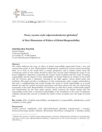 ISSN 2392-0890, no 5/2016, pp. 3-27, DOI: 10.5604/23920890.1215484 Nowy wymiar etyki odpowiedzialności globalnej A New Dimension of Etihcs of Global Responsibility ZDZISŁAWA PIĄTEK Instytut Filozofii, Uniwersytet Jagielloński, ul. Grodzka 52, 31-044 Kraków, E-mail: [email protected] Abstract The article addresses the issue of ethics of global responsibility approached from a new and cosmocentric point of view. Philosophical considerations enriched by current natural knowledge allow us to look at the world from a cosmic perspective and at human nature from the evolutionary point of view which should be taken into account when defining the scope of our moral obligations. Questions concerning the human moral condition and the scope of human responsibility and the impact of that responsibility on human behavior in relation to the Earth and the Universe gain a distinctive meaning in the fight against various global perils and problems. The paper provides a justification of why contemporary ethics requires reformulation and such a complementing that would broaden the scope of moral responsibility so it would include not only the current and future generations and other species, but also the whole living community of the earth. Responsibility is treated here as a link that is ontic, evolutionarily shaped and characteristic for the homo sapiens species, which connects the human beings with the surrounding world. Such a conceived responsibility is the foundation of the sense of planetary solidarity and provides reasons to include the whole cosmic ecosphere into the scope of moral care. Streszczenie Artykuł porusza zagadnienie etyki odpowiedzialności globalnej rozpatrywanej z nowego, kosmocentrycznego punktu widzenia. Rozważania filozoficzne wzbogacone o aktualną wiedzę - - - Key words: ethics of global responsibility, ontologization of responsibility, globalization, moral condition of homo sapiens - - Niektóre idee zawarte w artykule zostały zaprezentowane w referacie „Zadomowienie człowieka we wszechświecie, czyli nowy wymiar etyki odpowiedzialności globalnej” wygłoszonym na IX Forum Etycznym w Krakowie (22– 24.06.2016 r.). Piątek/Studies in Global Ethics and Global Education/ no 5/2016, pp. 3-27 przyrodniczą pozwalają spojrzeć na świat z perspektywy kosmicznej, na naturę ludzką zaś z perspektywy ewolucyjnej, co z kolei powinno znaleźć odzwierciedlenie w zakresie naszych zobowiązań moralnych. W obliczu różnorodnych zagrożeń i problemów globalnych pytania o moralną kondycję człowieka, zakres jego odpowiedzialności i wpływ tejże odpowiedzialności na jego funkcjonowanie na Ziemi i we Wszechświecie nabierają szczególnego znaczenia. W artykule uzasadniono, dlaczego współczesna etyka wymaga przeformułowania i uzupełnienia w kwestii poszerzenia zakresu odpowiedzialności moralnej nie tylko na obecne i przyszłe pokolenia czy inne gatunki, ale na całą ziemską wspólnotę życia. Odpowiedzialność została potraktowana jako ontyczny, ewolucyjnie ukształtowany i charakterystyczny dla gatunku homo sapiens rodzaj więzi łączący człowieka z otaczającym go światem. Tak rozumiana odpowiedzialność stanowi fundament poczucia planetarnej solidarności i daje podstawy do otoczenia troską moralną całej kosmicznej ekosfery. Słowa kluczowe: etyka odpowiedzialności globalnej, ontologizacja odpowiedzialności, globalizacja, moralna kondycja homo sapiens 1. KOSMICZNY WYMIAR ETYKI ODPOWIEDZIALNOŚCI GLOBALNEJ Myślą przewodnią moich rozważań będzie uzasadnienie twierdzenia, że dyskusja na temat poszerzenia zakresu odpowiedzialności na całą ziemską wspólnotę życia może wiele zyskać, jeżeli wzbogacimy ją o wiedzę przyrodniczą, w tym o wiedzę pozwalającą przyjmować tzw. wszechświatowy punkt widzenia1. Sądzę bowiem, że ów „wszechświatowy punkt widzenia” umożliwia dostrzeżenie współzależności losów i poczucie solidarności nie tylko ze wszystkimi ludźmi zamieszkującymi Ziemię, ale także ze wszystkimi istotami żywymi tworzącymi biosferę. I to poczucie planetarnej solidarności może skłaniać rozumny gatunek ludzki do podejmowania odpowiedzialnego działania na rzecz dobrostanu całej wspólnoty. Umożliwia także dostrzeżenie „kruchości” ziemskiego życia w obliczu zagrożeń ze strony kosmicznej ekosfery. Oba czynniki, - zarówno świadomość wspólnoty losów wszystkich organizmów zamieszkujących ziemskie środowisko, jak i świadomość jego „kruchości” w obliczu różnorodnych zagrożeń globalnych, to - - mogą być czynniki jednoczące ludzi i motywujące ich do podejmowania odpowiedzialności za Pojęcie „wszechświatowy punkt widzenia” wprowadziła Hanna Arendt w Kondycji ludzkiej (Arendt, 2000), analizując nowożytny przełom w nauce i filozofii. Rozważając problemy filozoficzne, będę swobodnie korzystała z dostępnej wiedzy przyrodniczej. - - 1 4 Piątek/Studies in Global Ethics and Global Education/ no 5/2016, pp. 3-27 jego trwanie. Mówiąc o „kruchości życia”, mam na myśli stosunkowo wąski zakres parametrów fizykochemicznych, w których życie może trwać i zwiększać swoje możliwości. Wielu współczesnych filozofów, którzy przyczynili się do powstania etyki odpowiedzialności globalnej, uznaje, że dotyczy ona wartościowania oraz zasad postępowania wobec różnorodnych zjawisk o zasięgu globalnym. Chodzi zarówno o zjawiska dotyczące stosunków międzyludzkich, takie jak np. odpowiedzialność za zjawisko eksplozji demograficznej czy procesy polaryzacji świata na bogatych i biednych, jak i o zmiany wywołane działalnością ludzi w Przyrodzie, jak tempo narastania efektu cieplarnianego czy nadmierne eksploatowanie łowisk i wszystkich innych zasobów naturalnych (np. wyczerpywanie zasobów wody pitnej). Są to niezwykle ważne problemy współczesnego świata, które spychamy na margines dopóty, dopóki nie urosną do takich rozmiarów, że ujawni