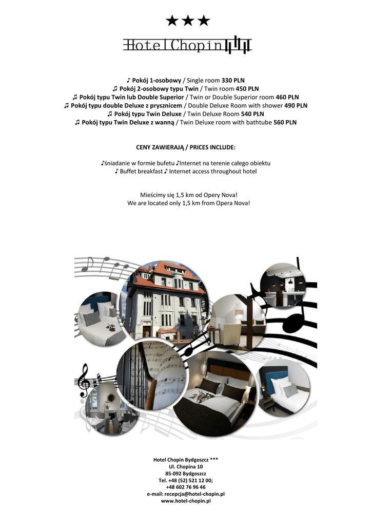 ♪ Pokój 1-osobowy / Single room 330 PLN ♫ Pokój 2-osobowy typu Twin / Twin room 450 PLN ♫ Pokój typu Twin lub Double Superior / Twin or Double Superior room 460 PLN ♫ Pokój typu double Deluxe z prysznicem / Double Deluxe Room with shower 490 PLN ♫ Pokój typu Twin Deluxe / Twin Deluxe Room 540 PLN ♫ Pokój typu Twin Deluxe z wanną / Twin Deluxe room with bathtube 560 PLN CENY ZAWIERAJĄ / PRICES INCLUDE: ♪śniadanie w formie bufetu ♪Internet na terenie całego obiektu ♪ Buffet breakfast ♪ Internet access throughout hotel Mieścimy się 1,5 km od Opery Nova! We are located only 1,5 km from Opera Nova! Hotel Chopin Bydgoszcz *** Ul. Chopina 10 85-092 Bydgoszcz Tel. +48 (52) 521 12 00; +48 602 76 96 46 e-mail: [email protected] www.hotel-chopin.pl