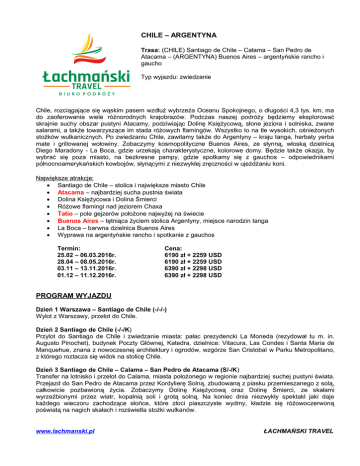 CHILE – ARGENTYNA Trasa: (CHILE) Santiago de Chile – Calama – San Pedro de Atacama – (ARGENTYNA) Buenos Aires – argentyńskie rancho i gaucho Typ wyjazdu: zwiedzanie Chile, rozciągające się wąskim pasem wzdłuż wybrzeża Oceanu Spokojnego, o długości 4,3 tys. km, ma do zaoferowania wiele różnorodnych krajobrazów. Podczas naszej podróży będziemy eksplorować skrajnie suchy obszar pustyni Atacamy, podziwiając Dolinę Księżycową, słone jeziora i solniska, zwane salarami, a także towarzyszące im stada różowych flamingów. Wszystko to na tle wysokich, ośnieżonych stożków wulkanicznych. Po zwiedzaniu Chile, zawitamy także do Argentyny – kraju tanga, herbaty yerba mate i grillowanej wołowiny. Zobaczymy kosmopolityczne Buenos Aires, ze słynną, włoską dzielnicą Diego Maradony - La Boca, gdzie urzekają charakterystyczne, kolorowe domy. Będzie także okazja, by wybrać się poza miasto, na bezkresne pampy, gdzie spotkamy się z gauchos – odpowiednikami północnoamerykańskich kowbojów, słynącymi z niezwykłej zręczności w ujeżdżaniu koni. Największe atrakcje: Santiago de Chile – stolica i największe miasto Chile Atacama – najbardziej sucha pustnia świata Dolina Księżycowa i Dolina Śmierci Różowe flamingi nad jeziorem Chaxa Tatio – pole gejzerów położone najwyżej na świecie Buenos Aires – tętniąca życiem stolica Argentyny, miejsce narodzin tanga La Boca – barwna dzielnica Buenos Aires Wyprawa na argentyńskie rancho i spotkanie z gauchos Termin: 25.02 – 06.03.2016r. 28.04 – 08.05.2016r. 03.11 – 13.11.2016r. 01.12 – 11.12.2016r. Cena: 6190 zł + 2259 USD 6190 zł + 2259 USD 6390 zł + 2298 USD 6390 zł + 2298 USD PROGRAM WYJAZDU Dzień 1 Warszawa – Santiago de Chile (-/-/-) Wylot z Warszawy, przelot do Chile. Dzień 2 Santiago de Chile (-/-/K) Przylot do Santiago de Chile i zwiedzanie miasta: pałac prezydencki La Moneda (rezydował tu m. in. Augusto Pinochet), budynek Poczty Głównej, Katedra, dzielnice: Vitacura, Las Condes i Santa Maria de Manquehue, znana z nowoczesnej architektury i ogrodów, wzgórze San Cristobal w Parku Metropolitano, z którego roztacza się widok na stolicę Chile. Dzień 3 Santiago de Chile – Calama – San Pedro de Atacama (S/-/K) Transfer na lotnisko i przelot do Calama, miasta położonego w regionie najbardziej suchej pustyni świata. Przejazd do San Pedro de Atacama przez Kordylierę Solną, zbudowaną z piasku przemieszanego z solą, całkowicie pozbawioną życia. Zobaczymy Dolinę Księżycową oraz Dolinę Śmierci, ze skałami wyrzeźbionymi przez wiatr, kopalnią soli i grotą solną. Na koniec dnia niezwykły spektakl jaki daje każdego wieczoru zachodzące słońce, które złoci piaszczyste wydmy, kładzie się różowoczerwoną poświatą na nagich skałach i rozświetla stożki wulkanów. www.lachmanski.pl ŁACHMAŃSKI TRAVEL Dzień 4 San Pedro de Atacama (S/-/K) Wcześnie rano wyjazd na wycieczkę do miejsc znanych odkryć archeologicznych. Zobaczymy usytuowaną na zboczu góry twierdzę inkaską z XII w. - Pukara de Quitor. W wiosce Tulor odwiedzimy najstarsze archeologiczne obiekty płaskowyżu, z lat 800-500 p.n.e. Przejazd do Salar de Atacama – największego solniska na pustyni. Po drodze wizyta w wiosce Toconao, w której budynki mieszkalne wybudowane zostały ze skał wulkanicznych. Przejazd nad Jezioro Chaxa, będące siedliskiem różowych flamingów. Pozostaniemy tu do zachodu słońca. Dzień 5 San Pedro de Atacama – Calama – Santiago de Chile (S/-/K) Wczesnym rankiem wyjazd na podziwianie Tatio – najwyżej położonego pola gejzerów na świecie. W drodze powrotnej do San Pedro wizyta w na wpół opuszczonej osadzie Machuco, której nieliczni mieszkańcy zajmują się hodowlą lam i produkcją serów. Transfer na lotnisko i przelot do Santiago de Chile. Dzień 6 Santiago de Chile – Buenos Aires (S/-/K) Transfer na lotnisko w Santiago, przelot do Buenos Aires. Po przylocie przejazd do centrum i zwiedzanie najbardziej atrakcyjnych miejsc w Buenos Aires: Plaza de Mayo i San Telmo, Różowy Dom - niedostępny w czasach dyktatury pałac prezydencki, Katedra Metropolitarna i Muzeum Cabildo. Plaza de Mayo zawsze stanowił najważniejsze miejsce spotkań Argentyńczyków. Budynek Muzeum Cabildo, usytuowany w sercu miasta, jest symbolem niepodległości, jako że pierwszy argentyński rząd zaczął w nim rezydować w 1810 r. Obszar San Telmo, który także jest częścią Starego Miasta, jest znany ze swoich urokliwych zakątków z brukowanymi uliczkami, historycznych budynków, targu antyków i życia kulturalnego; La Boca - kolorowa dzielnica, gdzie narodziły się tango i piłka nożna, klub sportowy Diego Maradony. Kolacja w dzielnicy San Telmo z „Tango Show”. Dzień 7 Buenos Aires (S/-/K) Zwiedzanie Buenos: Recoleta - jedno z najbardziej luksusowych miejsc w mieście, gdzie warto odwiedzić ekstrawaganckie restauracje, bary i puby, usytuowane pośród renomowanych hoteli, ale także zabytkowy cmentarz i katedrę (Cmentarz Recoleta i Kościół del Pilar). Należący do mnichów z Recolety, cmentarz, został otwarty w 1822 r. i spoczywają na nim jedynie wyznawcy katolicyzmu. Dziś można na nim zobaczyć grobowce ojców założycieli i najważniejszych, najbardziej wpływowych obywateli Argentyny (najsłynniejszą osobą pochowaną na cmentarzu jest Evita Peron). Dzień 8 Argentyńskie rancho i gaucho (S/L/K) Wybierzemy się na wycieczkę na wieś, gdzie poczujemy atmosferę i urok życia w typowej, argentyńskiej hacjendzie na bezkresnych pampach. Poznamy codzienne zajęcia kowbojów, czyli „gauchos”, zajmujących się wypasem bydła. Poznany kwintesencję argentyńskich obyczajów kulinarnych - asado, czyli grill na świeżym powietrzu. Będzie tez okazja poprzyglądać się pracy argentyńskich gauchos, ulubieńców wszystkich kobiet świata. Dzień 9 Buenos Aires (opcja – Montevideo) (S/-/K) Dzień wolny na odpoczynek lub indywidu