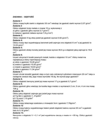 ZADANIA - GĘSTOŚĆ Zadanie 1 Oblicz masę bryłki siarki o objętości 30 cm 3 wiedząc że gęstość siarki wynosi 2,07 g/cm 3. Zadanie 2 Oblicz objętość bryły metalu o masie 10 g, wykonanej z a) glinu ( gęstość glinu wynosi 2,7 g/cm 3) b) żelaza ( gęstość żelaza wynosi 7,8 g /cm3) Zadanie 3. Oblicz objętość 5 kg oliwy jeżeli jej gęstość wynosi 0,92 g/cm 3). Zadanie 4. Oblicz masę rtęci wypełniającą barometr jeśli zajmuje ona objętość 6 cm 3 a jej gęstość to 13,53 g/cm3. Zadanie 5. Oblicz gęstość złotej monety jeżeli jej masa wynosi 39,5 g a objętość jaką zajmuje to 19,6 cm3. Zadanie 6. Uczeń otrzymał 4 kostki pewnych metali, każda o objętości 10 cm 3. Który metal ma największą a który najmniejszą masę : a) złoto o gęstości 19,28 g/cm 3 b) srebro o gęstości 10,50 g/cm3 c) miedź o gęstości 18,93 g/cm 3 d) ołów o gęstości 11,34 g/cm 3 Zadanie 7. Uczeń chciał określić gęstość oleju w tym celu odmierzył cylindrem miarowym 20 cm 3 oleju a następnie zważył olej, jego masa wynosiła 18,4g. Ile wynosi jego gęstość? Zadanie 8. Oblicz objętość benzyny jeżeli jej masa wynosi 17 g a gęstość 0,7 g/cm 3. Zadanie 9. Oblicz gęstość glinu wiedząc że kostka tego metalu o wymiarach 2 cm, 5 cm, 4 cm ma masę 108 g. Zadanie 10. Oblicz jaką objętość zajmuje gaz jeżeli jego masa wynosi a)11g tlen o gęstości 1, 31g/dm 3 b)1,7g azot 1,15 g/dm3 Zadanie 11. Oblicz masę żelaznego sześcianu o krawędzi 3cm i gęstości 7,78g/cm 3. Zadanie 12 Oblicz masę balonu wypełnionego helem jeżeli objętość balonu wynosi 20 cm 3 a gęstość helu to 0,16 g/dm3. Zadanie 13. Naczynie o objętości V = 0,1 m³ jest wypełnione cieczą o masie m = 85 kg. Oblicz gęstość cieczy.
