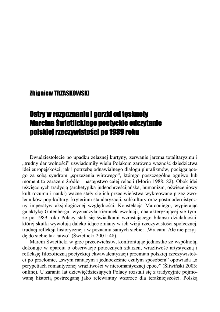 Zbigniew TRZASKOWSKI Ostry w rozpoznaniu i gorzki od tęsknoty Marcina Świetlickiego poetyckie odczytanie polskiej rzeczywistości po 1989 roku Dwudziestolecie po upadku żelaznej kurtyny, zerwanie jarzma totalitaryzmu i „trudny dar wolności” uświadomiły wielu Polakom zarówno ważność dziedzictwa idei europejskości, jak i potrzebę odnawialnego dialogu pluralizmów, pociągającego za sobą syndrom „sprzężenia wirowego”, którego poszczególne ogniwo lub moment to zarazem źródło i następstwo całej relacji (Morin 1988: 82). Obok idei uświęconych tradycją (archetypika judeochrześcijańska, humanizm, oświeceniowy kult rozumu i nauki) ważne stały się ich przeciwieństwa wykreowane przez zwolenników pop-kultury: kryterium standaryzacji, subkultury oraz postmodernistyczny imperatyw aksjologicznej względności. Konstelacja Marconiego, wypierając galaktykę Gutenberga, wyznaczyła kierunek ewolucji, charakteryzującej się tym, że po 1989 roku Polacy stali się świadkami wzrastającego bilansu działalności, której skutki wywołują daleko idące zmiany w ich wizji rzeczywistości społecznej, trudnej refleksji historycznej i w poznaniu samych siebie: „Wracam. Ale nie przyjdę do siebie tak łatwo” (Świetlicki 2001: 48). Marcin Świetlicki w grze przeciwieństw, konfrontując jednostkę ze wspólnotą, dokonuje w oparciu o obserwacje potocznych zdarzeń, wrażliwość artystyczną i refleksję filozoficzną poetyckiej ekwiwalentyzacji przemian polskiej rzeczywistości po przełomie, „swym raniącym i jednocześnie czułym sposobem” opowiada „o perypetiach romantycznej wrażliwości w nieromantycznej epoce” (Śliwiński 2003: online). U zarania lat dziewięćdziesiątych Polacy rozstali się z tradycyjnie pojmowaną historią postrzeganą jako relewantny wzorzec dla teraźniejszości. Polską Zbigniew TRZASKOWSKI rzeczywistość po roku 1989 u samych jej podstaw cechuje rozdwojenie. Pozornej tożsamości towarzyszy antynomiczność, paradoksalnie umożliwiająca równowagę światopoglądową o wyższej jakości. O sile (vel słabości) coincidentia oppositorum stanowi nieustanna zdolność do samokrytyki z trudną jednak do wyobrażenia sytuacją, iż kolejne pokolenia „połączą wszystkie tradycje sprzeczne w harmonijną całość, że będą jednocześnie panteistami, teistami i ateistami, liberałami i wyznawcami totalitaryzmu, entuzjastami przemocy i przeciwnikami przemocy” (Kołakowski 1982: 19). Poeta, naśladowca pokolenia beat generation lat sześćdziesiątych ubiegłego stulecia, pryncypialnie, by nie rzec teatralnie, opowiada się przeciw wszelkim instytucjom; drwi z komercjalizacji kultury wysokiej, makdonaldyzacji życia społecznego: „Czasami jestem hamburgerem. / sterczy ze mnie sałata i musztarda cieknie” (Świetlicki 2009: online); krytykuje usilne tworzenie panteonu nowych bohaterów narodowych, zwanych „etosowcami”: „Te autobiografizmy / się wreszcie już skończyły” (Świetlicki 2006: 30), pompatyczne obchodzenie jubileuszy państwowych i świąt kościelnych z udziałem oficjeli; szydzi z bezustannego per fas et nefas populistycznego zabiegania polityków o przychylność potencjalnych wyborców; naśmiewa się z ksenofobii i prowincjonalizmu salonu towarzyskoliterackiego. Prowokuje czytelnika wulgaryzmami i zdecydowanie kontestuje wszelkie nadęte „izmy” świadomy, że stare wzorce utrudniają rozpoznanie i przyswojenie upragnionej Zmiany, której ziszczenie wywołało nie tylko wśród obserwatorów, ale nawet i u samych przygotowujących Nowe – szok: „Dlaczego twój niepokój tak obraca się wokół wyrazów: / niepodległość – wolność – równość – braterstwo – Polska” (Świetlicki 2009: online). Pierwszy entuzjazm po przełomie zastępuje powoli rozgoryczenie. Złudnym okazuje się poza-rozumowe przekonanie o zasadniczo dobrym świecie, powracającym po każdym zakłóceniu ładu „do równowagi na zasadzie homeostazy” (Fiut 1999: 208). Myślenie w wymiarze europejskim – by posłużyć się formułą Jerzego Giedrojcia – nie padło na podatny grunt. Marzenia intelektualistów, po chwilowym triumfie „Solidarności” z początku lat osiemdziesiątych, o „społeczeństwie otwartym” sfederalizowanej środkowej Europy, owoc wyobraźni Zbigniewa Herberta, Czesława Miłosza, zainspirowanych liberalną myślą György’ego Konráda, nabrały charakteru konstrukcji z pogranicza political fiction i wishul thinking, rozpłynęły się w „brzydkich” realiach ostatniej dekady ubiegłego stulecia. „Wojna na górze”, groteskowa „gruba kreska”, żałosna wyprzedaż narodowej mitologii, wyciąganie z tajnych archiwów bezpieki „haków” na oponentów politycznych rozmyły prawdę o katach i ofiarach peerelowskiej przeszłości. W bezpardonową, pełną oportunizmu walkę o rząd dusz nad „ciemną masą, która i tak wszystko kupi”, włączyły się media, stosując Orwellowskie metody manipulowania opinią publiczną. Partie polityczne powoli stawały się zakładnikami sondaży i dziennikarzy: „Ludzie po rynku krążą. Wielki telewizor”; „ – Gazetę / na twarz świata / – i jazda” (Świetlicki 2009: online). 226 Ostry w rozpoznaniu i gorzki od tęsknoty Przystosowanie do kłamstwa, łatwy rozrost „samototalizmu” (Havel) społecznego łączą się z powszechną niechęcią człowieka-konsumenta do poświęcania czegokolwiek ze zdobyczy materialnych na rzecz własnej autonomii duchowej i moralnej: „Nie odróżniający prymasa od premiera. / Z tylko jedną ambicją: zasnąć/ w cieple” (Świetlicki 2009: online). Podobni do niewolników, marzących o ucieczce do wolności (Fromm), po wyzwoleniu z jednego zniewolenia czym prędzej szukają sobie innego ciemiężcy. Jedni, naznaczeni piętnem homo sovieticus zażądali od nowej władzy, by w krótkim okresie spełniła wymagania, jakim przez dziesięciolecia nie sprostali komuniści, oczekują