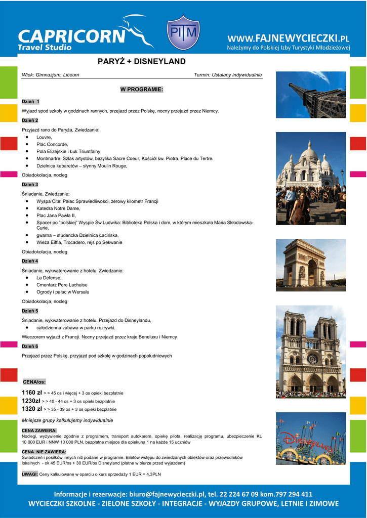 PARYŻ + DISNEYLAND Wiek: Gimnazjum, Liceum Termin: Ustalany indywidualnie W PROGRAMIE: Dzień 1 Wyjazd spod szkoły w godzinach rannych, przejazd przez Polskę, nocny przejazd przez Niemcy. Dzień 2 Przyjazd rano do Paryża, Zwiedzanie: Louvre, Plac Concorde, Pola Elizejskie i Łuk Triumfalny Montmartre: Szlak artystów, bazylika Sacre Coeur, Kościół św. Piotra, Place du Tertre. Dzielnica kabaretów – słynny Moulin Rouge, Obiadokolacja, nocleg Dzień 3 Śniadanie, Zwiedzanie; Wyspa Cite: Pałac Sprawiedliwości, zerowy kilometr Francji gwarna – studencka Dzielnica Łacińska, Katedra Notre Dame, Plac Jana Pawła II, Spacer po ”polskiej” Wyspie Św.Ludwika: Biblioteka Polska i dom, w którym mieszkała Maria SkłodowskaCurie, Wieża Eiffla, Trocadero, rejs po Sekwanie Obiadokolacja, nocleg Dzień 4 Śniadanie, wykwaterowanie z hotelu. Zwiedzanie: La Defense, Cmentarz Pere Lachaise Ogrody i pałac w Wersalu Obiadokolacja, nocleg Dzień 5 Śniadanie, wykwaterowanie z hotelu. Przejazd do Disneylandu, całodzienna zabawa w parku rozrywki. Wieczorem wyjazd z Francji. Nocny przejazd przez kraje Beneluxu i Niemcy Dzień 6 Przejazd przez Polskę, przyjazd pod szkołę w godzinach popołudniowych CENA/os: 1160 zł > > 45 os i więcej + 3 os opieki bezpłatnie 1230zł > > 40 - 44 os + 3 os opieki bezpłatnie 1320 zł > > 35 - 39 os + 3 os opieki bezpłatnie Mniejsze grupy kalkulujemy indywidualnie CENA ZAWIERA: Noclegi, wyżywienie zgodnie z programem, transport autokarem, opiekę pilota, realizację programu, ubezpieczenie KL 10 000 EUR i NNW 10 000 PLN, bezpłatne miejsce dla opiekuna 1 na każde 15 uczniów CENA NIE ZAWIERA: Świadczeń i posiłków innych niż podane w programie. Biletów wstępu do zwiedzanych obiektów oraz przewodników lokalnych - ok 45 EUR/os + 30 EUR/os Disneyland (płatne w biurze przed wyjazdem) UWAGI: Ceny kalkulowane w oparciu o kurs sprzedaży 1 EUR = 4,3PLN