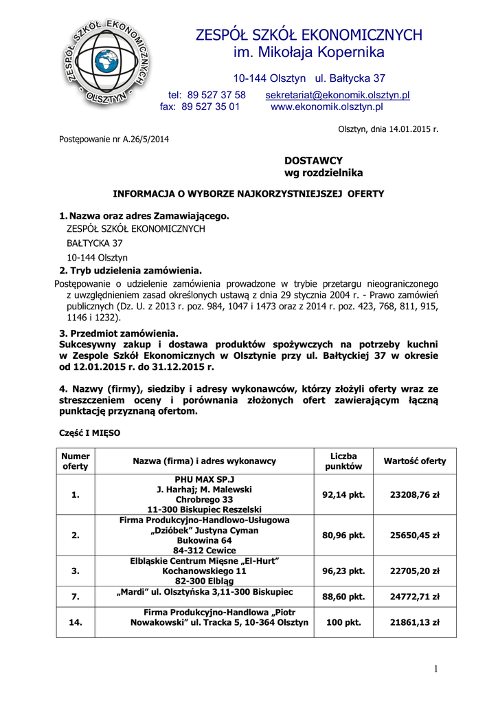 ZESPÓŁ SZKÓŁ EKONOMICZNYCH im. Mikołaja Kopernika 10-144 Olsztyn ul. Bałtycka 37 tel: 89 527 37 58 fax: 89 527 35 01 [email protected] www.ekonomik.olsztyn.pl Olsztyn, dnia 14.01.2015 r. Postępowanie nr A.26/5/2014 DOSTAWCY wg rozdzielnika INFORMACJA O WYBORZE NAJKORZYSTNIEJSZEJ OFERTY 1. Nazwa oraz adres Zamawiającego. ZESPÓŁ SZKÓŁ EKONOMICZNYCH BAŁTYCKA 37 10-144 Olsztyn 2. Tryb udzielenia zamówienia. Postępowanie o udzielenie zamówienia prowadzone w trybie przetargu nieograniczonego z uwzględnieniem zasad określonych ustawą z dnia 29 stycznia 2004 r. - Prawo zamówień publicznych (Dz. U. z 2013 r. poz. 984, 1047 i 1473 oraz z 2014 r. poz. 423, 768, 811, 915, 1146 i 1232). 3. Przedmiot zamówienia. Sukcesywny zakup i dostawa produktów spożywczych na potrzeby kuchni w Zespole Szkół Ekonomicznych w Olsztynie przy ul. Bałtyckiej 37 w okresie od 12.01.2015 r. do 31.12.2015 r. 4. Nazwy (firmy), siedziby i adresy wykonawców, którzy złożyli oferty wraz ze streszczeniem oceny i porównania złożonych ofert zawierającym łączną punktację przyznaną ofertom. Część I MIĘSO Numer oferty 1. 2. 3. 7. 14. Nazwa (firma) i adres wykonawcy PHU MAX SP.J J. Harhaj; M. Malewski Chrobrego 33 11-300 Biskupiec Reszelski Firma Produkcyjno-Handlowo-Usługowa „Dzióbek” Justyna Cyman Bukowina 64 84-312 Cewice Elbląskie Centrum Mięsne „El-Hurt” Kochanowskiego 11 82-300 Elbląg „Mardi” ul. Olsztyńska 3,11-300 Biskupiec Firma Produkcyjno-Handlowa „Piotr Nowakowski” ul. Tracka 5, 10-364 Olsztyn Liczba punktów Wartość oferty 92,14 pkt. 23208,76 zł 80,96 pkt. 25650,45 zł 96,23 pkt. 22705,20 zł 88,60 pkt. 24772,71 zł 100 pkt. 21861,13 zł 1 Część II Wędliny Numer oferty 1. 2. 3. 7. Nazwa (firma) i adres wykonawcy PHU MAX SP.J J. Harhaj; M. Malewski Chrobrego 33 11-300 Biskupiec Reszelski Firma Produkcyjno-Handlowo-Usługowa „Dzióbek” Justyna Cyman Bukowina 64 84-312 Cewice Elbląskie Centrum Mięsne „El-Hurt” Kochanowskiego 11 82-300 Elbląg Mardi” ul. Olsztyńska 3,11-300 Biskupiec Liczba punktów Wartość oferty 97,79 pkt. 50270,92 zł 73,06 pkt. 65366,96 zł 94,31 pkt. 53473,60 zł 90,66 pkt. 55749,71 zł Liczba punktów Wartość oferty 92,79 pkt. 19891,20 zł 85,39 pkt. 20994,75 zł 99,77 pkt. 18872,00 zł 88,85 pkt. 21321,00 zł 99,69 pkt. 18933,00 zł Część III Drób Numer oferty 1. 2. 3. 7. 14. Nazwa (firma) i adres wykonawcy PHU MAX SP.J J. Harhaj; M. Malewski Chrobrego 33 11-300 Biskupiec Reszelski Firma Produkcyjno-Handlowo-Usługowa „Dzióbek” Justyna Cyman Bukowina 64 84-312 Cewice Elbląskie Centrum Mięsne „El-Hurt” Kochanowskiego 11 82-300 Elbląg Mardi” ul. Olsztyńska 3,11-300 Biskupiec Firma Produkcyjno-Handlowa „Piotr Nowakowski” ul. Tracka 5, 10-364 Olsztyn Część IV Pieczywo Numer oferty 1. 13. Nazwa (firma) i adres wykonawcy FPH „Marcel” Sylwester Kołecki ul. Kościuszki 23/A 11-320 Jeziorany „Społem” Powszechna Spółdzielnia Spożywców ul. Hoża 1 11-100 Lidzbark Warmiński Liczba punktów Wartość oferty 100 pkt. 10970,24 zł OFERTA ODRZUCONA W toku badania ofert Komisja przetargowa ustaliła brak wymaganych aktualnych dokumentów w ofercie nr 13. W związku z zaistniałym faktem Zamawiający wezwał pismem z dnia 12.01.2015r. 2 Wykonawcę „Społem” Powszechna Spółdzielnia Spożywców z siedzibą Hoża 1, 11-100 Lidzbark Warmiński do uzupełnienia wymienionej w SIWZ dokumentacji. W wyznaczonym w wezwaniu terminie Wykonawca nie przedstawił wymaganej dokumentacji, w związku z tym Zamawiający wykluczył Wykonawcę zgodnie z art. 24 ust. 2 pkt 3 i ust. 4. ustawy Prawo zamówień publicznych z niniejszego postępowania uznając jego ofertę za odrzuconą. Część V Nabiał Numer oferty Nazwa (firma) i adres wykonawcy PHU MAX SP.J J. Harhaj; M. Malewski Chrobrego 33 11-300 Biskupiec Reszelski Elbląskie Centrum Mięsne „El-Hurt” Kochanowskiego 11 82-300 Elbląg „Mona-Kontra” ul. Majora Hubal 6, 16-400 Suwałki Spółdzielnia Mleczarska Mlekovita Ludowa 122 18-200 Wysokie Mazowieckie Aber sp. z o.o. Emilii Plater 53 00-113 Warszawa 1. 3. 4. 5. 6. Liczba punktów Wartość oferty 99,16 pkt. 42744,72 zł 100 pkt. 42367,60 zł 89,93 pkt. 44753,50 zł 94,25 pkt. 42702,63 zł 89,41 pkt. 47677,75 zł Część VI Artykuły spożywcze Numer oferty Nazwa (firma) i adres wykonawcy Liczba punktów Wartość oferty 6. Aber sp. z o.o. Emilii Plater 53 00-113 Warszawa 100 pkt. 36848,37 zł Część VII Owoce i warzywa Numer oferty 9. 8. 10. 11. Nazwa (firma) i adres wykonawcy Hurtownia „Caro” s.c. ul. Chrobrego 27/29, 11-300 Biskupiec Liczba punktów Wartość oferty 94,96 pkt. 23351,90 zł Firma Handlowo-Usługowa „Bartex” OFERTA ul. Podleśna 16B/5, 11-130 Orneta Handel Okrężny Hurt Detal Artykułami Spożywczo-Rolnymi oraz Transport Usługowy 100 pkt. Lucjan Dymitriew Białostocka 2/1 10-693Olsztyn Przedsiębiorstwo Handlowo-Usługowe „Gemix” ul. Towarowa 14 paw. 46, 10-417 89,59 pkt. Olsztyn ODRZUCONA 22231,05 zł 23570,90 zł 3 W toku badania ofert Komisja przetargowa ustaliła brak wymaganych aktualnych dokumentów w ofercie nr 8. W związku z zaistniałym faktem Zamawiający wezwał pismem z dnia 12.01.2015r. Wykonawcę „Firma Handlowo-Usługowa „Bartex” z siedzibą ul. Podleśna 16B/5, 11-130 Orneta do uzupełnienia wymienionej w SIWZ dokumentacji. W wyznaczonym w wezwaniu terminie Wykonawca nie przedstawił wymaganej dokumentacji, w związku z tym Zamawiający wykluczył Wykonawcę zgodnie z art. 24 ust. 2 pkt 3 i ust. 4. ustawy Prawo zamówień publicznych z niniejszego postępowania uznając jego ofertę za odrzuconą. Część VIII Mrożonki Numer oferty Nazwa (firma) i adres wykonawcy Liczba punktów Wartość oferty 6. Aber sp. z o.o. Emilii Plater 53 00-113 Warszawa 100 pkt. 16448,20 zł 5. Nazwy i adresy wykonawców, których oferty wybrano jako najkorzystniejsze oraz uzasadnienie wyboru. Część I Mięso Firma Produkcyjno-Handlowa „Piotr Nowakowsk