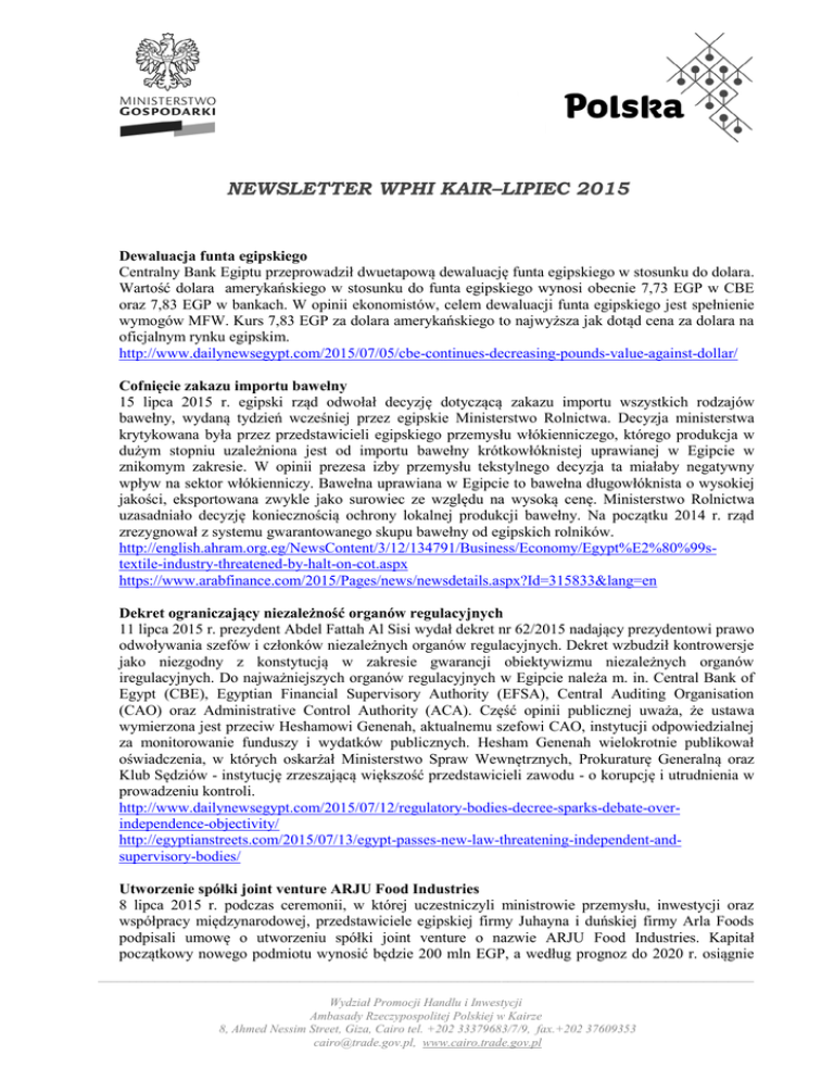 NEWSLETTER WPHI KAIR–LIPIEC 2015 Dewaluacja funta egipskiego Centralny Bank Egiptu przeprowadził dwuetapową dewaluację funta egipskiego w stosunku do dolara. Wartość dolara amerykańskiego w stosunku do funta egipskiego wynosi obecnie 7,73 EGP w CBE oraz 7,83 EGP w bankach. W opinii ekonomistów, celem dewaluacji funta egipskiego jest spełnienie wymogów MFW. Kurs 7,83 EGP za dolara amerykańskiego to najwyższa jak dotąd cena za dolara na oficjalnym rynku egipskim. http://www.dailynewsegypt.com/2015/07/05/cbe-continues-decreasing-pounds-value-against-dollar/ Cofnięcie zakazu importu bawełny 15 lipca 2015 r. egipski rząd odwołał decyzję dotyczącą zakazu importu wszystkich rodzajów bawełny, wydaną tydzień wcześniej przez egipskie Ministerstwo Rolnictwa. Decyzja ministerstwa krytykowana była przez przedstawicieli egipskiego przemysłu włókienniczego, którego produkcja w dużym stopniu uzależniona jest od importu bawełny krótkowłóknistej uprawianej w Egipcie w znikomym zakresie. W opinii prezesa izby przemysłu tekstylnego decyzja ta miałaby negatywny wpływ na sektor włókienniczy. Bawełna uprawiana w Egipcie to bawełna długowłóknista o wysokiej jakości, eksportowana zwykle jako surowiec ze względu na wysoką cenę. Ministerstwo Rolnictwa uzasadniało decyzję koniecznością ochrony lokalnej produkcji bawełny. Na początku 2014 r. rząd zrezygnował z systemu gwarantowanego skupu bawełny od egipskich rolników. http://english.ahram.org.eg/NewsContent/3/12/134791/Business/Economy/Egypt%E2%80%99stextile-industry-threatened-by-halt-on-cot.aspx https://www.arabfinance.com/2015/Pages/news/newsdetails.aspx?Id=315833&lang=en Dekret ograniczający niezależność organów regulacyjnych 11 lipca 2015 r. prezydent Abdel Fattah Al Sisi wydał dekret nr 62/2015 nadający prezydentowi prawo odwoływania szefów i członków niezależnych organów regulacyjnych. Dekret wzbudził kontrowersje jako niezgodny z konstytucją w zakresie gwarancji obiektywizmu niezależnych organów iregulacyjnych. Do najważniejszych organów regulacyjnych w Egipcie należa m. in. Central Bank of Egypt (CBE), Egyptian Financial Supervisory Authority (EFSA), Central Auditing Organisation (CAO) oraz Administrative Control Authority (ACA). Część opinii publicznej uważa, że ustawa wymierzona jest przeciw Heshamowi Genenah, aktualnemu szefowi CAO, instytucji odpowiedzialnej za monitorowanie funduszy i wydatków publicznych. Hesham Genenah wielokrotnie publikował oświadczenia, w których oskarżał Ministerstwo Spraw Wewnętrznych, Prokuraturę Generalną oraz Klub Sędziów - instytucję zrzeszającą większość przedstawicieli zawodu - o korupcję i utrudnienia w prowadzeniu kontroli. http://www.dailynewsegypt.com/2015/07/12/regulatory-bodies-decree-sparks-debate-overindependence-objectivity/ http://egyptianstreets.com/2015/07/13/egypt-passes-new-law-threatening-independent-andsupervisory-bodies/ Utworzenie spółki joint venture ARJU Food Industries 8 lipca 2015 r. podczas ceremonii, w której uczestniczyli ministrowie przemysłu, inwestycji oraz współpracy międzynarodowej, przedstawiciele egipskiej firmy Juhayna i duńskiej firmy Arla Foods podpisali umowę o utworzeniu spółki joint venture o nazwie ARJU Food Industries. Kapitał początkowy nowego podmiotu wynosić będzie 200 mln EGP, a według prognoz do 2020 r. osiągnie ________________________________________________________________________________________________________ Wydział Promocji Handlu i Inwestycji Ambasady Rzeczypospolitej Polskiej w Kairze 8, Ahmed Nessim Street, Giza, Cairo tel. +202 33379683/7/9, fax.+202 37609353 [email protected], www.cairo.trade.gov.pl wartość 100 mln euro. Projekt ma na celu zwiększenie potencjału produkcyjnego i dystrybucyjnego w zakresie produktów mleczarskich. Inwestycja wygeneruje ok. 100 bezpośrenich miejsc pracy. 51% udziałów w nowej firmie należy do firmy Juhayna, a 49% - do firmy Arla Foods. http://www.egyptindependent.com//news/juhayna-arla-foods-partnership-agreement Umowy z firmą Rosneft na dostawę gazu Egipskie Ministerstwo Ropy Naftowej potwierdziło podpisanie dwóch wstępnych umów z rosyjską firmą Rosneft na dostawę produktów naftowych oraz 24 dostaw skroplonego gazu ziemnego dla rządowej firmy Egyptian Natural Gas Holding Company /EGAS/. Dostawy realizowane będą w okresie dwóch lat począwszy od czwartego kwartału 2015 r. Według oświadczenia firmy Rosneft, umowy będą wstępem do zwiększenia jej obecności na egipskim rynku gazu. Rosneft planuje również dostawę do Egiptu płynnego gazu LPG. http://www.egyptindependent.com//news/update-egypt-signs-energy-import-deals-russia-s-rosneft Wprowadzenie zamówień bezpośrednich na import artykułów spożywczych Według wypowiedzi egipskiego ministra zaopatrzenia z dnia 12 lipca 2015 r., egipski rząd nie będzie organizował nowych przetargów na import oleju, mięsa, mrożonego drobiu oraz owoców i warzyw. Produkty te importowane będą poprzez umowy o zamówieniach bezpośrednich w celu uniknięcia pośredników i zmniejszenia kosztów. http://af.reuters.com/article/investingNews/idAFKCN0PM0A520150712 Sprzedaż europejskich modeli samochodów na egipskim rynku Wartość sprzedaży europejskich modeli samochodów osobowych na egipskim rynku w ciągu pierwszych pięciu miesięcy 2015 r. wyniosła 2,7 mld EGP. Dla porównania, całkowita wartość samochodów sprzedanych na egipskim rynku w analizowanym okresie wyniosła 12 mld EGP. Sprzedano 13.200 europejskich modeli samochodów, co stanowi 17,2% egipskiego rynku samochodów osobowych /76.700 egzemplarzy/. Najpopularniejszym modelem była Škoda Octavia – 3.195 sprzedanych samochodów /6,6 mln EGP/. Na kolejnych miejscach uplasowały się kolejno: Renault Logan‘s 1.145 sprzedanych samochodów /105 mln EGP/ oraz Opel Astra – 949 samochodów /166 mln EGP/. https://www.arabfinance.com/2015/pages/news/newsdetails.aspx?Id=315612&lang=en W