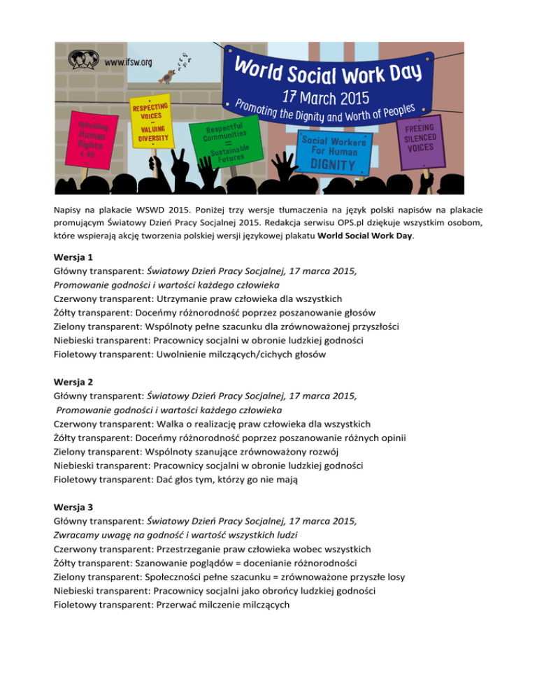 Napisy na plakacie WSWD 2015. Poniżej trzy wersje tłumaczenia na język polski napisów na plakacie promującym Światowy Dzień Pracy Socjalnej 2015. Redakcja serwisu OPS.pl dziękuje wszystkim osobom, które wspierają akcję tworzenia polskiej wersji językowej plakatu World Social Work Day. Wersja 1 Główny transparent: Światowy Dzień Pracy Socjalnej, 17 marca 2015, Promowanie godności i wartości każdego człowieka Czerwony transparent: Utrzymanie praw człowieka dla wszystkich Żółty transparent: Doceńmy różnorodność poprzez poszanowanie głosów Zielony transparent: Wspólnoty pełne szacunku dla zrównoważonej przyszłości Niebieski transparent: Pracownicy socjalni w obronie ludzkiej godności Fioletowy transparent: Uwolnienie milczących/cichych głosów Wersja 2 Główny transparent: Światowy Dzień Pracy Socjalnej, 17 marca 2015, Promowanie godności i wartości każdego człowieka Czerwony transparent: Walka o realizację praw człowieka dla wszystkich Żółty transparent: Doceńmy różnorodność poprzez poszanowanie różnych opinii Zielony transparent: Wspólnoty szanujące zrównoważony rozwój Niebieski transparent: Pracownicy socjalni w obronie ludzkiej godności Fioletowy transparent: Dać głos tym, którzy go nie mają Wersja 3 Główny transparent: Światowy Dzień Pracy Socjalnej, 17 marca 2015, Zwracamy uwagę na godność i wartość wszystkich ludzi Czerwony transparent: Przestrzeganie praw człowieka wobec wszystkich Żółty transparent: Szanowanie poglądów = docenianie różnorodności Zielony transparent: Społeczności pełne szacunku = zrównoważone przyszłe losy Niebieski transparent: Pracownicy socjalni jako obrońcy ludzkiej godności Fioletowy transparent: Przerwać milczenie milczących